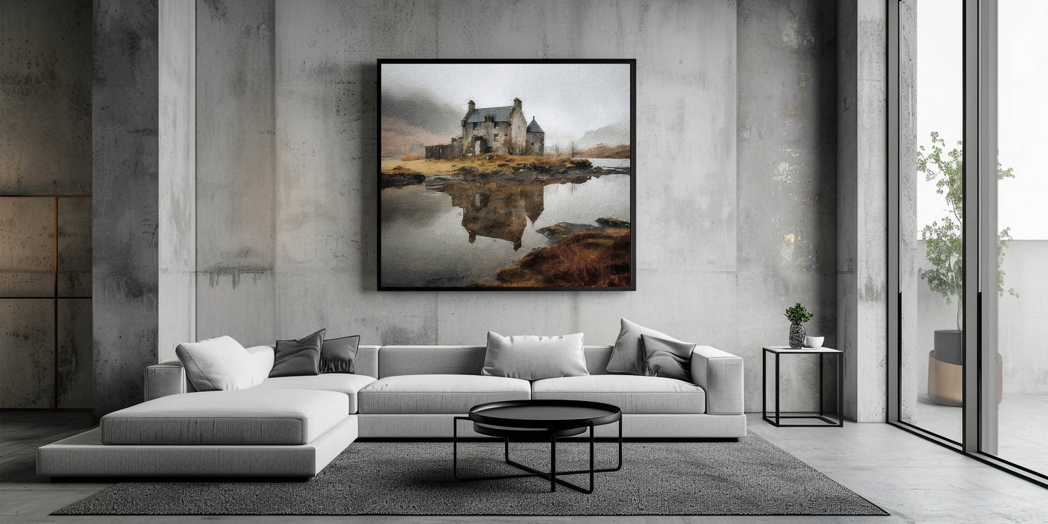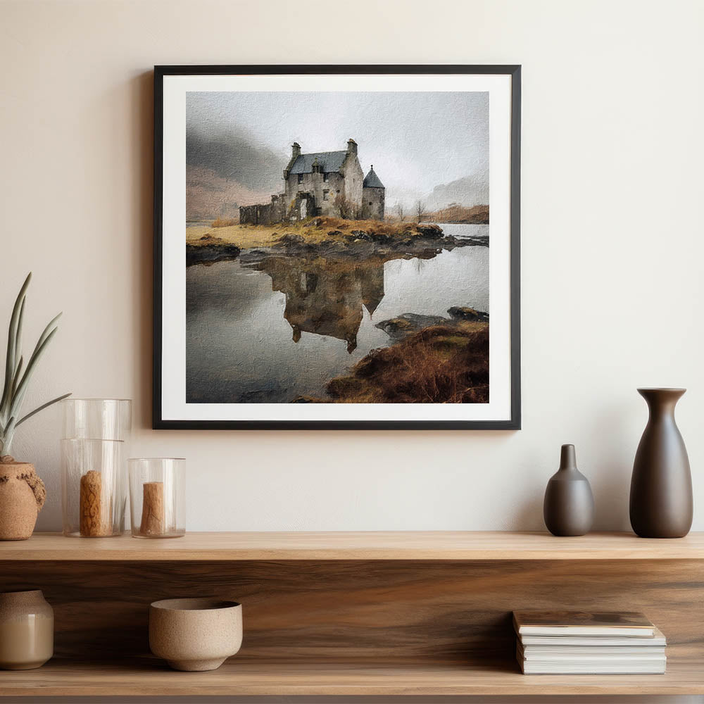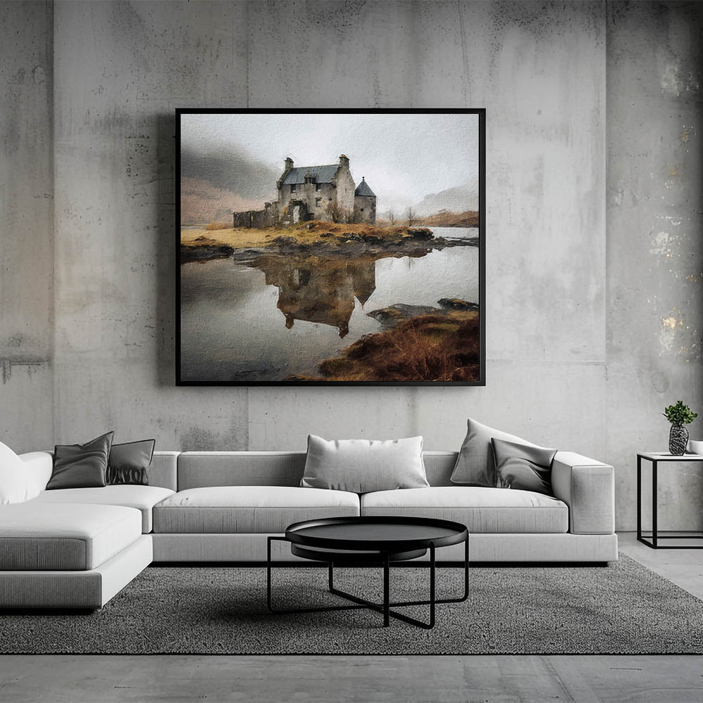 Capture the mysterious beauty of the countryside with this stunning wall art of a medieval castle reflected in calm waters. The stone structure stands isolated, surrounded by mist and rugged terrain, evoking a sense of history and serenity. Perfect for those who appreciate rustic, vintage, or historic decor elements, this artwork adds an intriguing focal point to any room.
