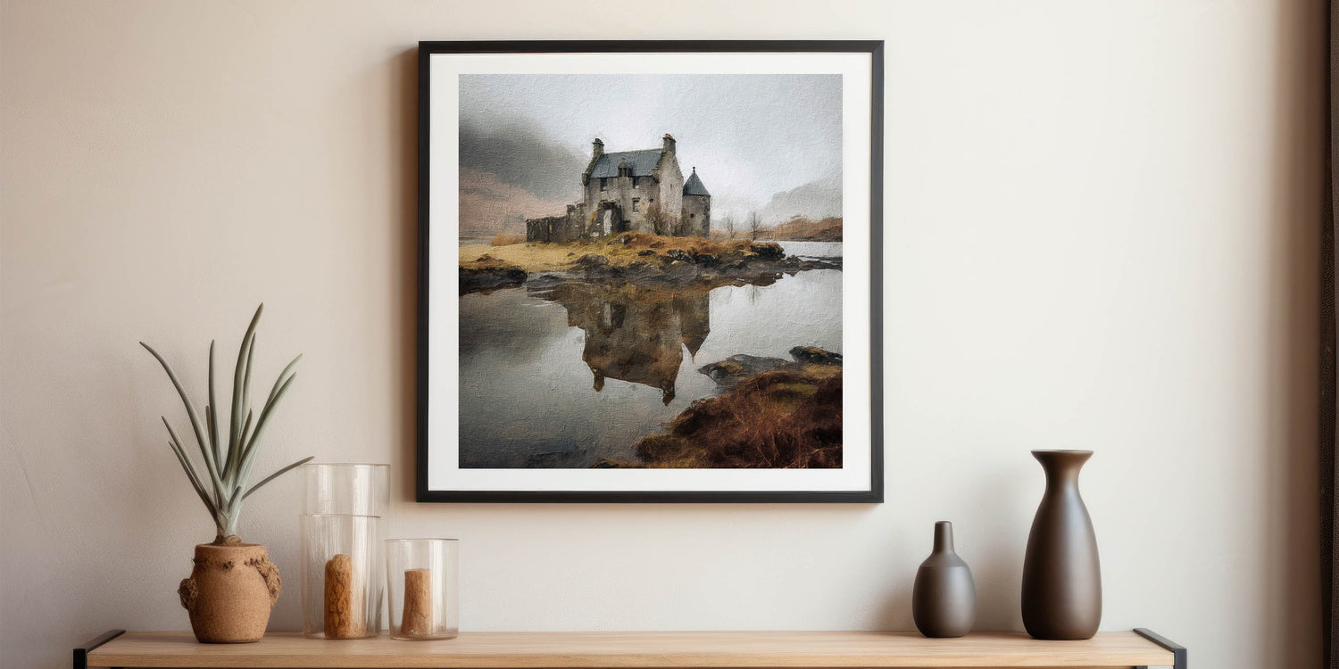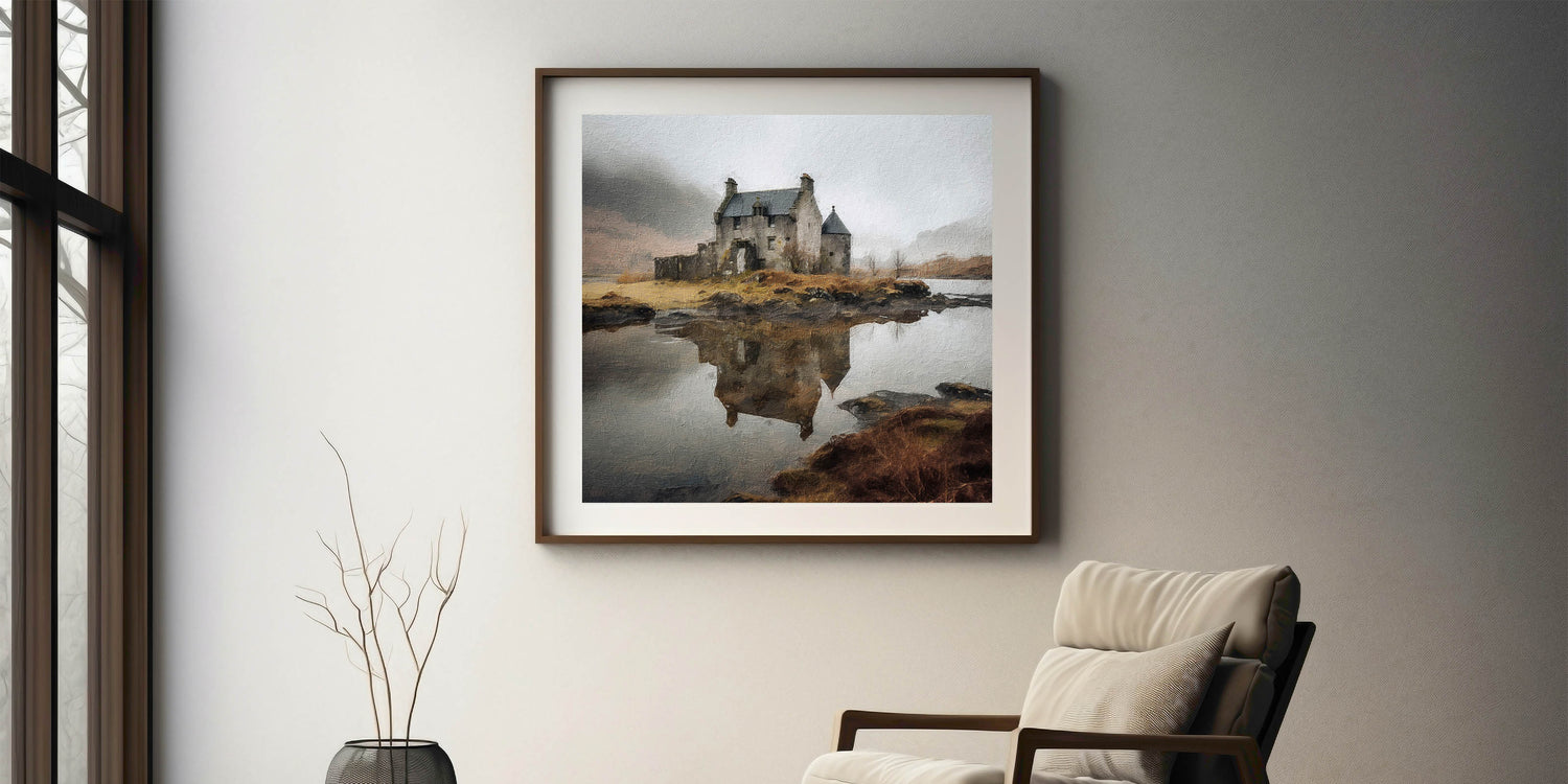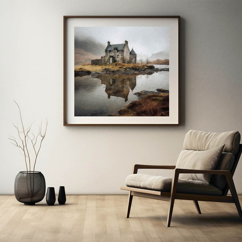 Capture the mysterious beauty of the countryside with this stunning wall art of a medieval castle reflected in calm waters. The stone structure stands isolated, surrounded by mist and rugged terrain, evoking a sense of history and serenity. Perfect for those who appreciate rustic, vintage, or historic decor elements, this artwork adds an intriguing focal point to any room.