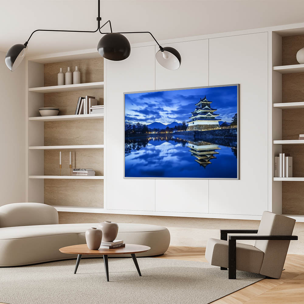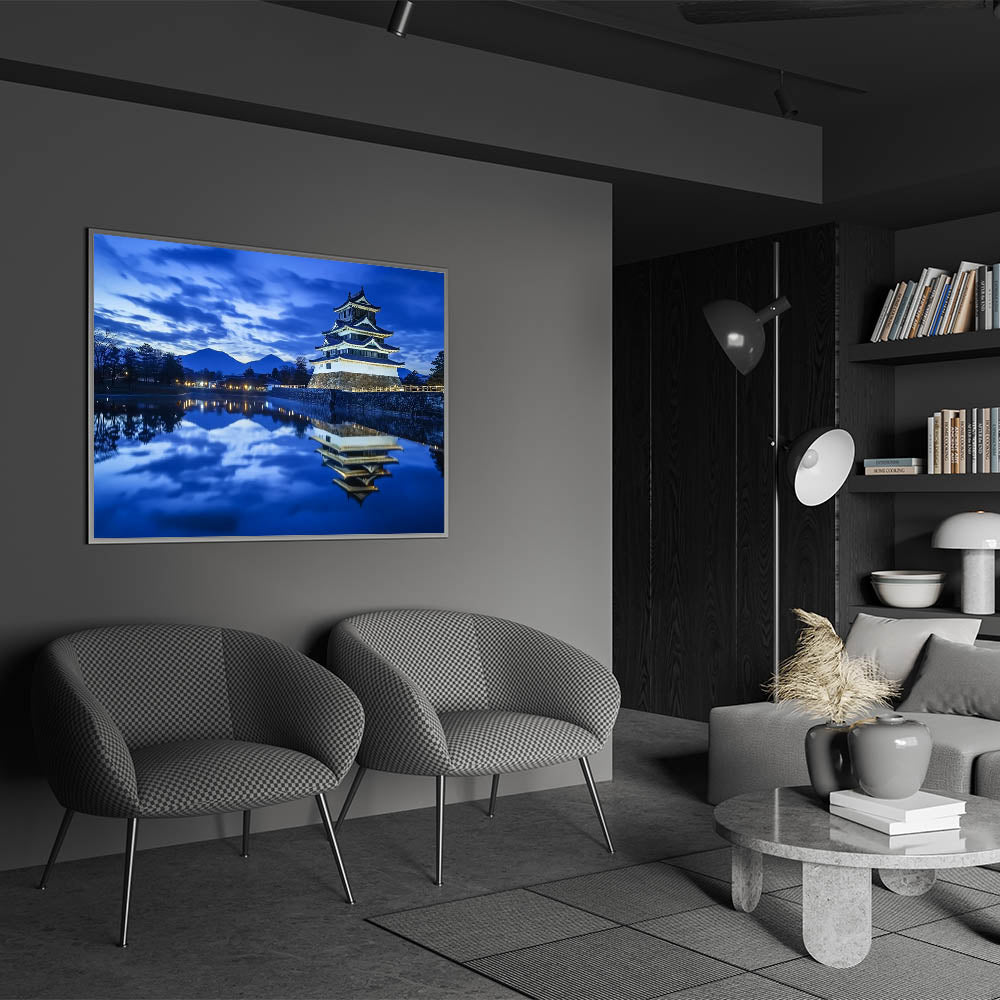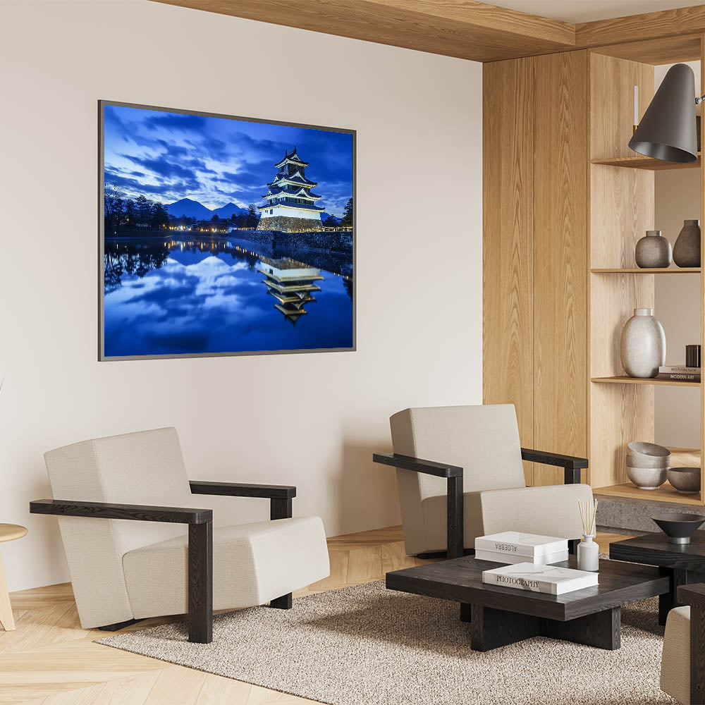 Immerse yourself in the serene beauty of this reflected castle wall art, featuring a traditional castle illuminated against a stunning twilight backdrop. Perfectly mirrored in the calm waters, this artwork exudes tranquility and sophistication. The deep blue tones of the sky and water create a harmonious palette that elevates any space. This masterpiece captures the timeless charm of historic architecture and the peace of natural surroundings.