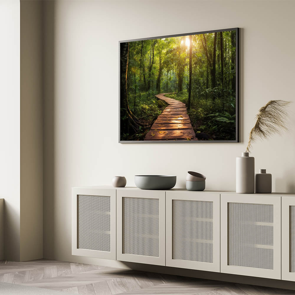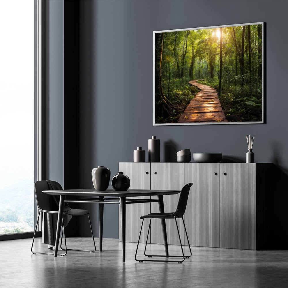 Step into a world of peace and natural beauty with this tranquil forest path wall art. The image captures a serene wooden walkway meandering through a lush, green forest, bathed in the soft glow of sunlight filtering through the trees. This artwork is perfect for those who find solace in nature and wish to bring the calming effect of a forest stroll into their living spaces. The detailed textures of the wooden path and the vibrant greens of the forest create a soothing and inviting atmosphere.
