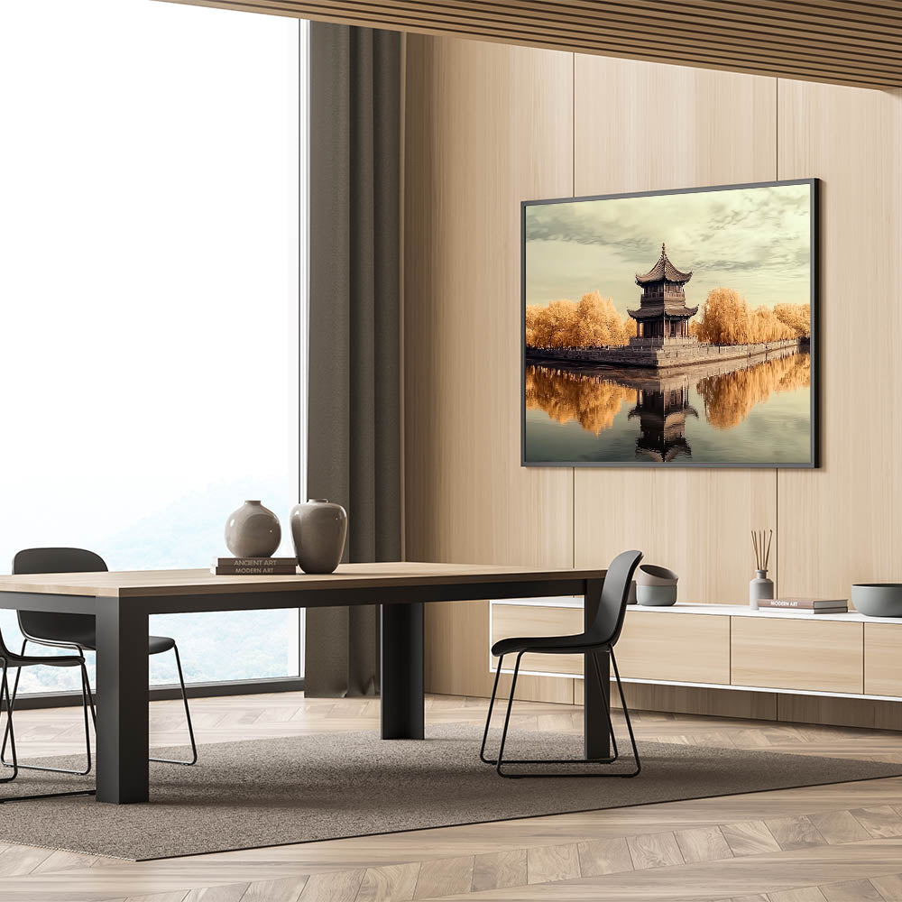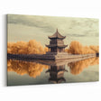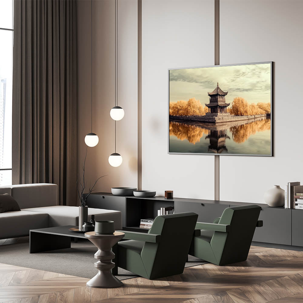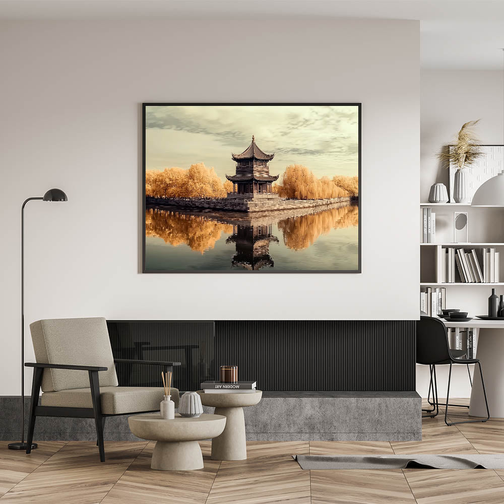 Discover the serene beauty of this tranquil pavilion print, featuring a stunning traditional structure perfectly mirrored on calm waters. Surrounded by golden-hued trees, this breathtaking artwork embodies harmony and elegance, making it an ideal centerpiece for your decor.