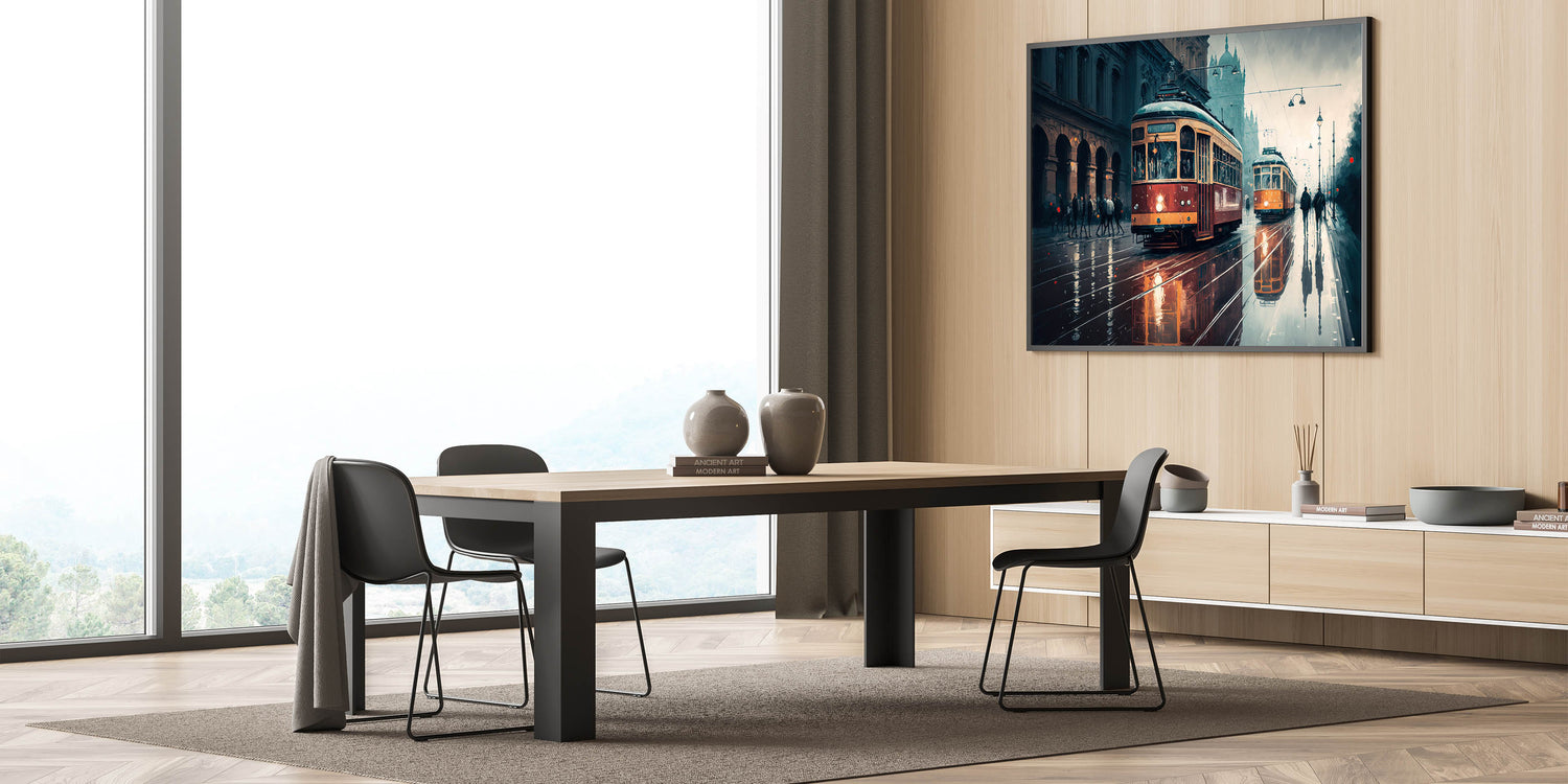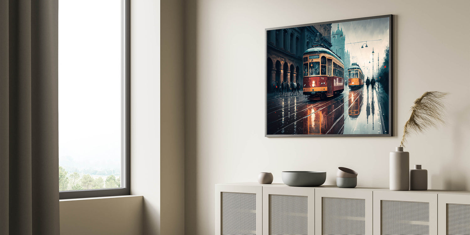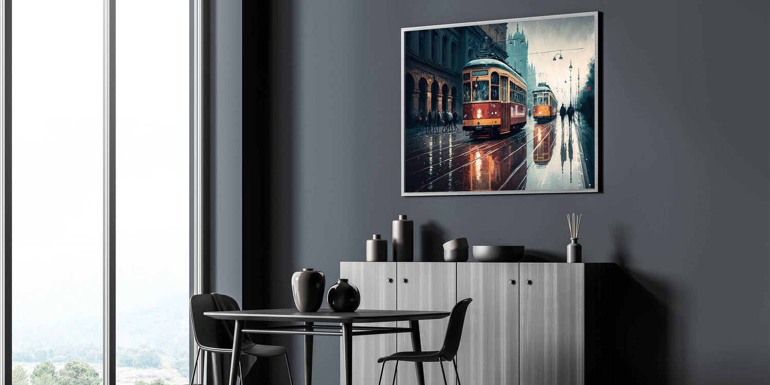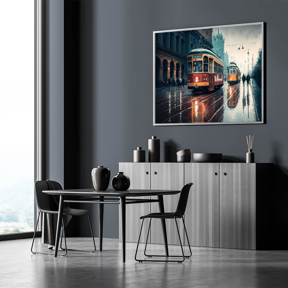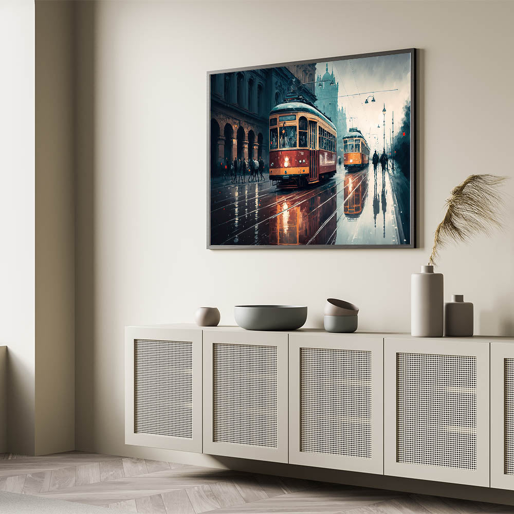- Artistic Depictions of Service Vehicles: The vintage trams, beautifully rendered in a rainy urban setting, bring a touch of nostalgia and a sense of movement to your space.