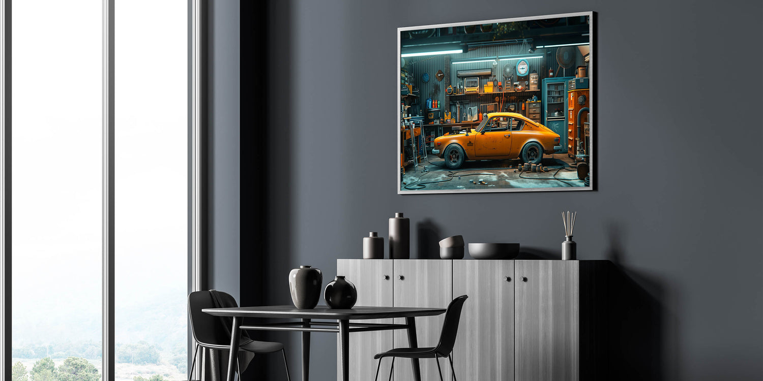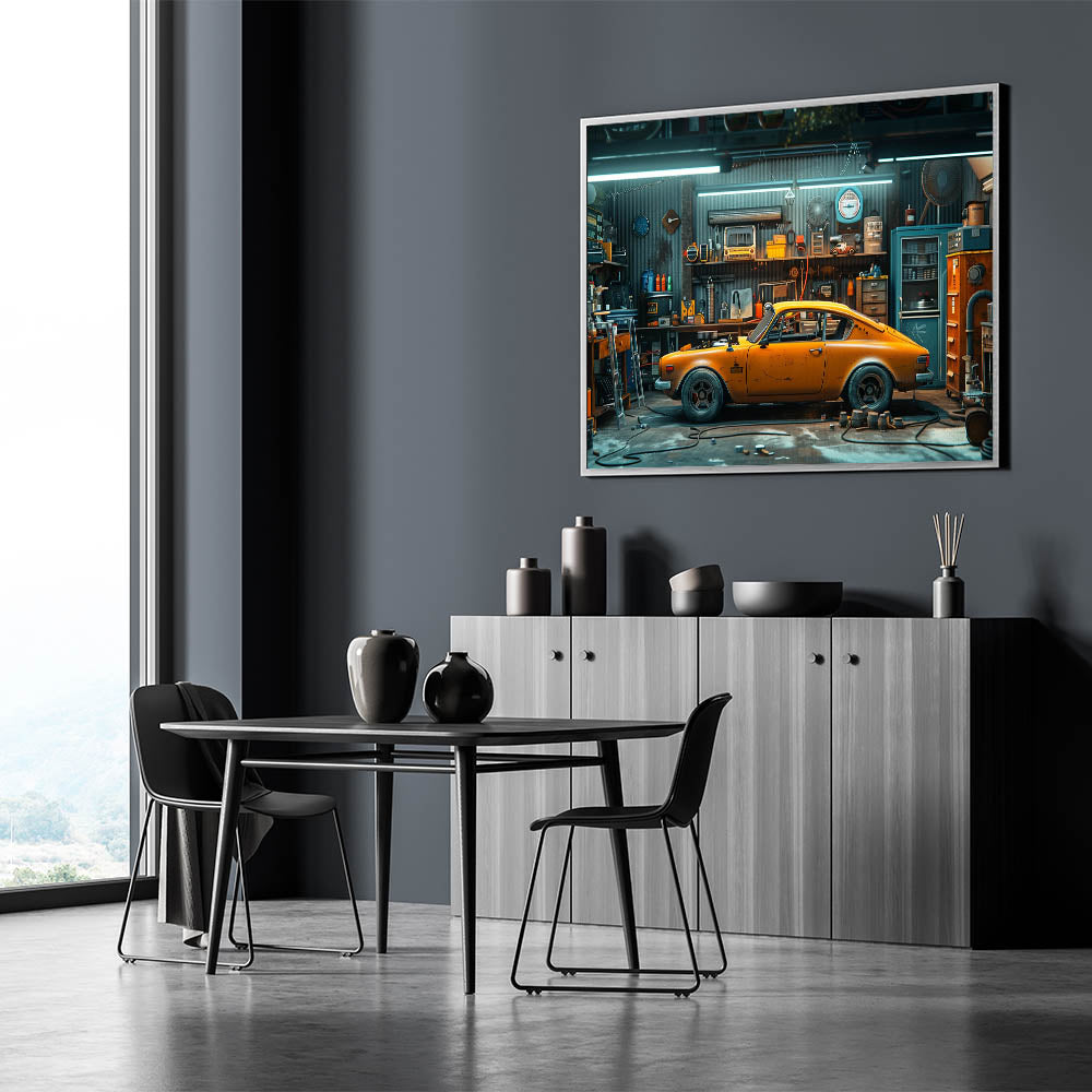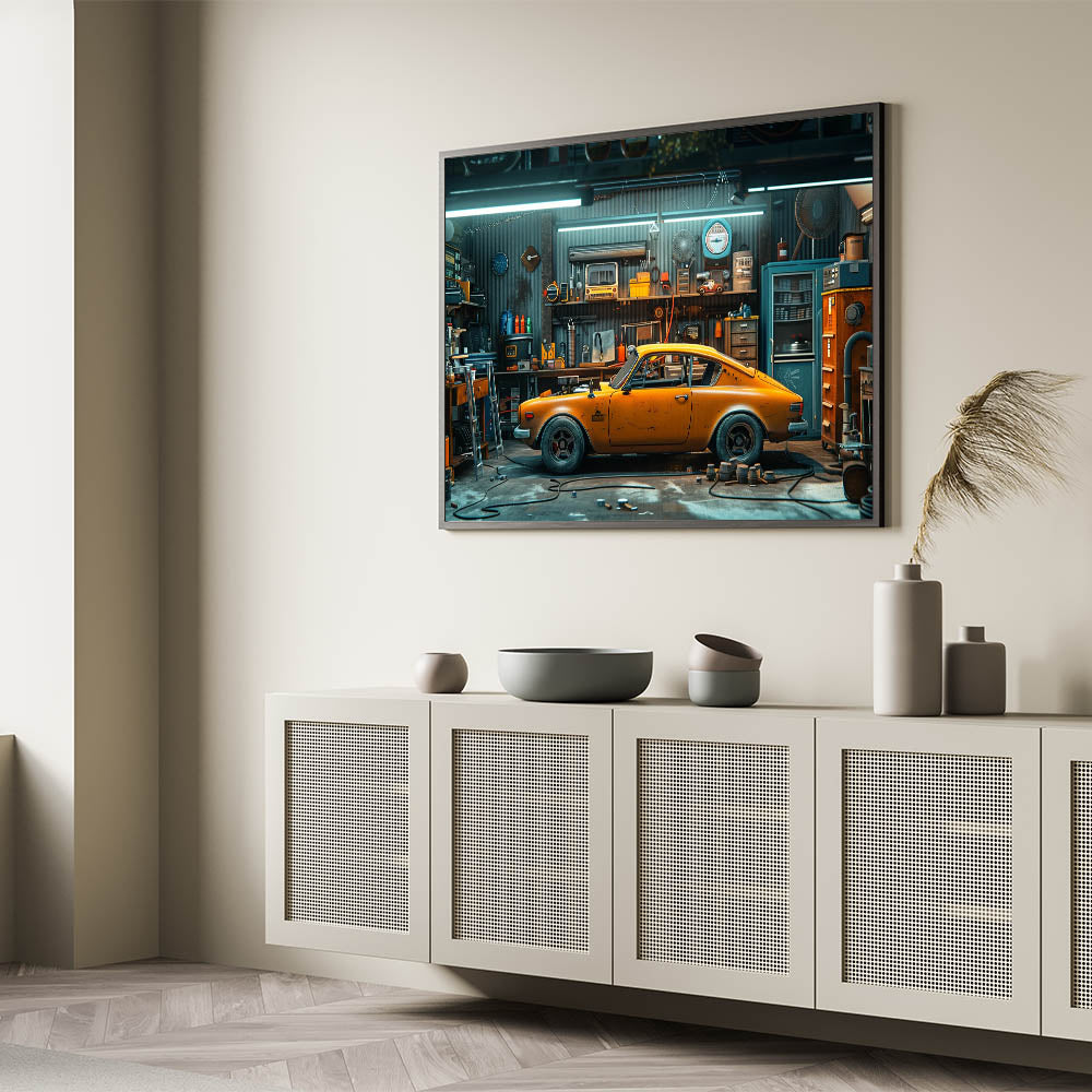 Step into a world of nostalgia with this captivating vintage car wall art, set in a retro garage filled with classic automotive tools and memorabilia. The vibrant yellow car contrasts beautifully against the rich textures and warm lighting of the garage, creating a scene that is both detailed and atmospheric. Perfect for car enthusiasts and those who appreciate retro style, this artwork brings a sense of history and character to any space.