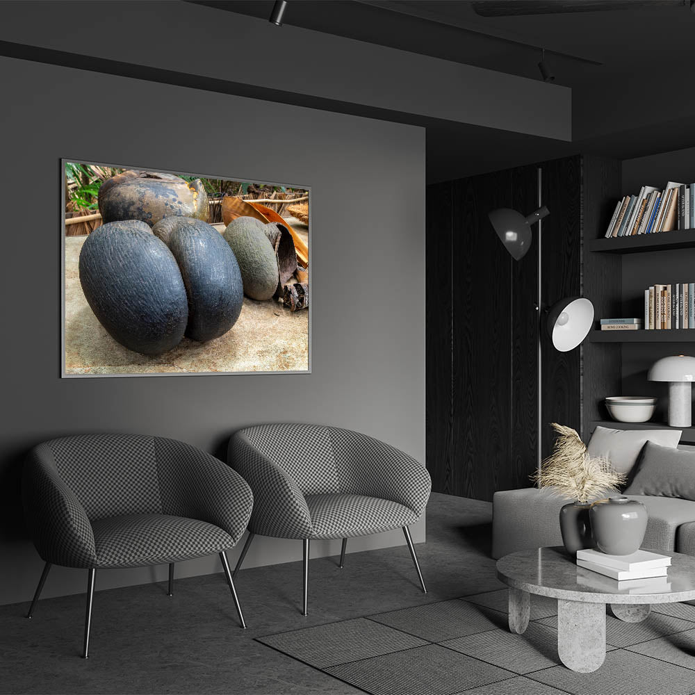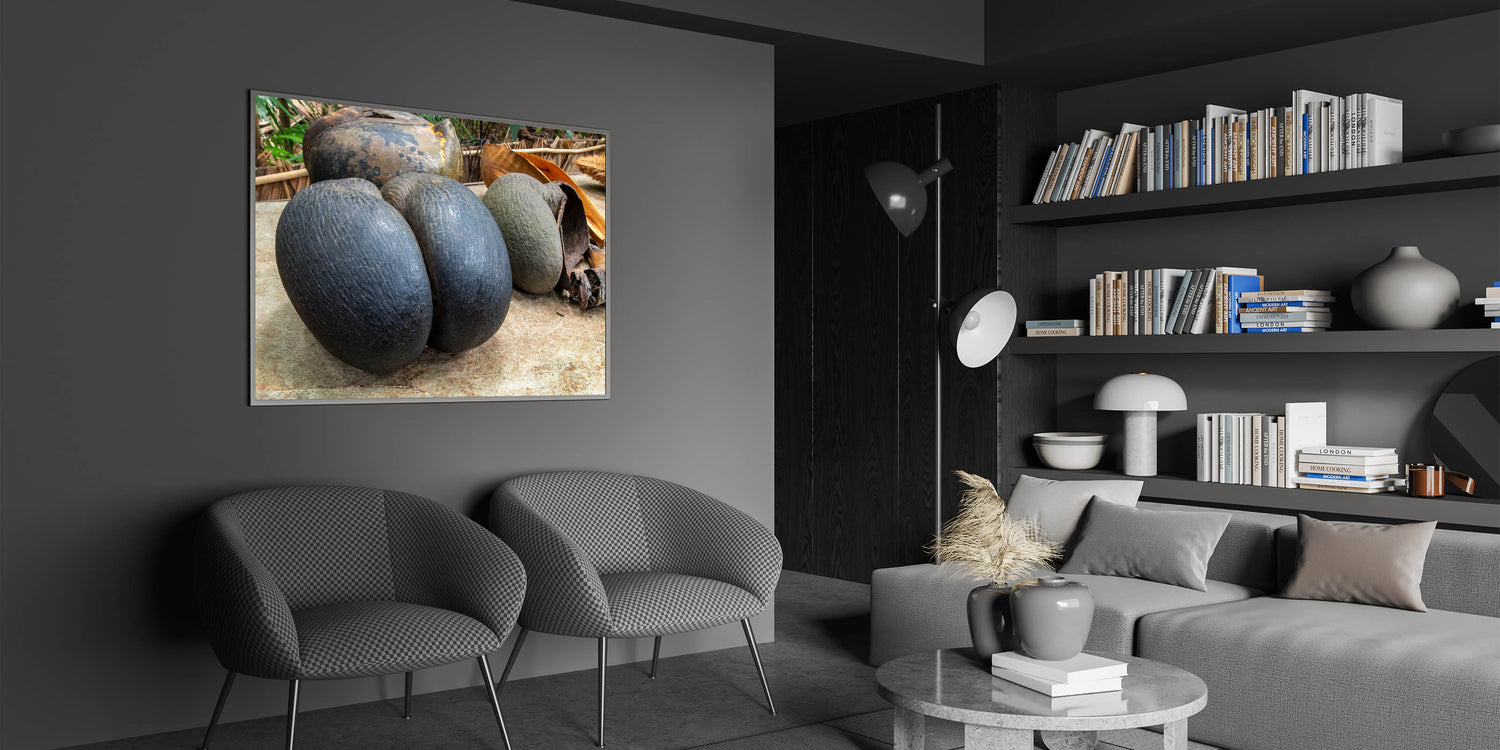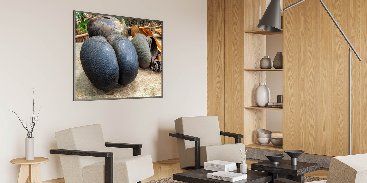 Celebrate the uniqueness of Seychelles with this striking wall art featuring the coco de mer, one of the island's most iconic natural wonders. This exotic coconut, known for its distinctive shape and rarity, is beautifully captured in this detailed photography print, making it a standout piece for nature enthusiasts and those who appreciate rare tropical treasures.