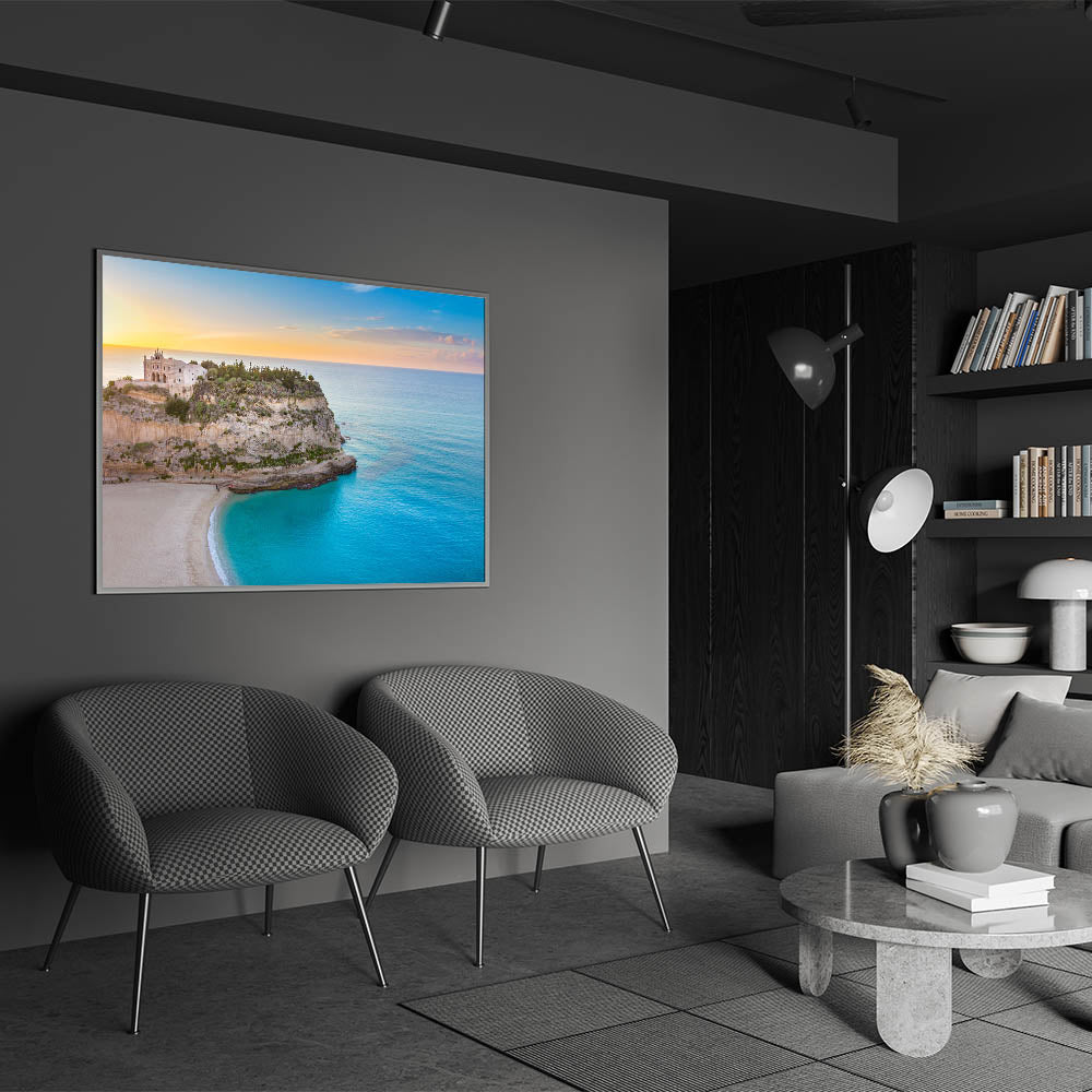 This captivating Sicily wall art captures the serene beauty of a cliffside monastery overlooking the crystal-clear waters of the Mediterranean. The scene showcases a peaceful blend of natural and architectural beauty, with the soft colors of the sea and sky contrasting against the ancient stone structure perched atop the cliffs. This artwork transports you to the tranquil shores of Sicily, making it a perfect addition to any space seeking a touch of Mediterranean elegance.