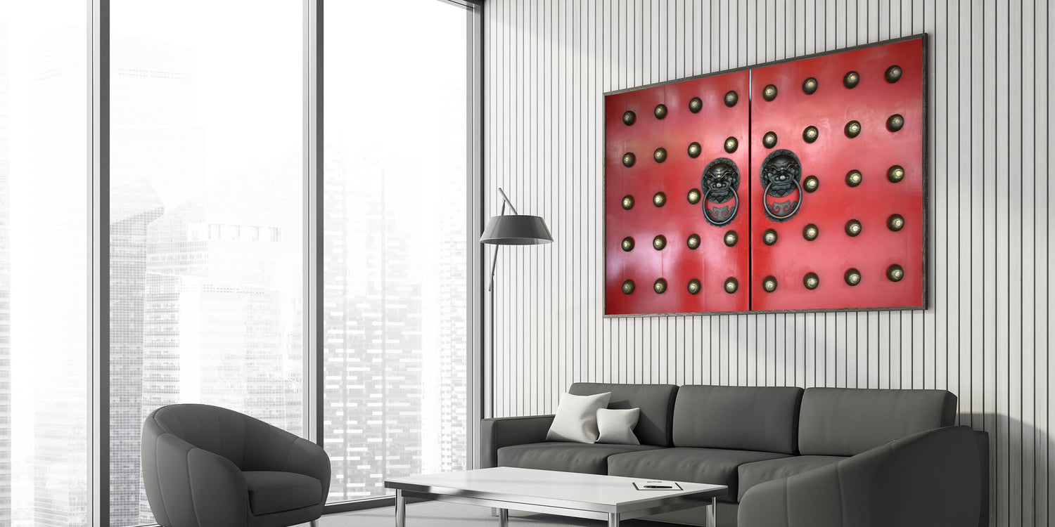 Modern Singapore Cityscape Decor – Red Door Lion Handles Wall Art