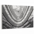 This striking city skyline wall art captures the breathtaking view of a modern skyscraper, looking up from the ground, with a plane soaring overhead. The black-and-white composition adds a timeless elegance, making it a perfect centerpiece for any room. This architectural art print emphasizes the sleek curves and intricate details of the building's facade, creating a captivating visual experience that embodies the essence of modern skyscraper photography.