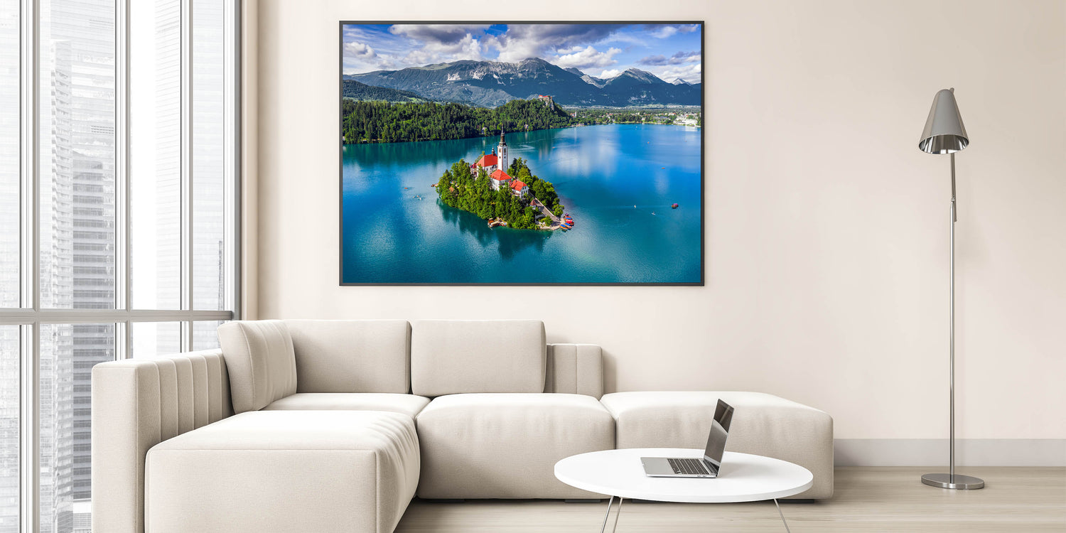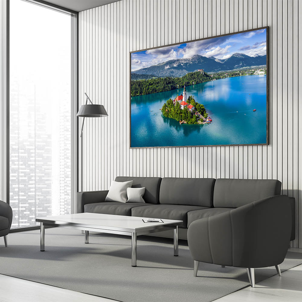 Discover the serene beauty of Slovenia’s iconic Lake Bled with this captivating aerial view wall art. Featuring the picturesque church on Bled Island set amidst deep turquoise waters and surrounded by lush green forests, this piece is a perfect representation of Slovenia’s natural charm. Ideal for bringing a slice of European elegance into your home, this high-quality Slovenia wall art adds a touch of scenic beauty to any decor.