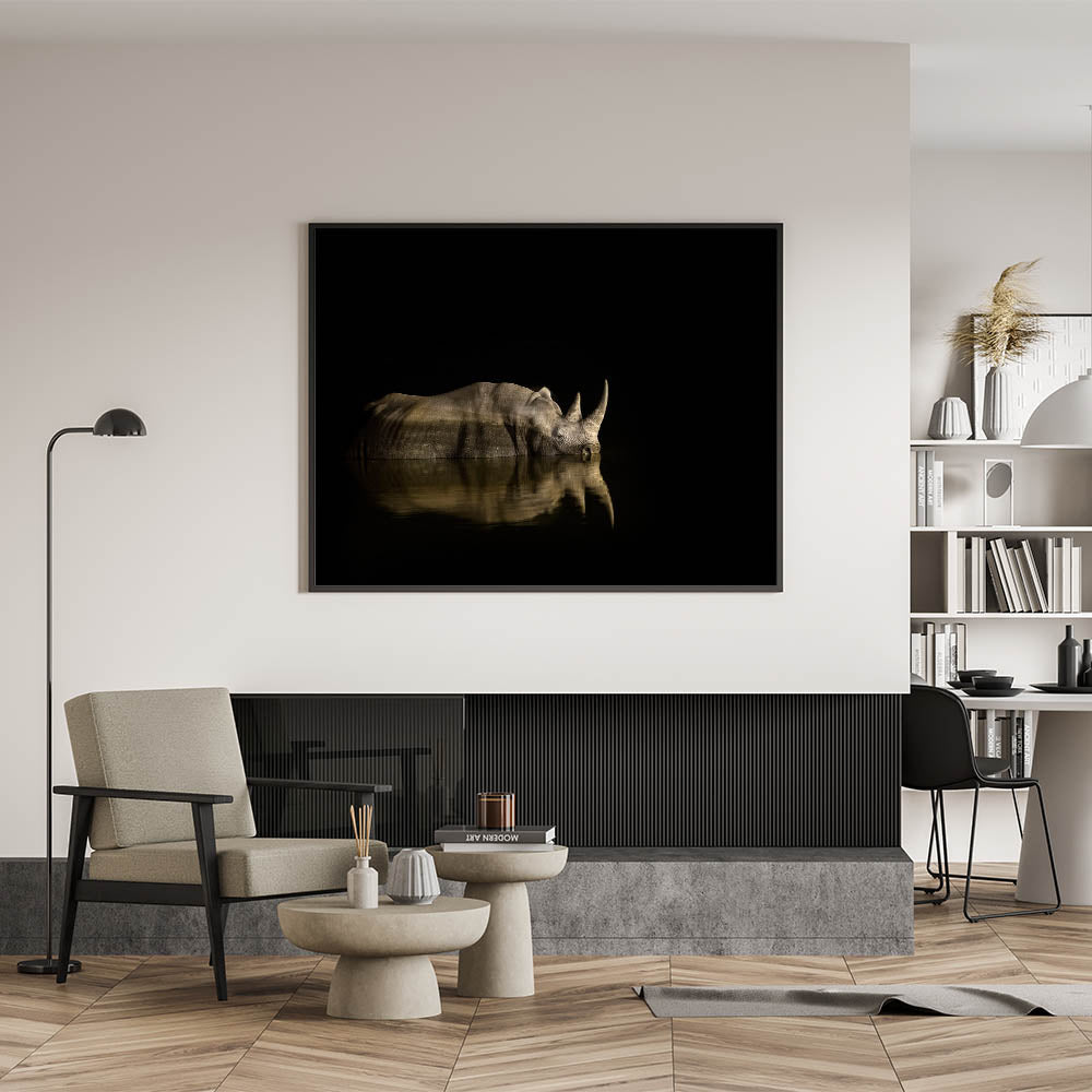 This captivating wall art features a majestic rhinoceros standing still in the quiet of night, beautifully captured in a low-light setting. The play of shadows on the rhino’s body and its reflection in the water creates an intriguing and powerful image that showcases the strength and grace of South African wildlife. Perfect for anyone looking to add a unique and striking piece of nature-inspired art to their decor.