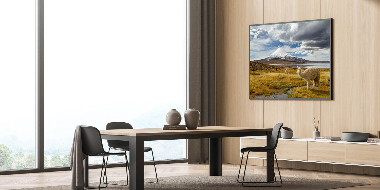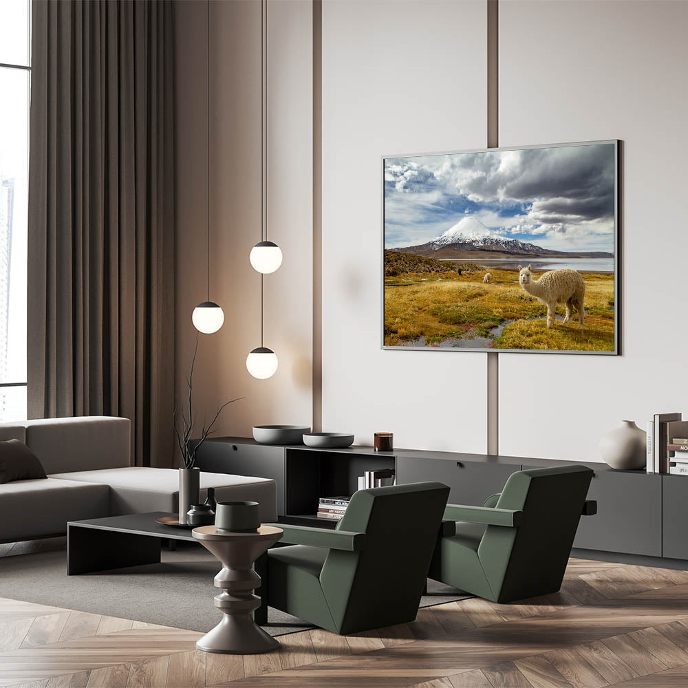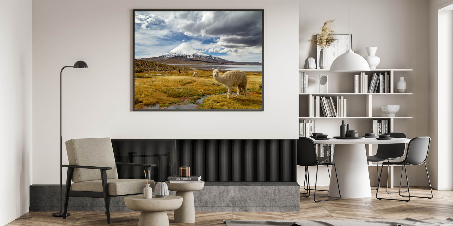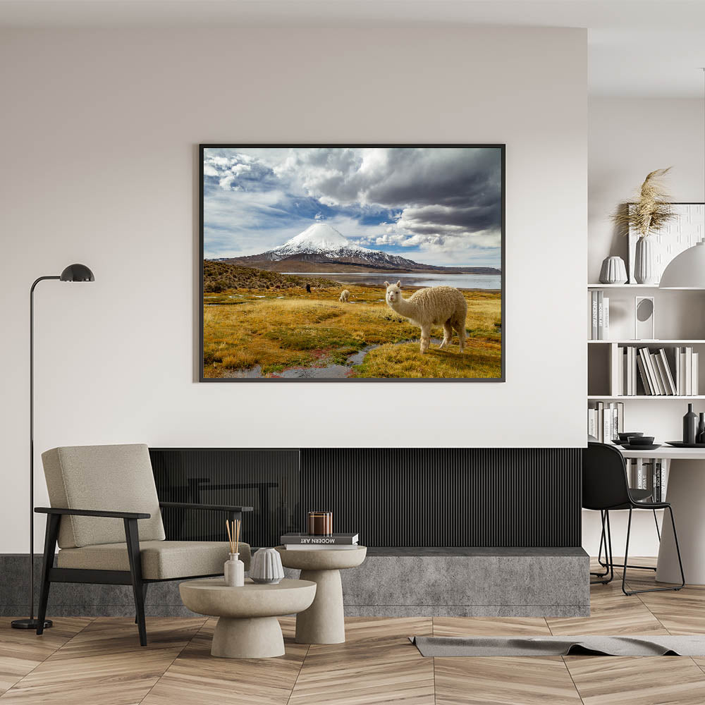 Bring a piece of the Atacama Desert wall decor into your home with this stunning depiction of alpacas grazing in front of Chile’s Andean mountains. The peaceful scene and natural beauty make it a perfect addition to any room that needs a calming, nature-inspired focal point.