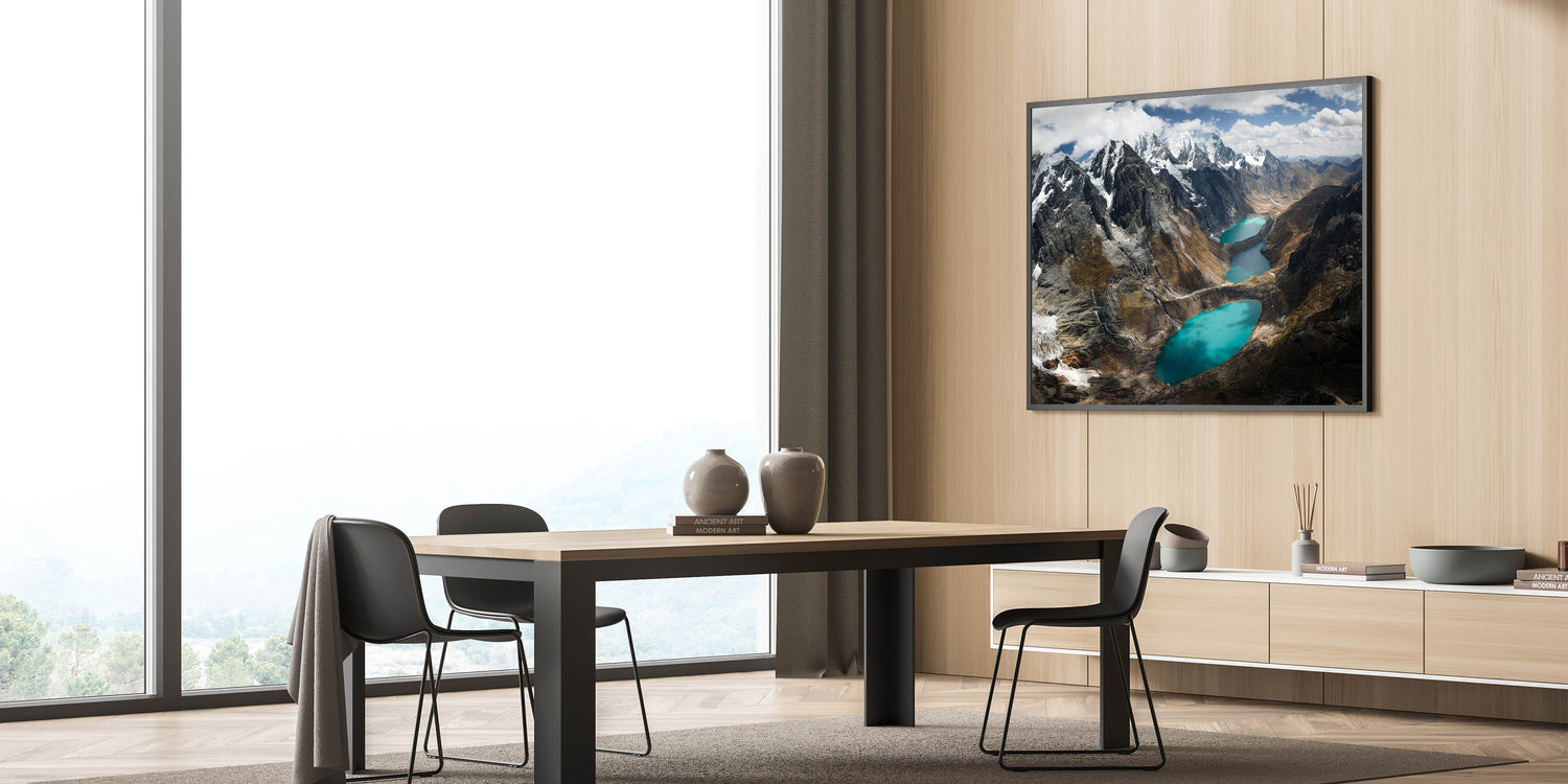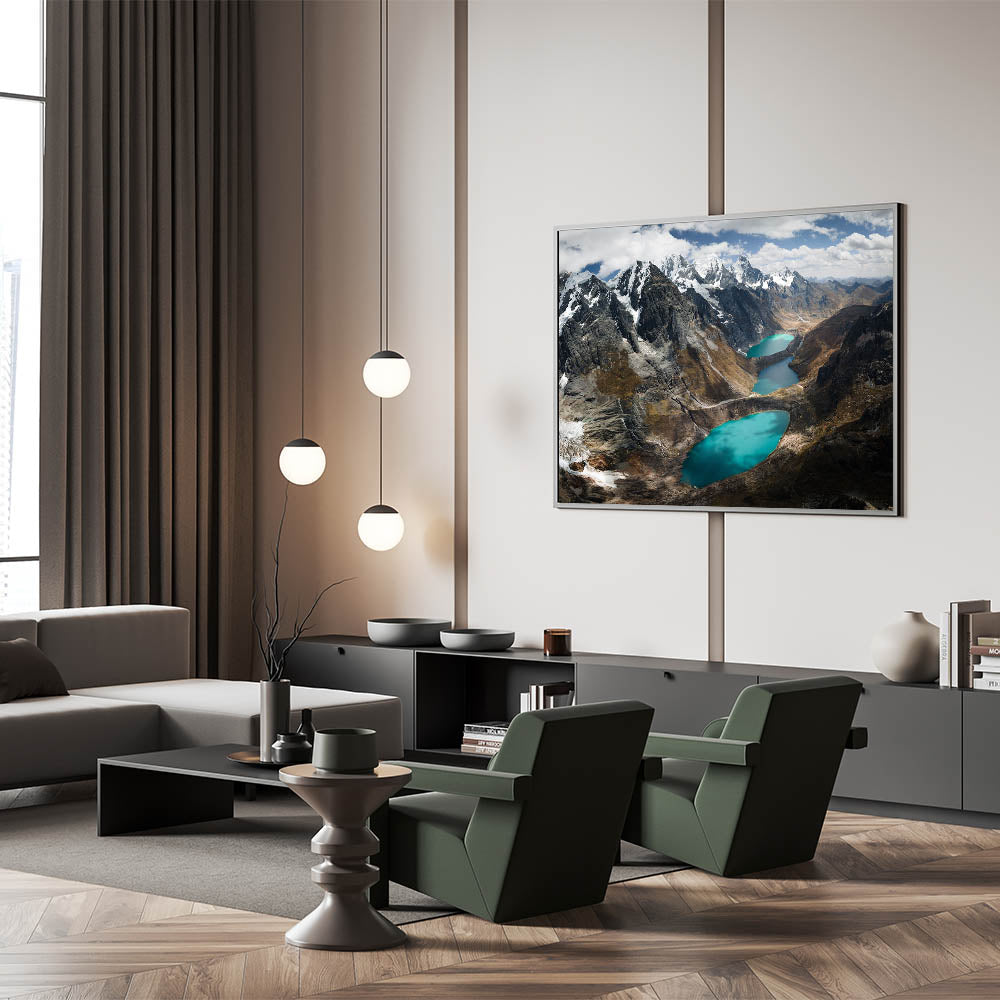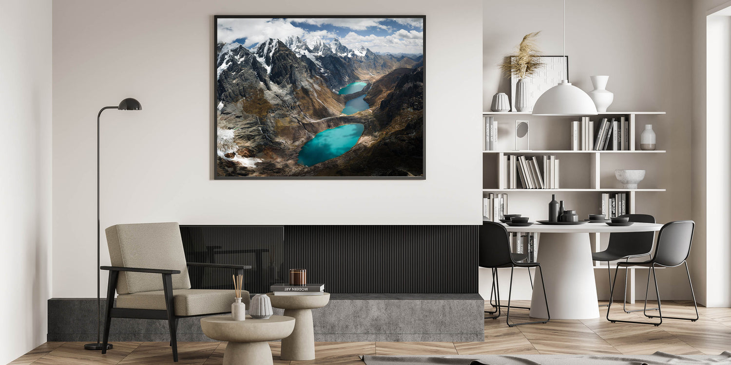 Experience the serene grandeur of the "Glacial Lakes of the Peruvian Andes Canvas Art." This striking piece showcases the awe-inspiring beauty of Peru’s high-altitude lakes, nestled among rugged mountains under a vast, cloud-strewn sky.