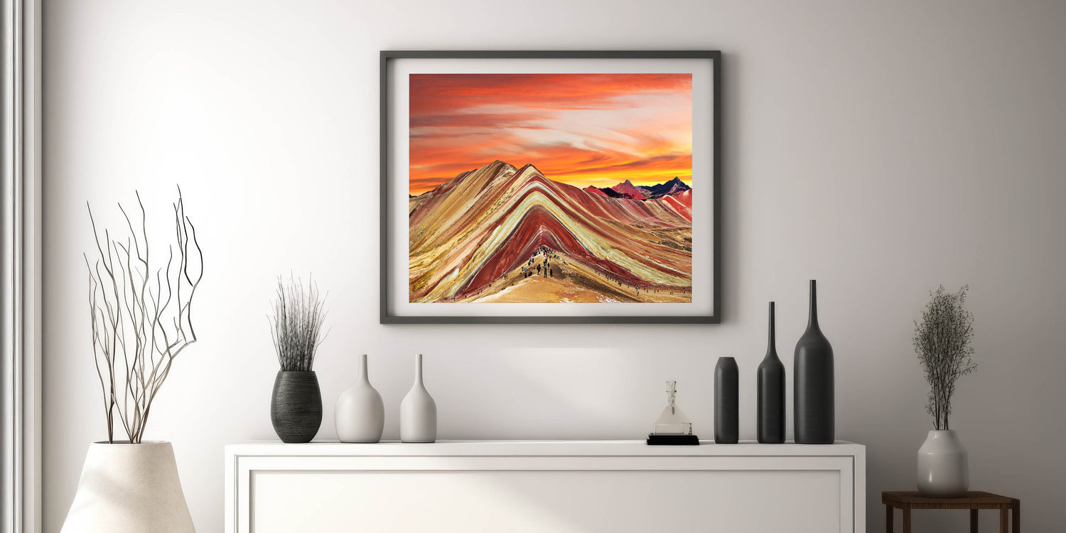 Immerse yourself in the spectacular beauty of Peru's Rainbow Mountain with our "Rainbow Mountain Sunset Trek Art." This print captures the iconic, multicolored geological wonder under a breathtaking sunset sky, offering a vibrant and inspiring addition to any space.
