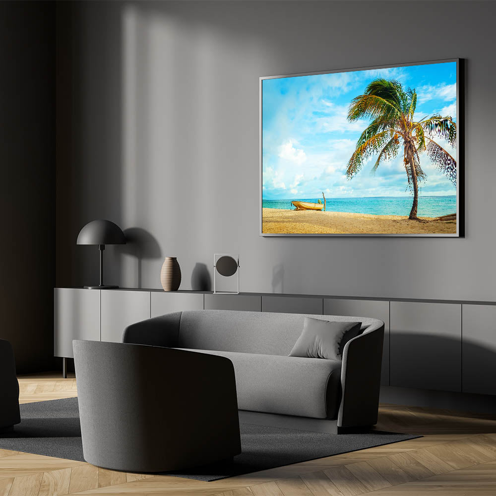 • Tropical elegance: The vibrant blues of the ocean and sky combined with the soft sand and greenery create a relaxing atmosphere in any room.
