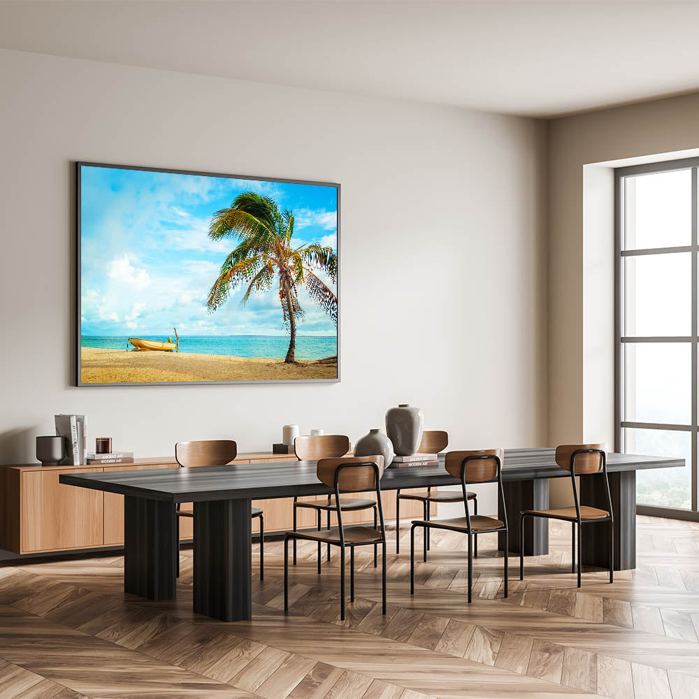 Enhance your space with this beautiful Venezuelan landscape print featuring a tranquil tropical beach scene. This artwork, part of the "Venezuela Scenery by Region Collection," captures a serene beach setting with a lone palm tree swaying above the golden sands and a boat resting by the shore. It's a perfect piece for adding a calm, coastal touch to your home or office.