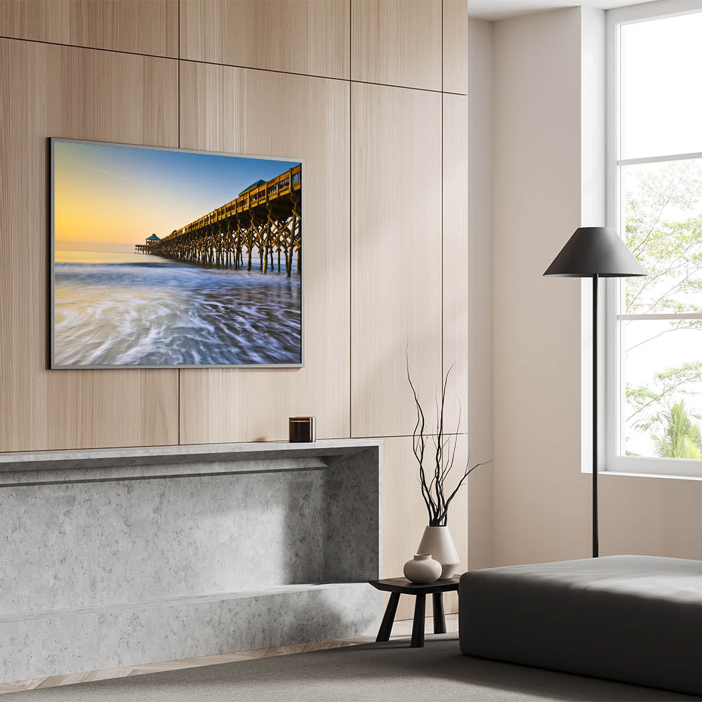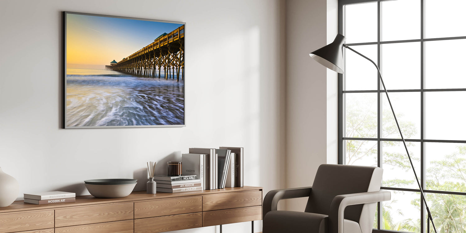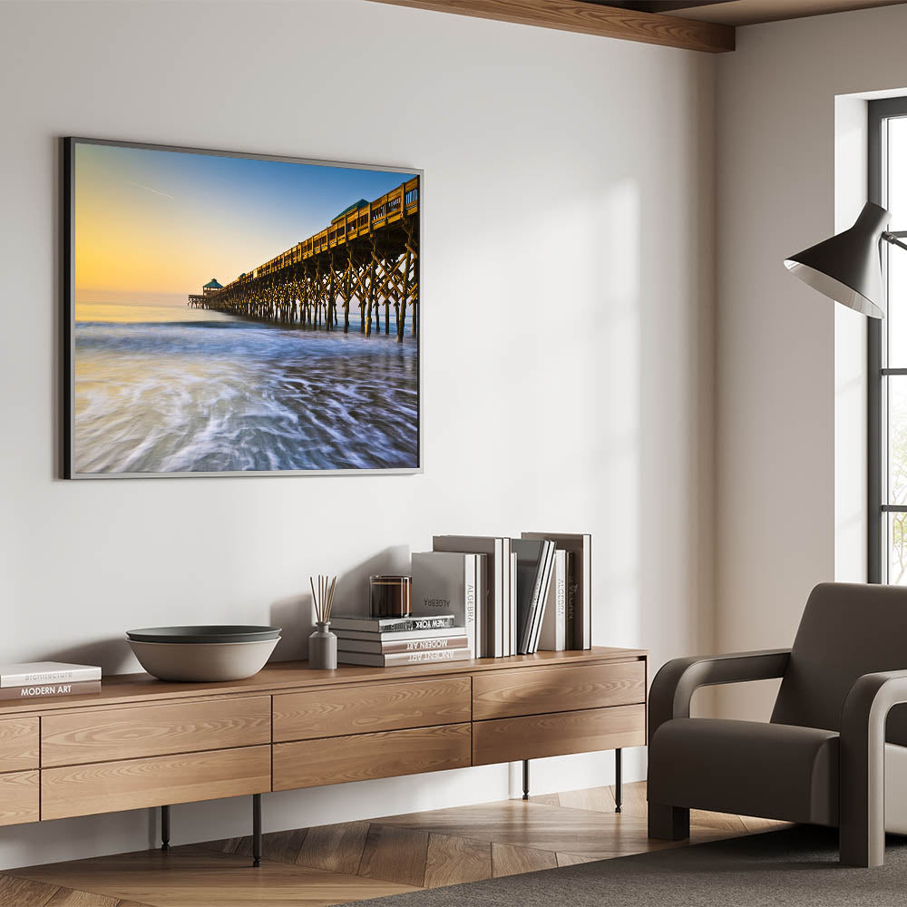 Immerse yourself in the scenic beauty of Charleston with this captivating art print of the Folly Beach Pier at sunset. This stunning piece of Charleston SC art captures the tranquil charm of the Lowcountry, showcasing the iconic pier against a backdrop of warm, glowing hues as the sun sets over the ocean. Perfect for anyone who loves the serenity and elegance of coastal views, this print makes an excellent addition to your home or office decor.