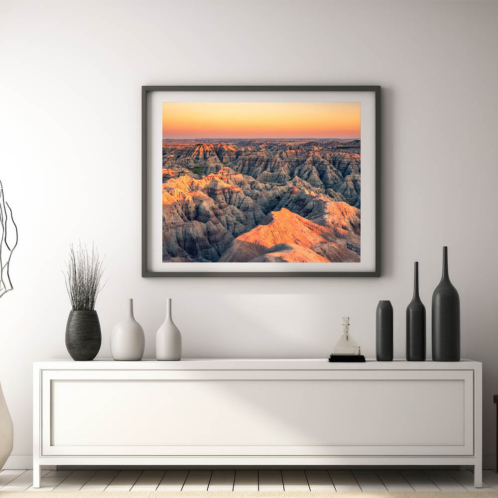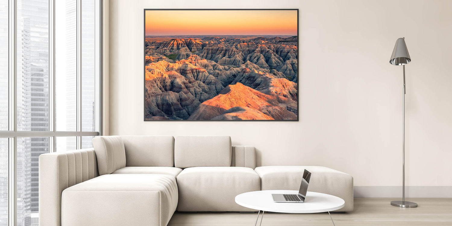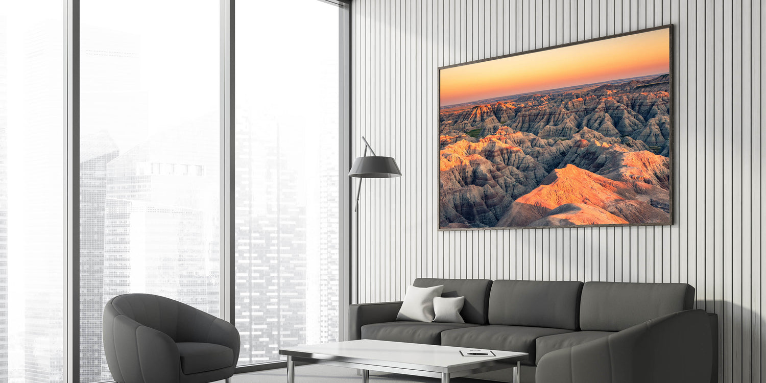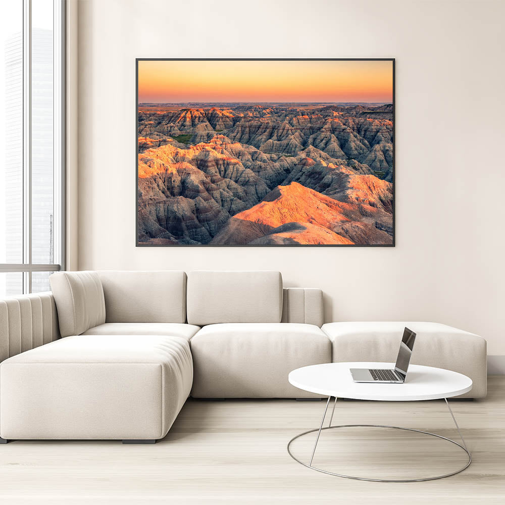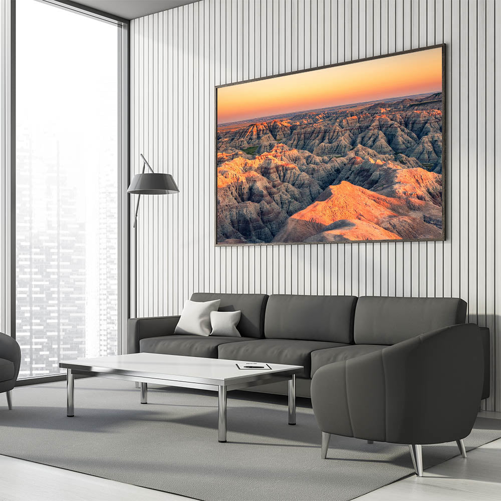 Transform your space with this striking wall art featuring a mesmerizing sunset over the rugged terrain of Badlands National Park. This stunning scene captures the soft, golden light of the setting sun as it casts long shadows across the unique rock formations of South Dakota's most iconic landscape. The contrasting hues of the orange and pink sunset with the gray and brown earth tones make this a captivating focal point for any room.