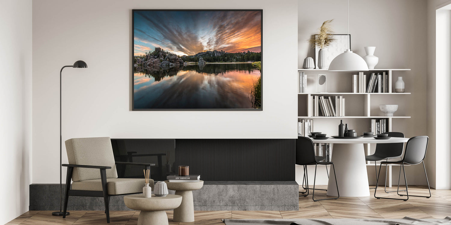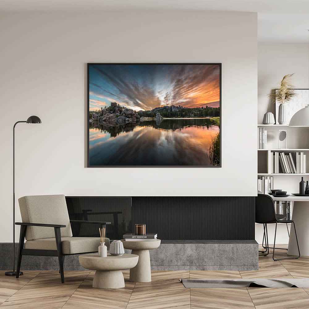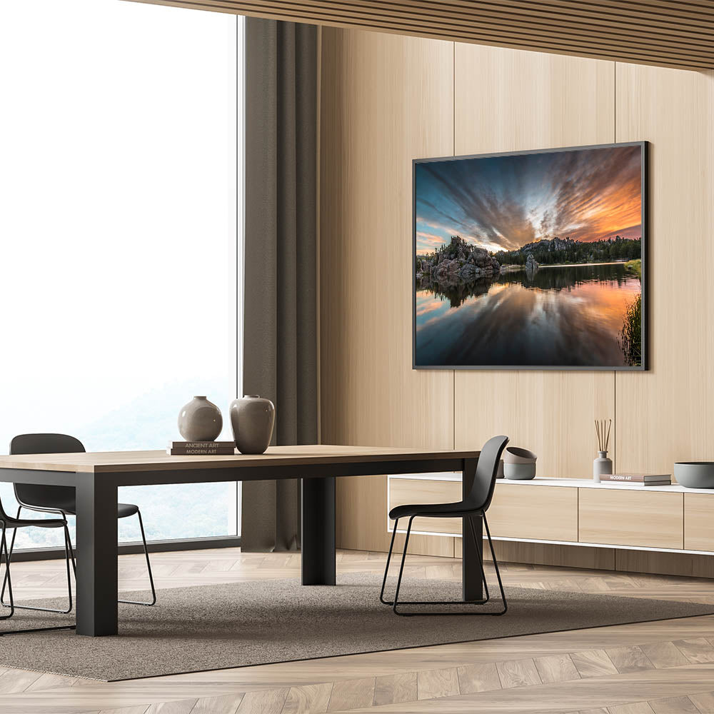 Experience the breathtaking beauty of South Dakota’s Badlands with this captivating wall art featuring a serene lake reflecting the vivid colors of the sunset. The dramatic clouds and towering rock formations provide a stunning backdrop to the calm waters, creating a perfect balance of natural beauty and tranquility. This scene from Badlands National Park is ideal for nature enthusiasts who want to bring the scenic wonder of South Dakota into their homes.