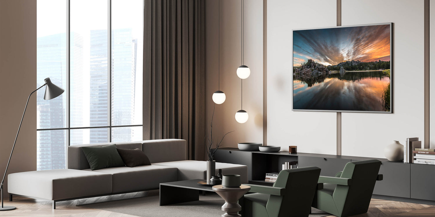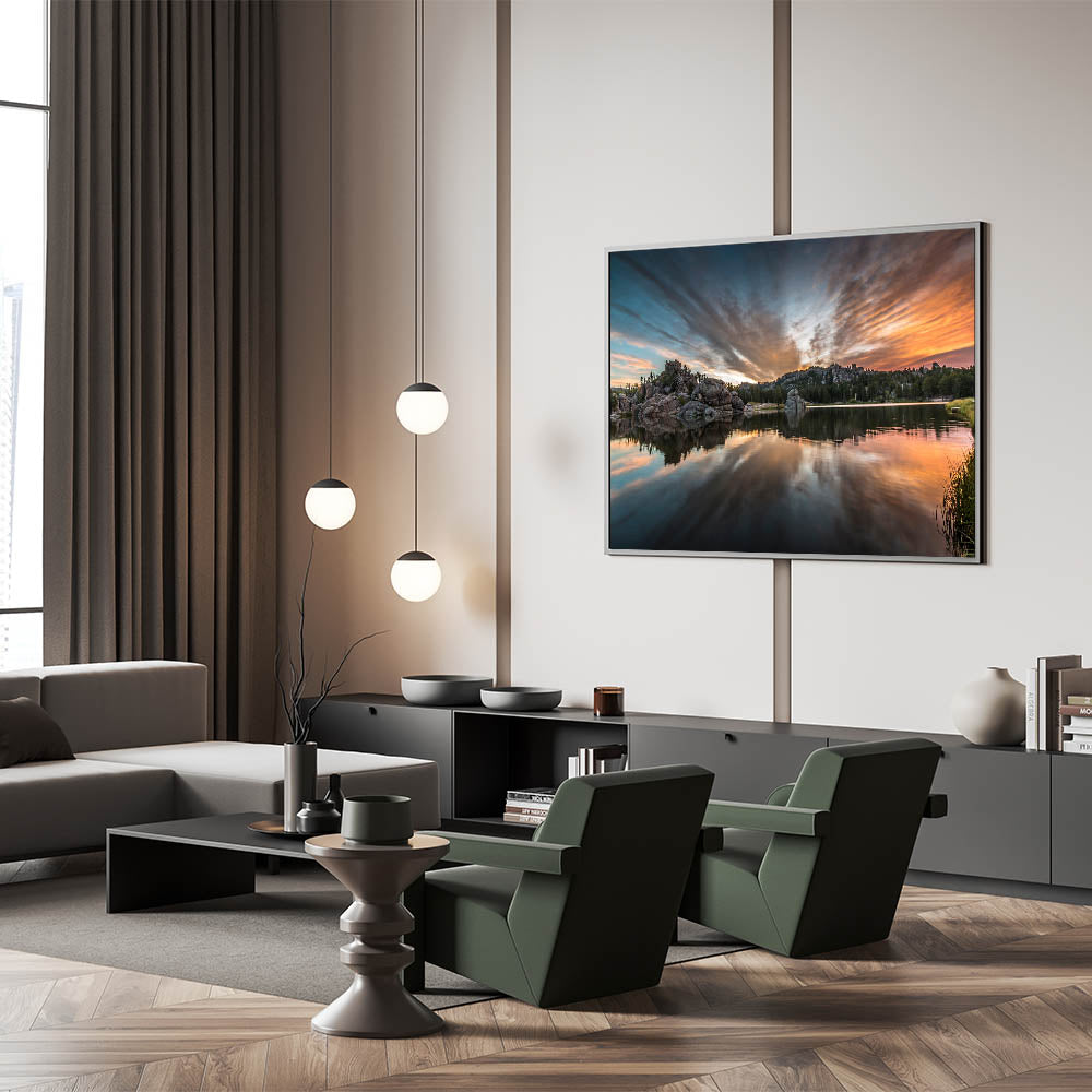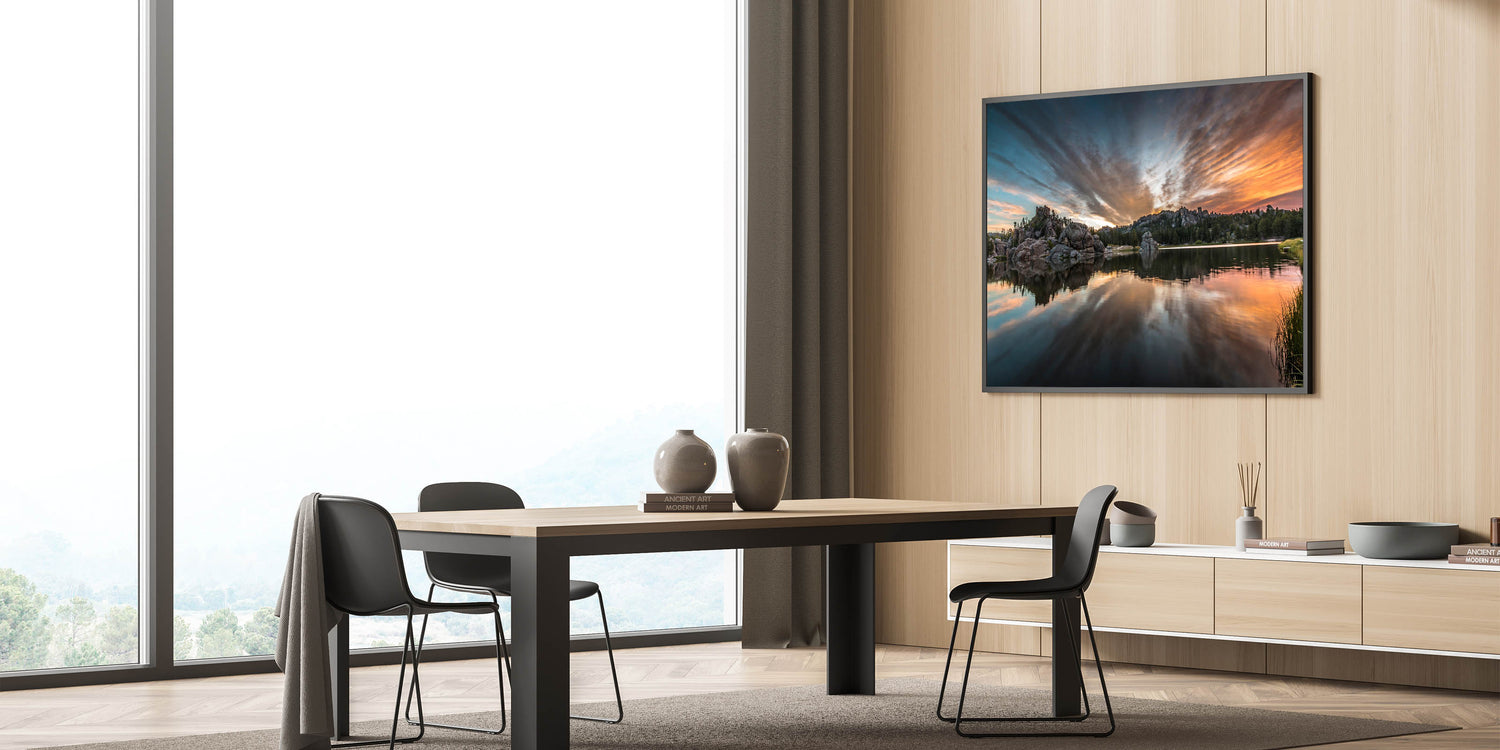 Experience the breathtaking beauty of South Dakota’s Badlands with this captivating wall art featuring a serene lake reflecting the vivid colors of the sunset. The dramatic clouds and towering rock formations provide a stunning backdrop to the calm waters, creating a perfect balance of natural beauty and tranquility. This scene from Badlands National Park is ideal for nature enthusiasts who want to bring the scenic wonder of South Dakota into their homes.