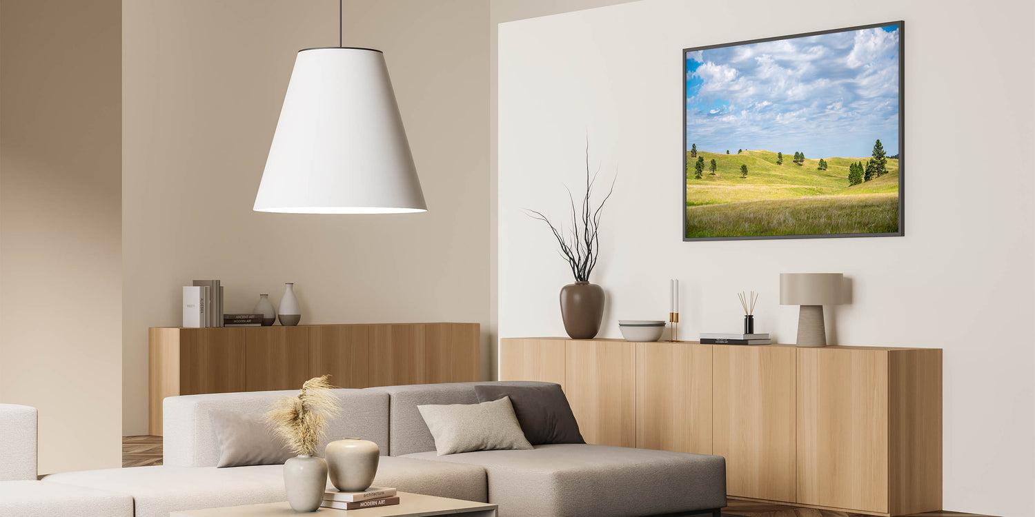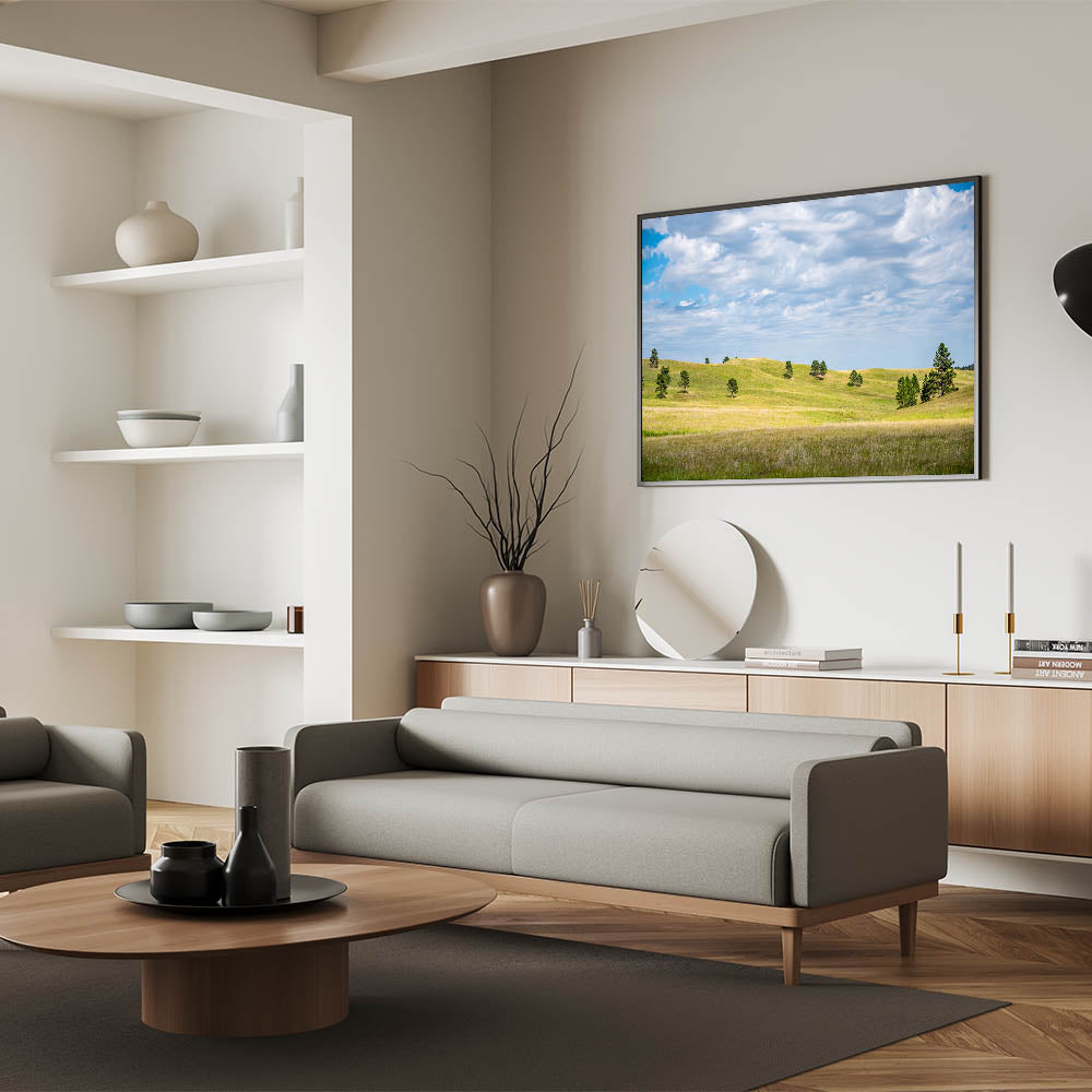 Immerse yourself in the peaceful beauty of South Dakota’s Black Hills region with this stunning wall art showcasing rolling green hills under a vast, cloud-filled sky. This serene landscape captures the quiet elegance of nature, offering a perfect addition to any space looking for a calming, scenic atmosphere. The gentle slopes and vibrant colors create a harmonious balance that reflects the untouched beauty of South Dakota's iconic landscapes.