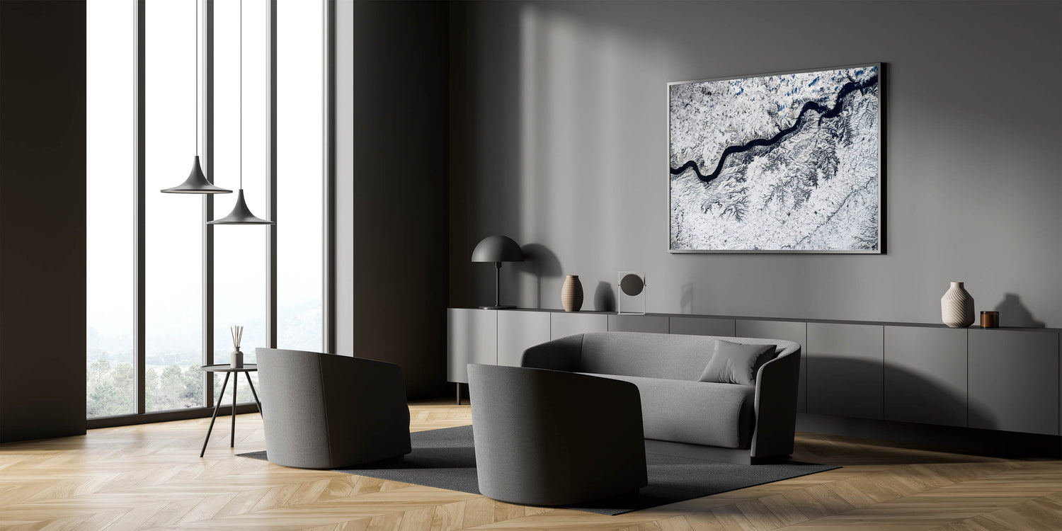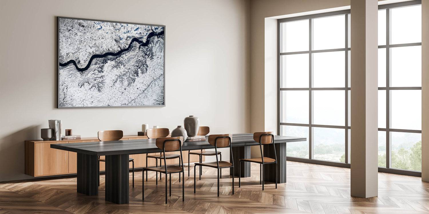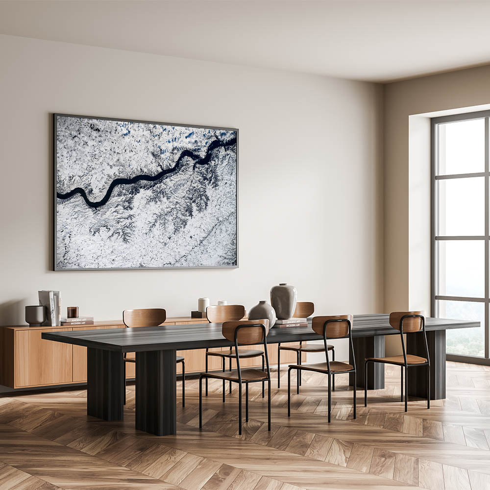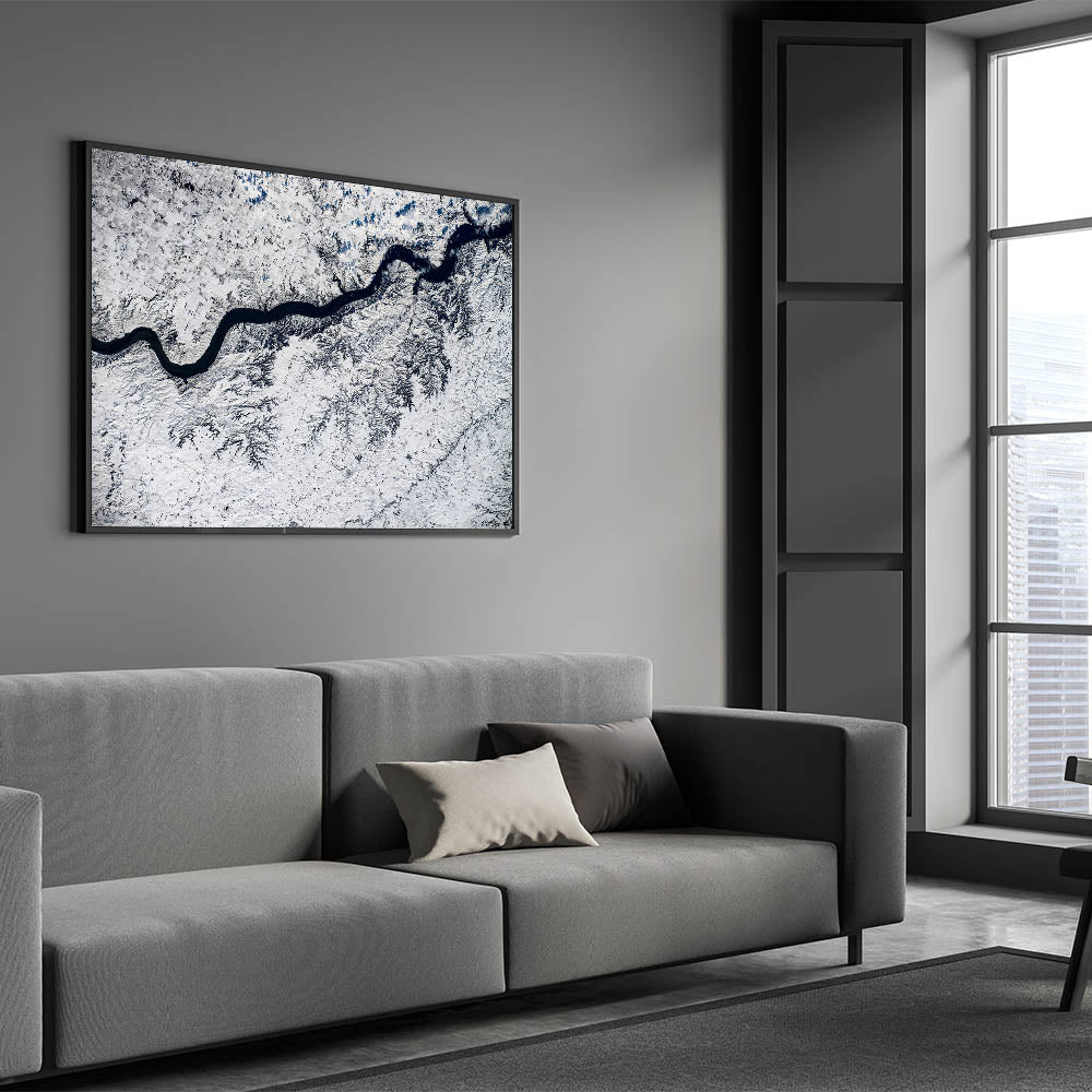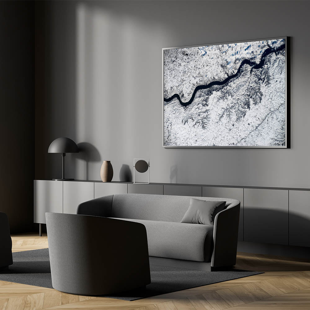 Capture the serene beauty of winter in South Dakota with this breathtaking aerial view of a winding river cutting through a snow-covered landscape. This stunning wall art highlights the intricate patterns formed by the river and snow, offering a mesmerizing and modern touch to your decor. Perfect for nature enthusiasts, this piece beautifully showcases South Dakota's winter charm from a bird's-eye perspective, adding a unique and refreshing perspective to any space.