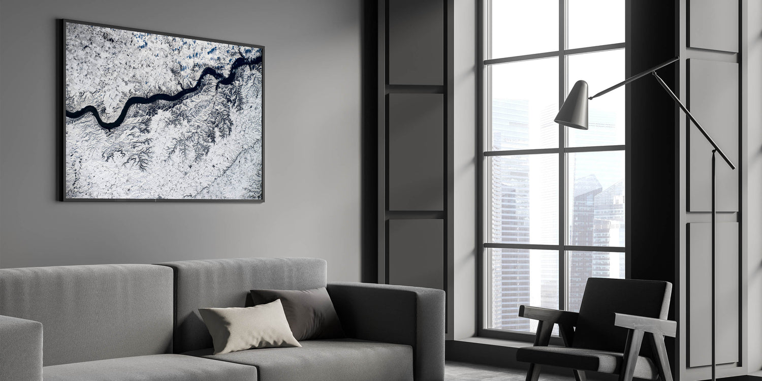 - High-resolution print showcasing the detailed aerial view of a winter landscape
