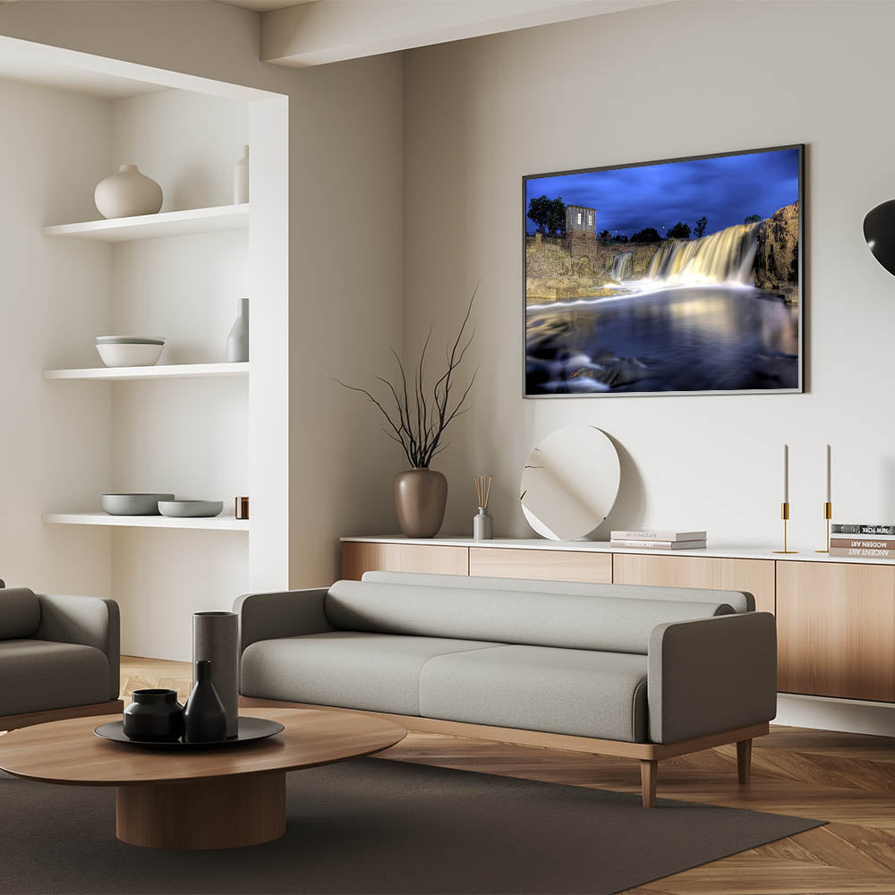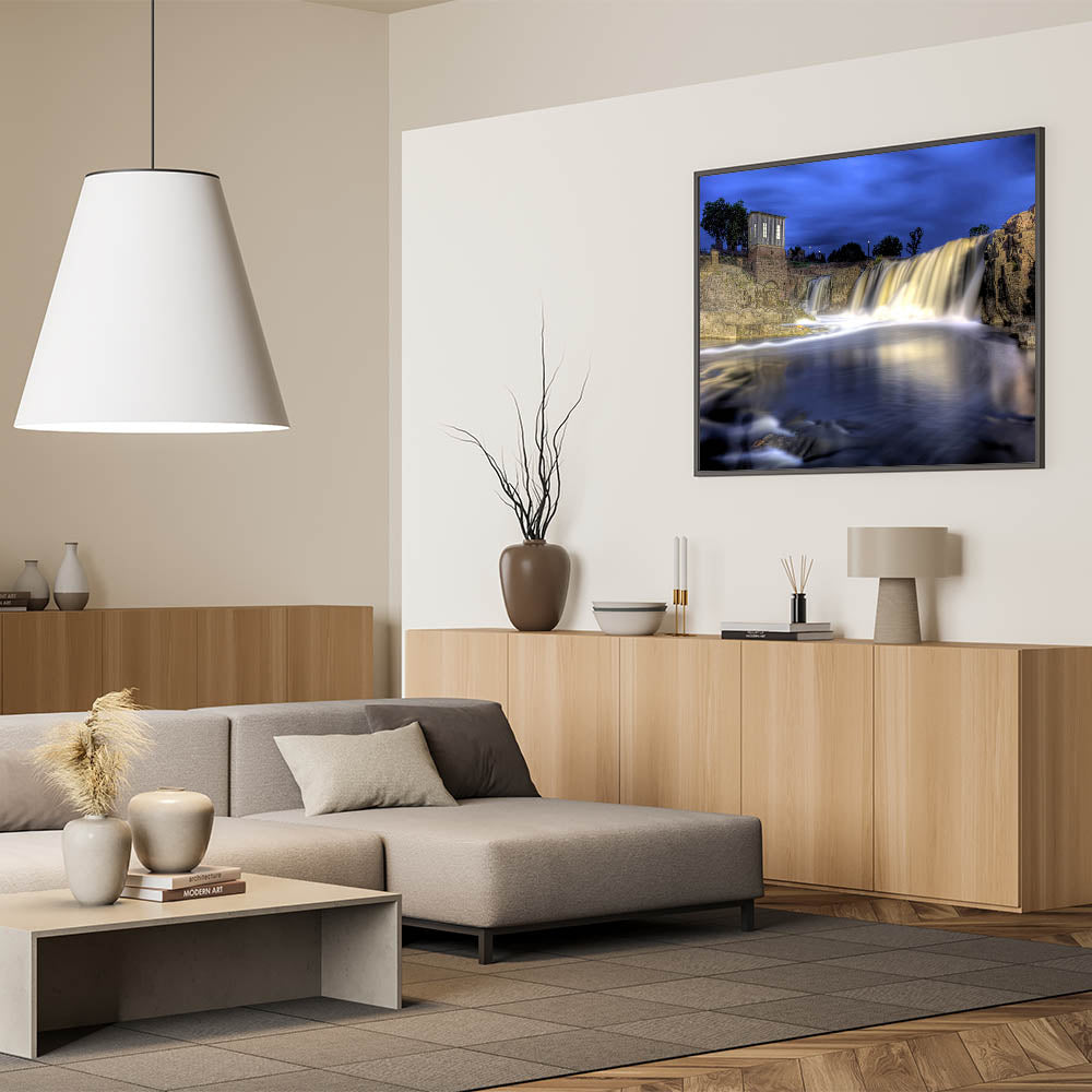 Experience the calming beauty of South Dakota’s natural landscapes with this mesmerizing wall art of a waterfall at twilight. The soft, flowing water contrasts beautifully with the deep blue sky, creating a tranquil yet dynamic scene that captures the essence of South Dakota’s scenic beauty. This artwork offers an ethereal view of nature, ideal for those looking to bring serenity and movement into their living or office space.