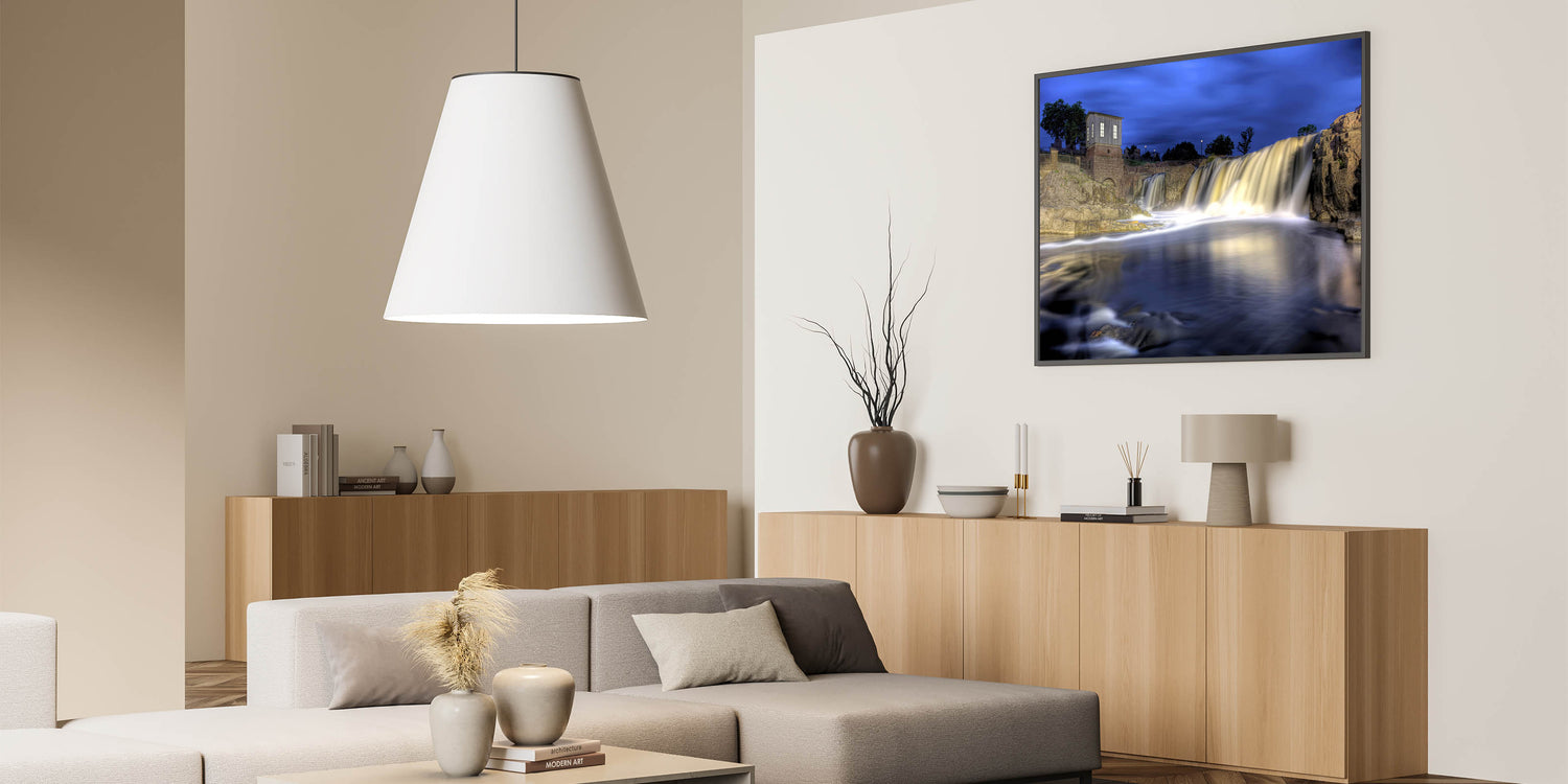 - High-resolution print showcasing the soft flow of water and the twilight sky