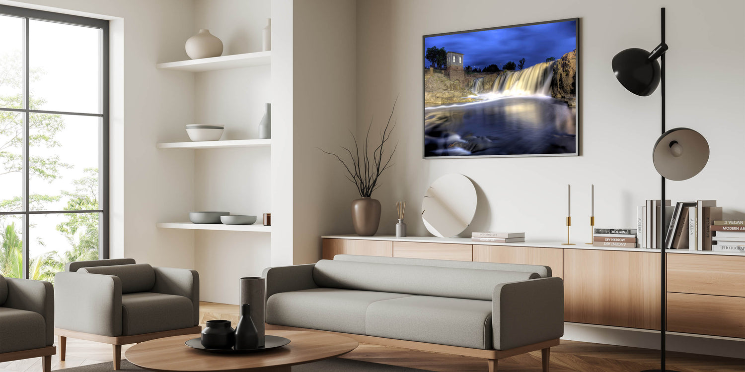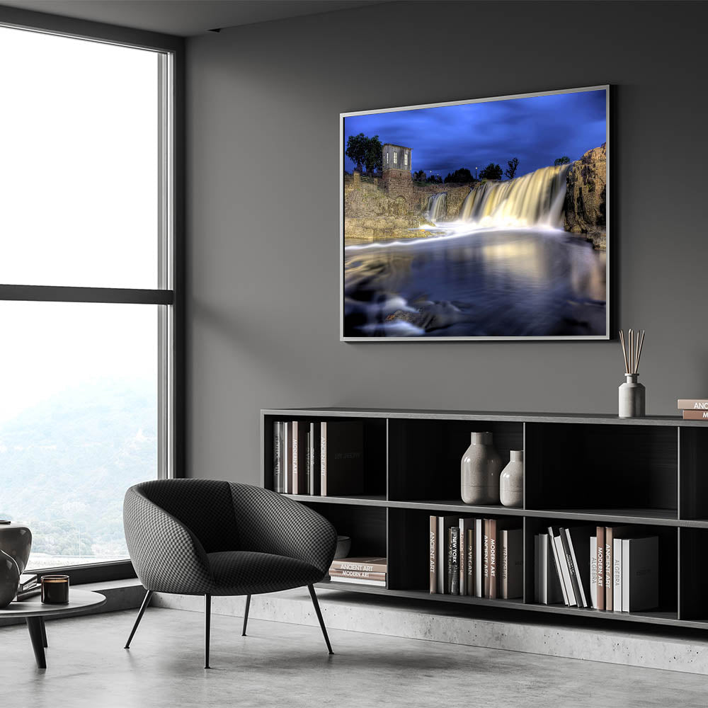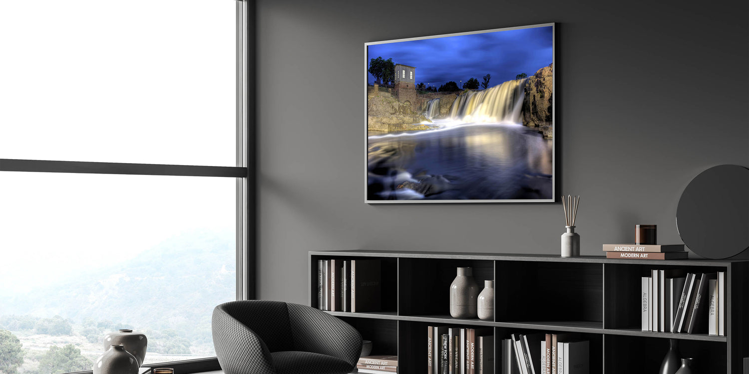 This artwork is a perfect piece for those who appreciate the natural wonders of South Dakota, blending the calm beauty of twilight with the dynamic flow of water. It's ideal for creating a peaceful and serene atmosphere.