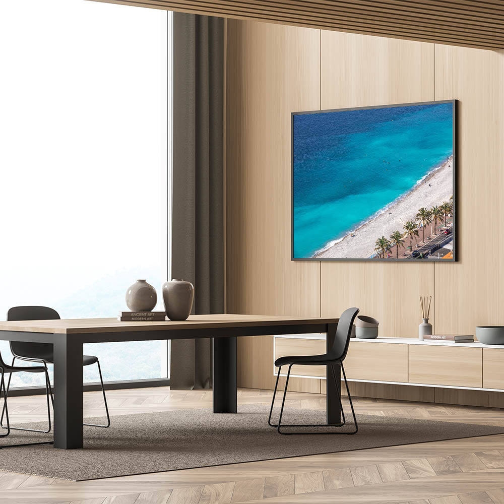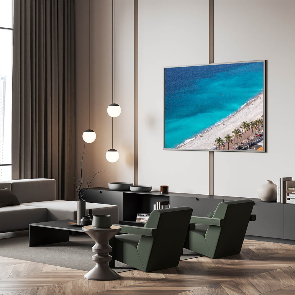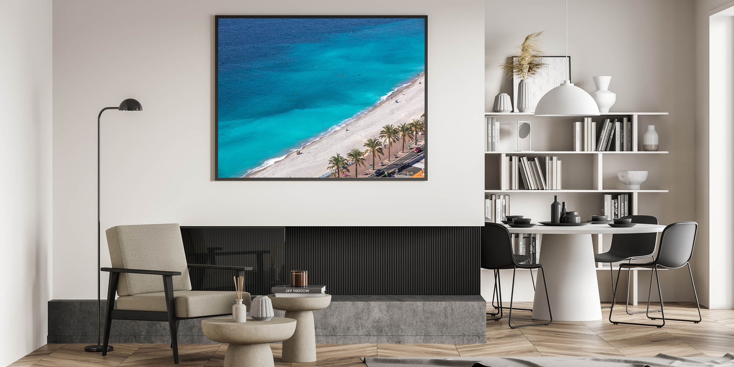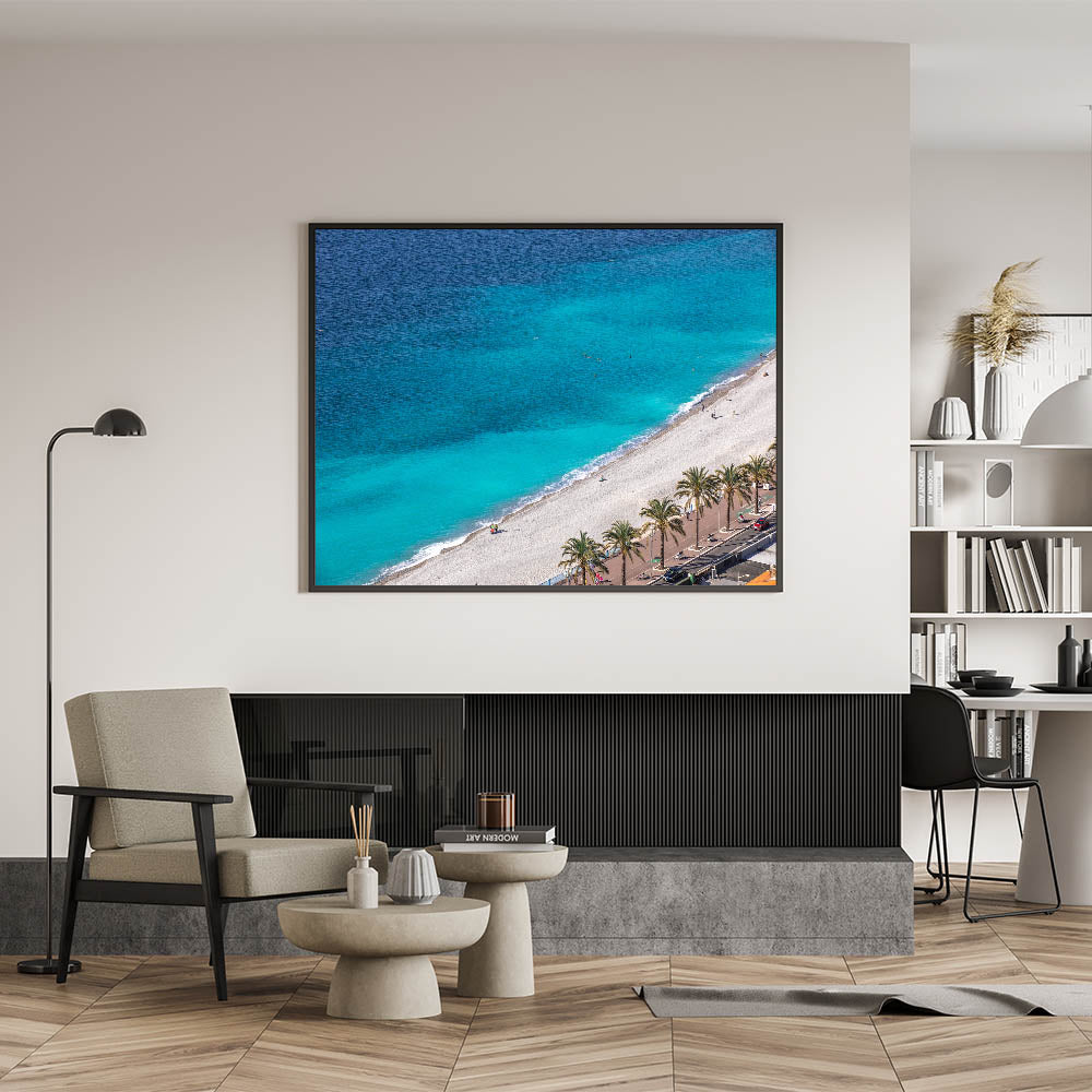 Experience the beauty of the Cote d'Azur with this breathtaking poster showcasing the turquoise waters and pebble beaches of the French Riviera. This South of France Wall Art captures the essence of a perfect day by the Mediterranean, where the deep blue sea meets the white shores. Palm trees dot the promenade, adding to the coastal charm that makes the Riviera such an iconic destination.