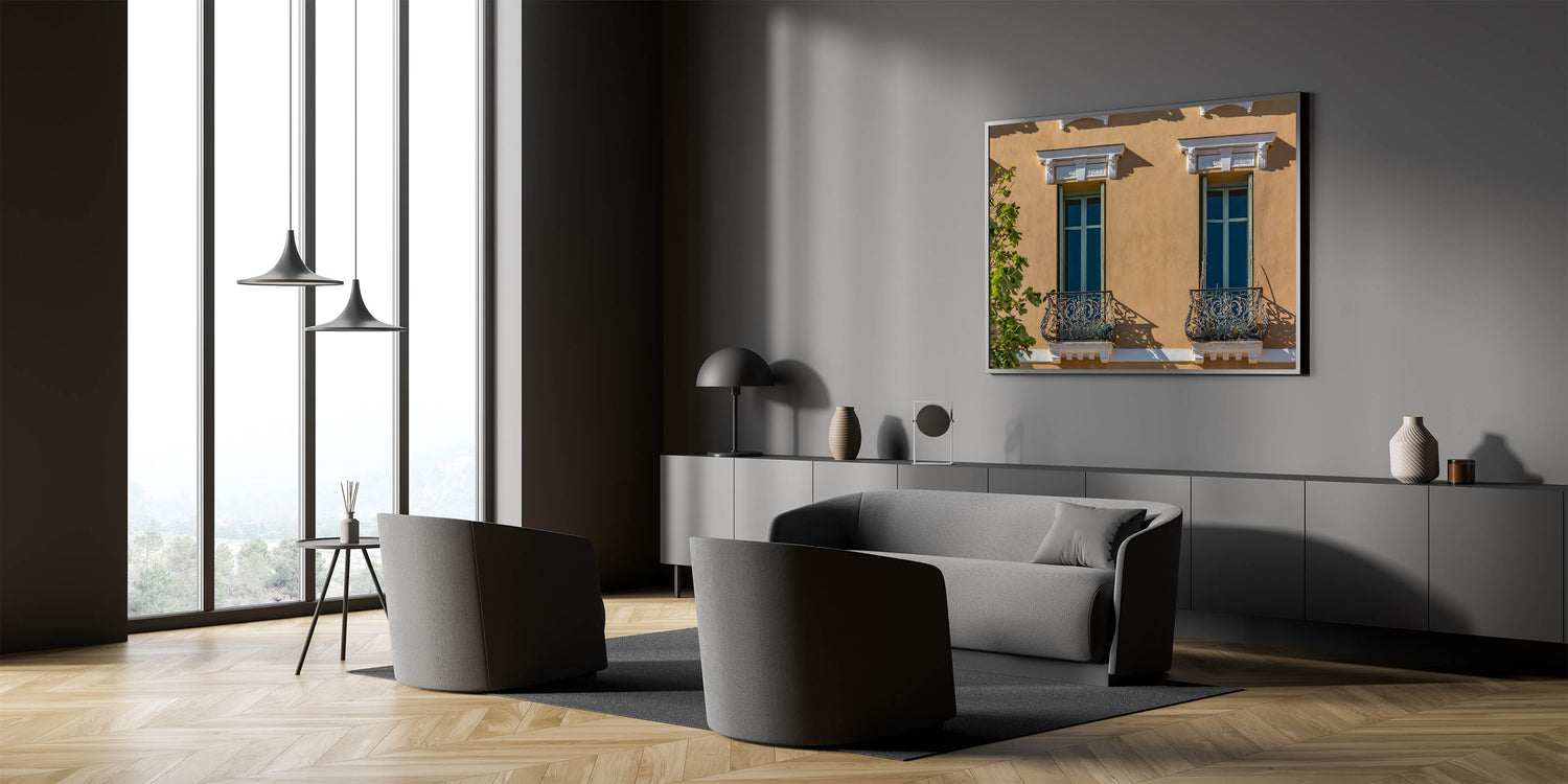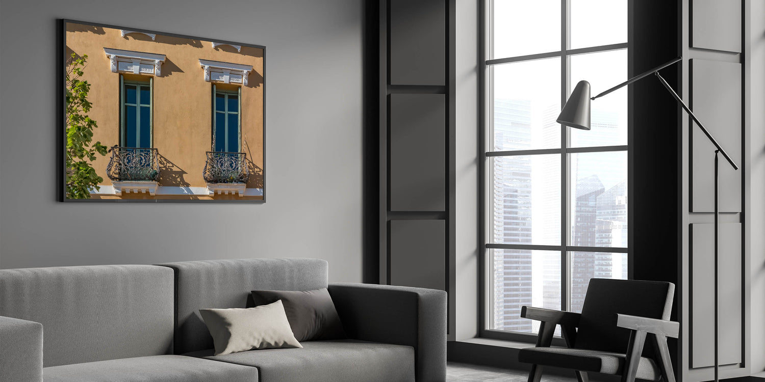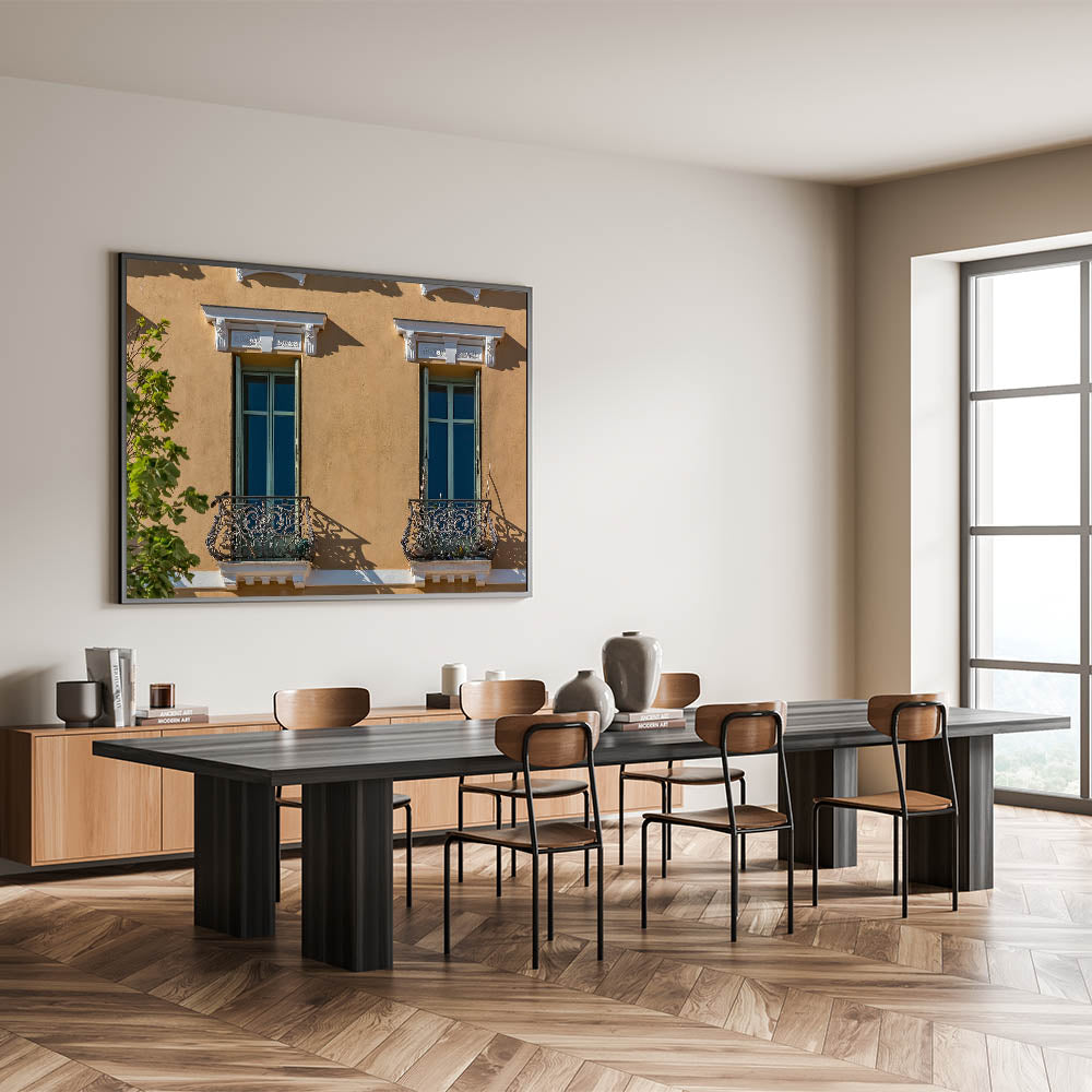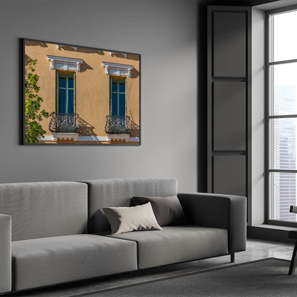 This unique French Village Art showcases the charming architecture of Provence, featuring intricate balcony railings and classic window designs bathed in warm sunlight. The warm tones of the building's façade contrast beautifully with the greenery, creating an inviting and timeless image of the South of France. This artwork captures the essence of Provence village paintings, perfect for adding a touch of French charm to any home.