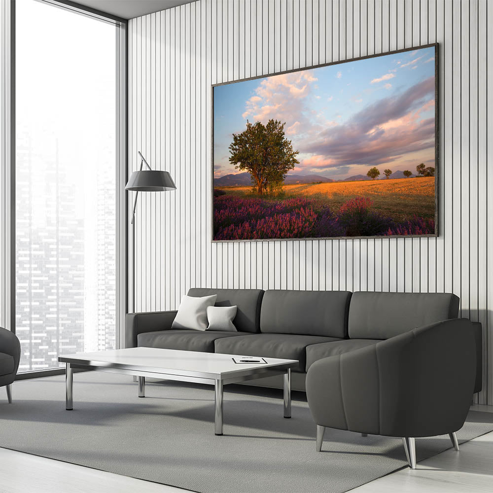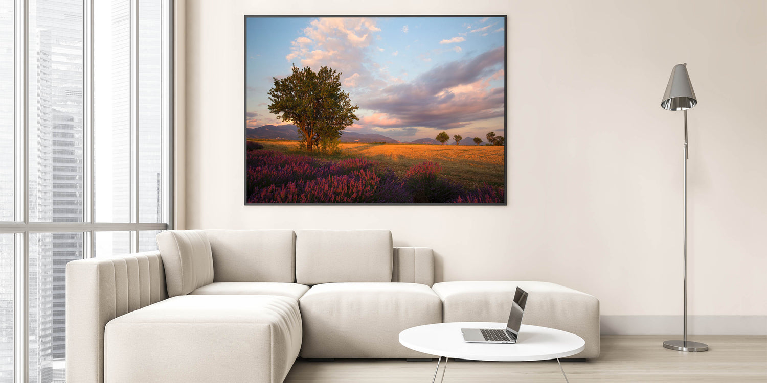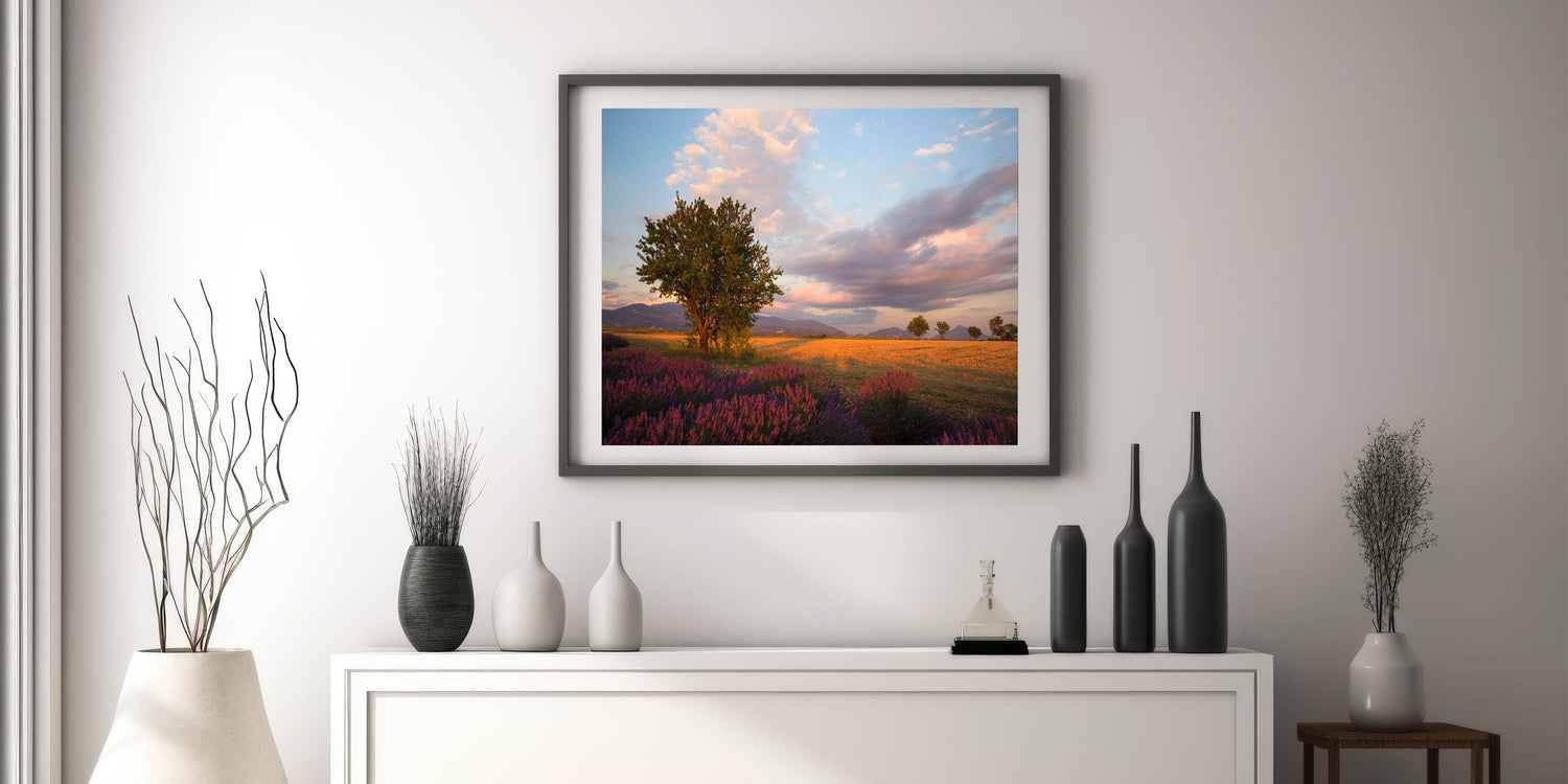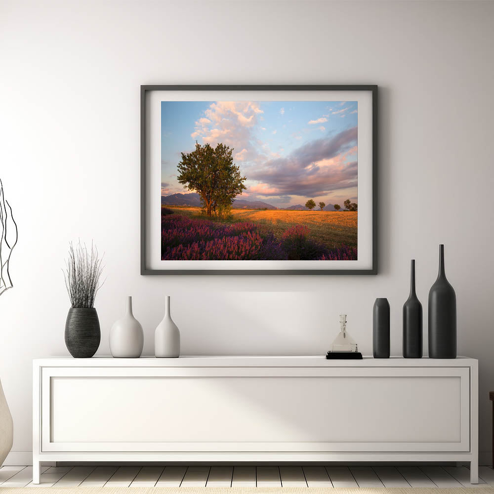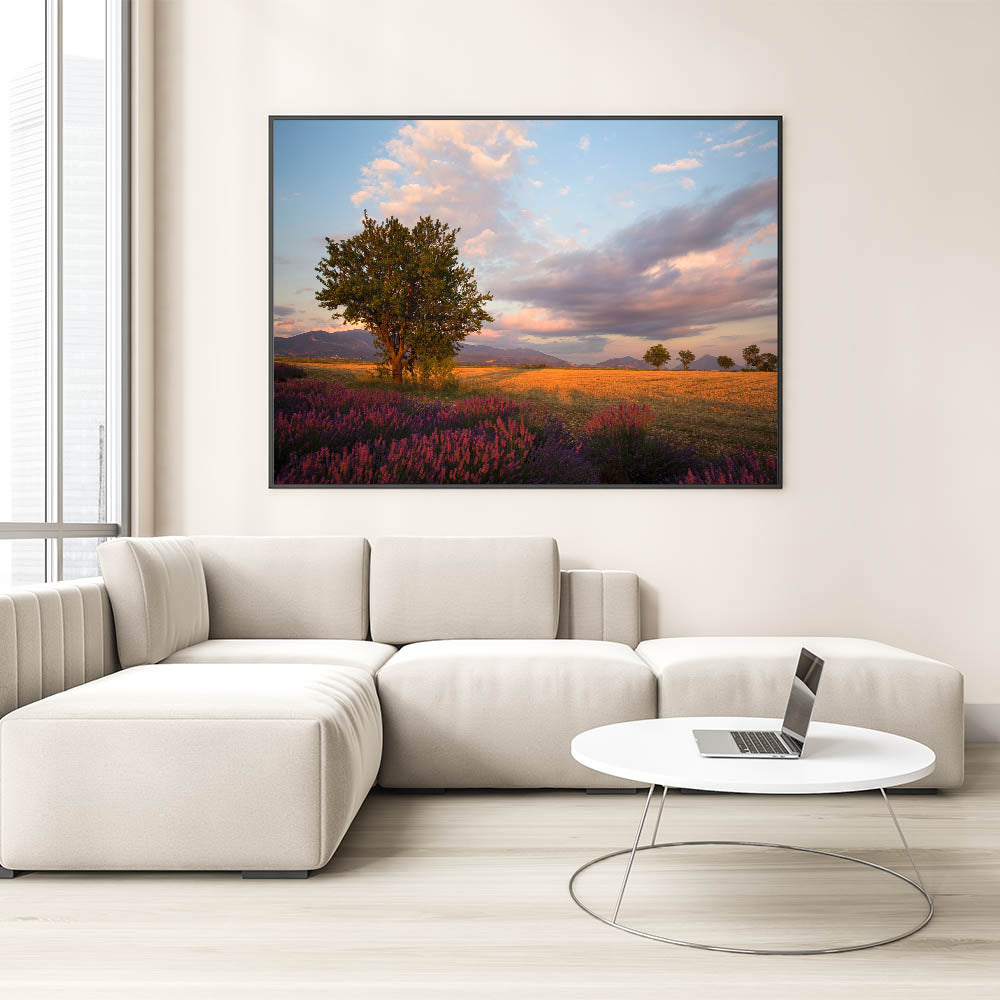 Capture the serene beauty of Provence with this stunning lavender field art print. This breathtaking scene features a lone tree standing against a backdrop of lavender blooms and golden fields, all illuminated by the soft glow of a setting sun. The gentle colors of the sky blend harmoniously with the natural landscape, evoking a sense of calm and tranquility. This scenic Provence art piece is the perfect addition to any space, offering a glimpse into the peaceful life of the French countryside.