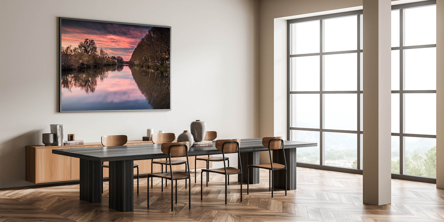 Capture the peaceful beauty of Provence with this breathtaking piece of scenic Provence art. This artwork showcases a tranquil river at sunset, with the soft pinks and oranges of the sky reflecting off the still water. The bare trees along the riverbank and the delicate hues of the fading sunlight create a calming and serene atmosphere, perfect for adding a touch of nature-inspired elegance to your home. This artwork evokes the quiet charm of the French countryside, making it an ideal addition to any space.