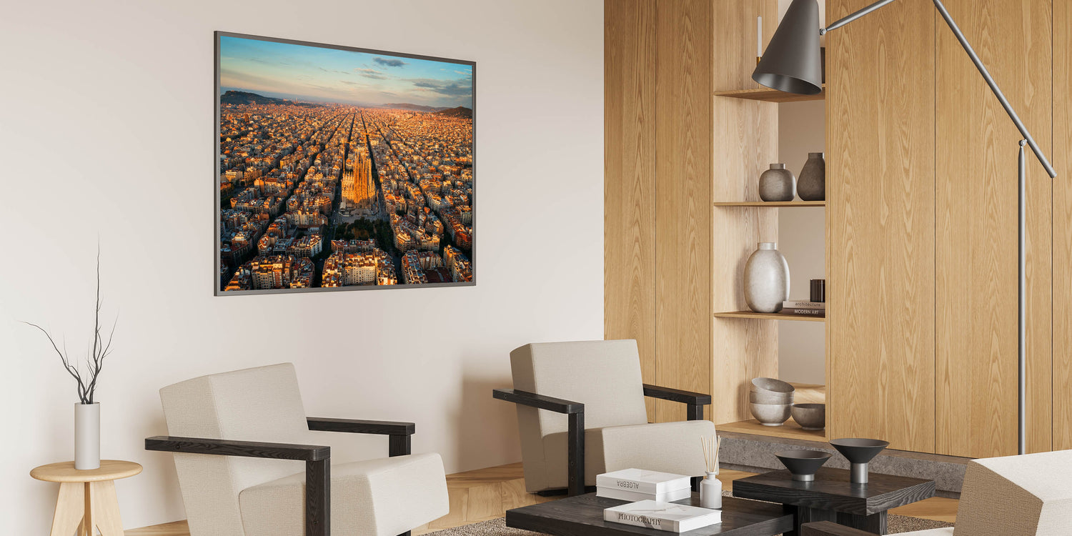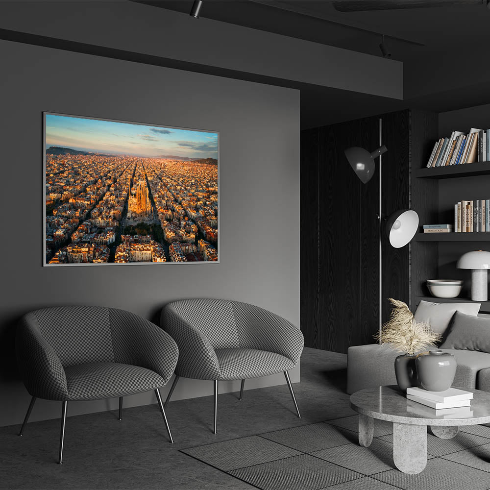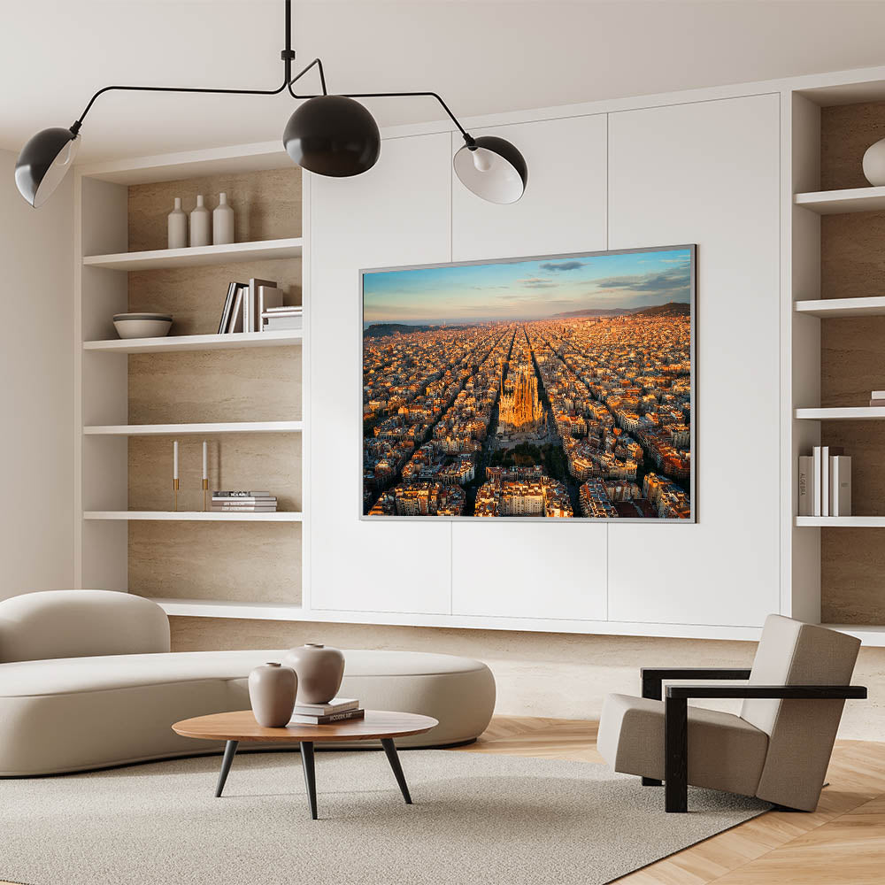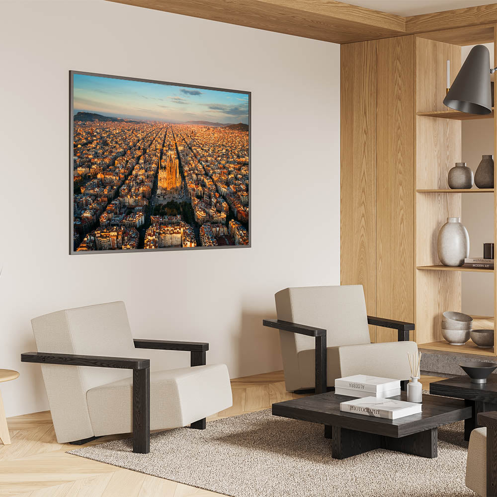 Capture the beauty of Barcelona with this stunning Barcelona canvas print, featuring an awe-inspiring aerial view of the Sagrada Família bathed in the warm light of the golden hour. The sprawling city stretches out in every direction, with the iconic basilica standing tall at the heart of Barcelona. The soft sunlight highlights the intricate details of the architecture, making this beautiful Barcelona wall decor a perfect centerpiece for any space.