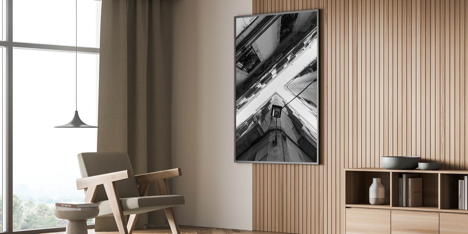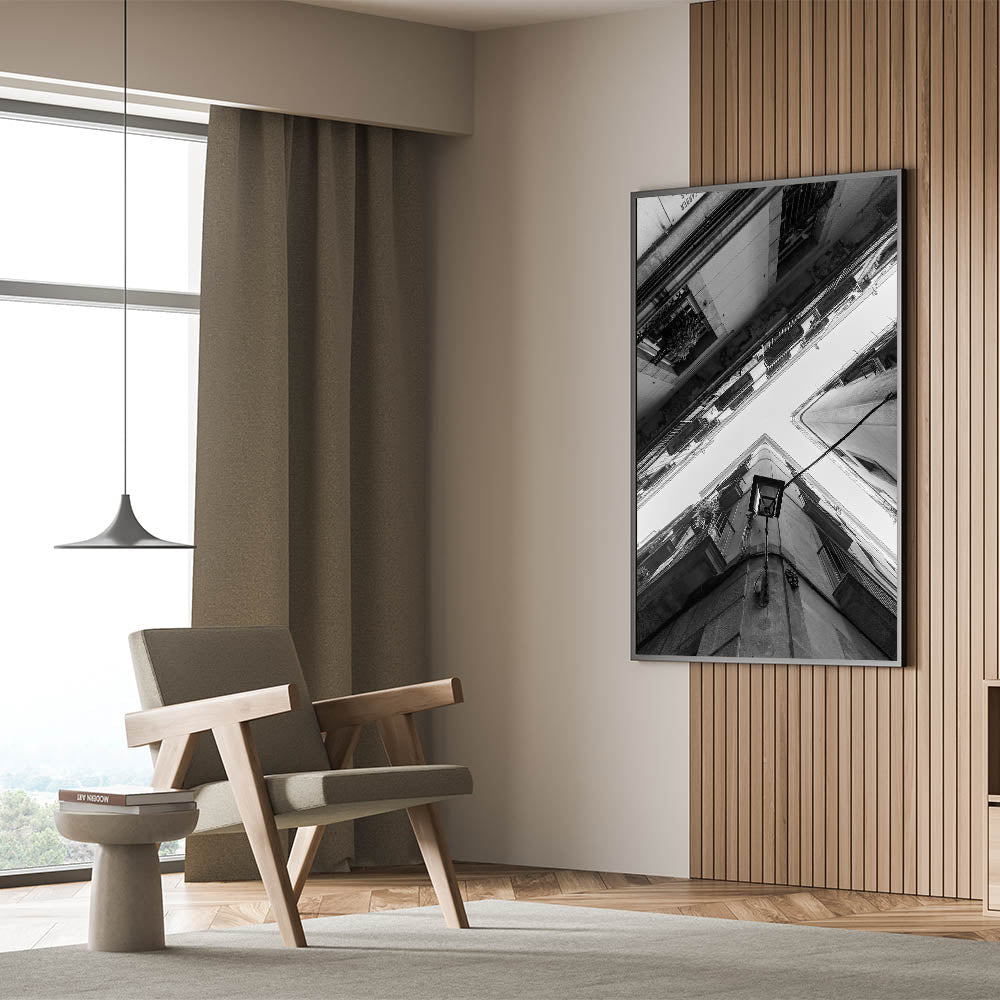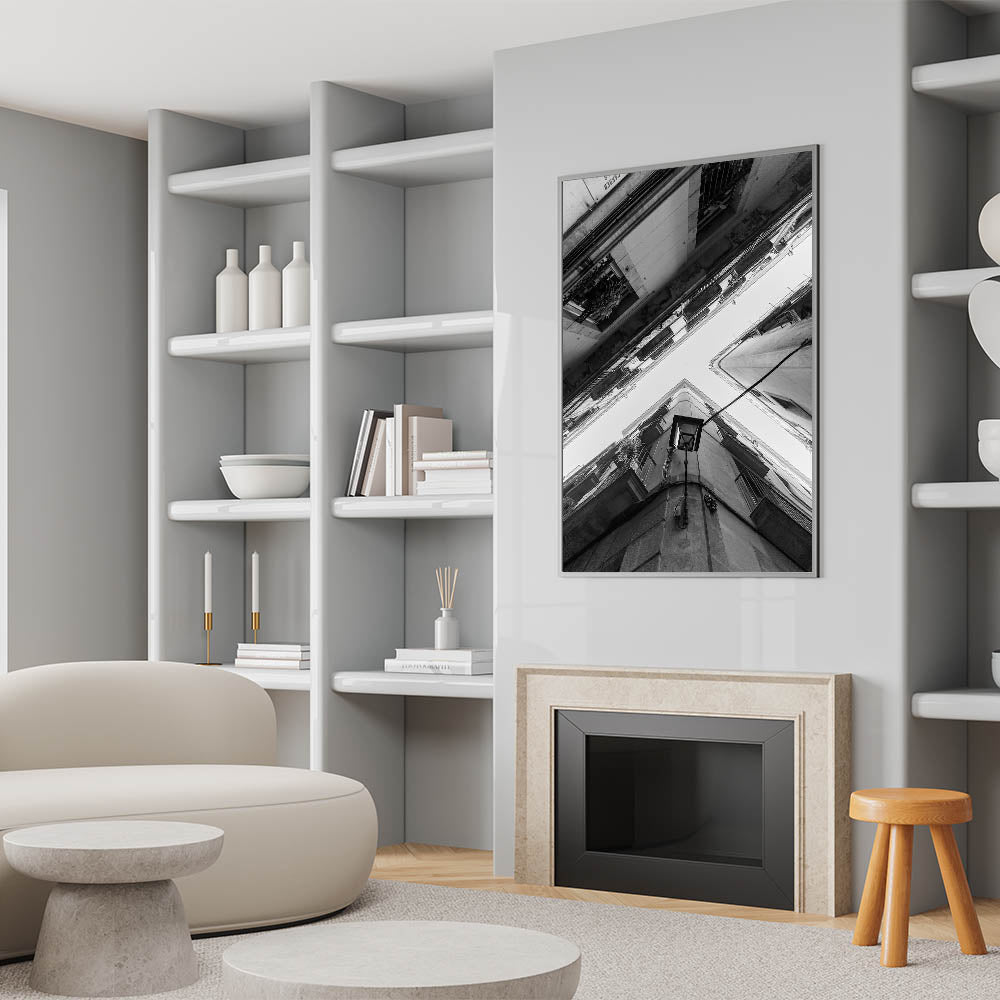 Elevate your space with this stunning piece of Barcelona canvas prints, showcasing a unique upward view of the city’s architecture. The black-and-white design emphasizes the dramatic angles and lines of Barcelona’s urban landscape, creating a modern and sophisticated look. This artwork is perfect for lovers of architecture, design, and urban photography.