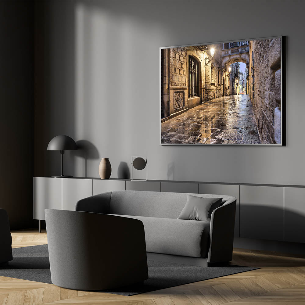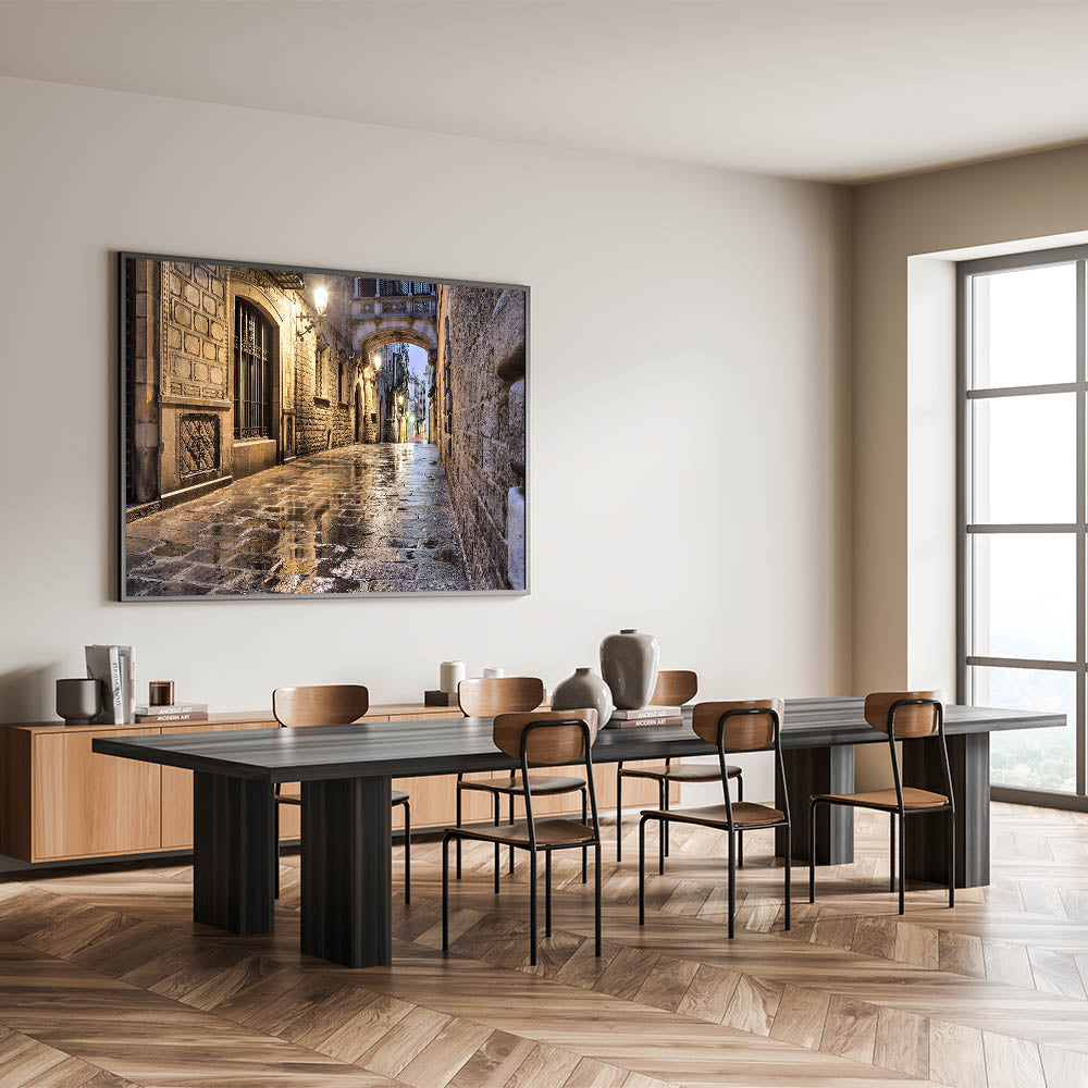 Capture the essence of Barcelona with this stunning piece of Barcelona cityscape art. The beautiful cobblestone streets, historic architecture, and soft lighting create an evocative atmosphere that transports you directly to the heart of this vibrant city. This artwork is perfect for anyone looking to bring a touch of old-world charm to their space.