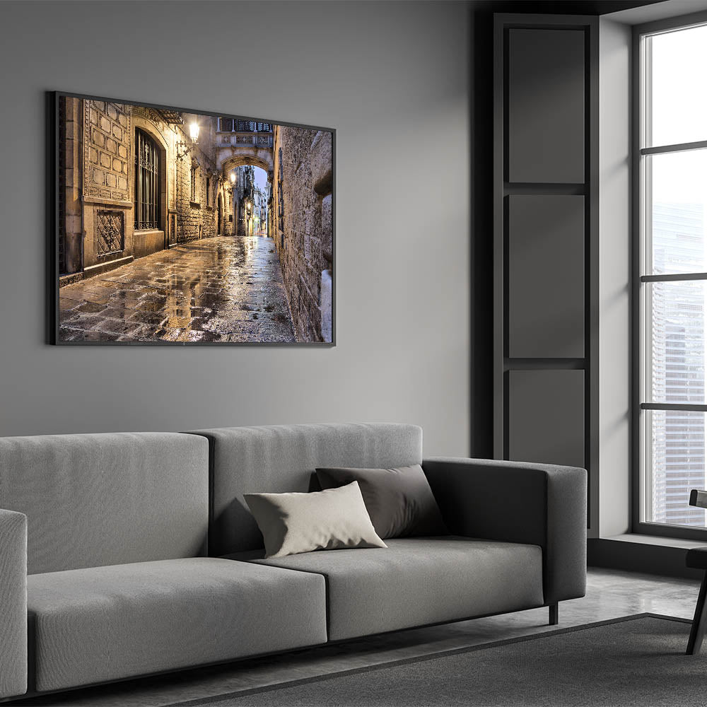 This scenic Barcelona artwork is available in various sizes and formats, making it a versatile piece for any décor style. Whether you're a fan of historic architecture or love Barcelona's unique charm, this piece will enhance your home or workspace.