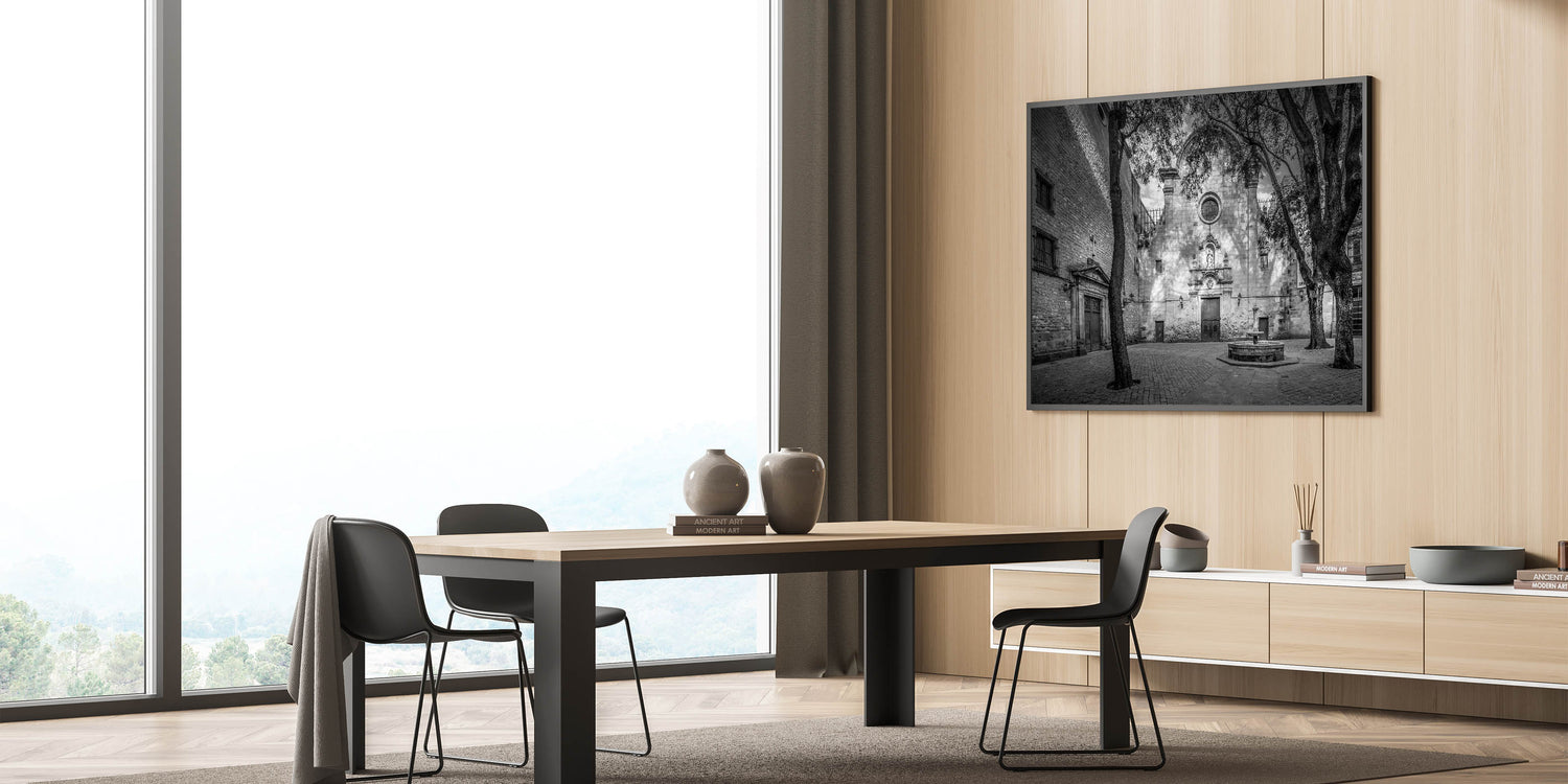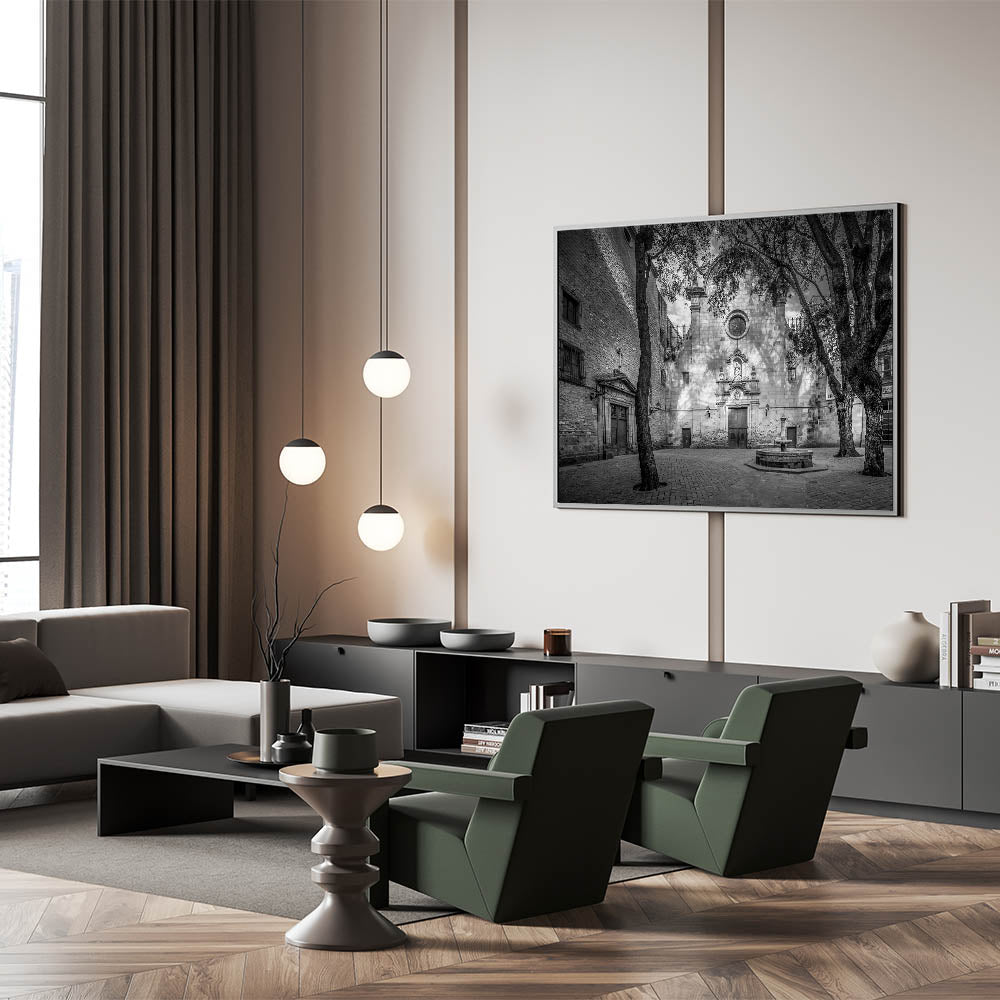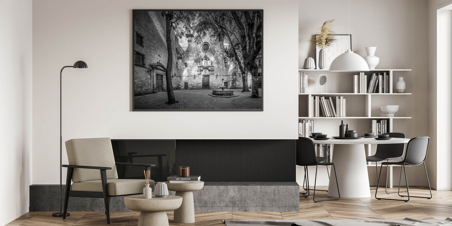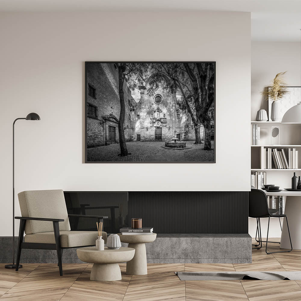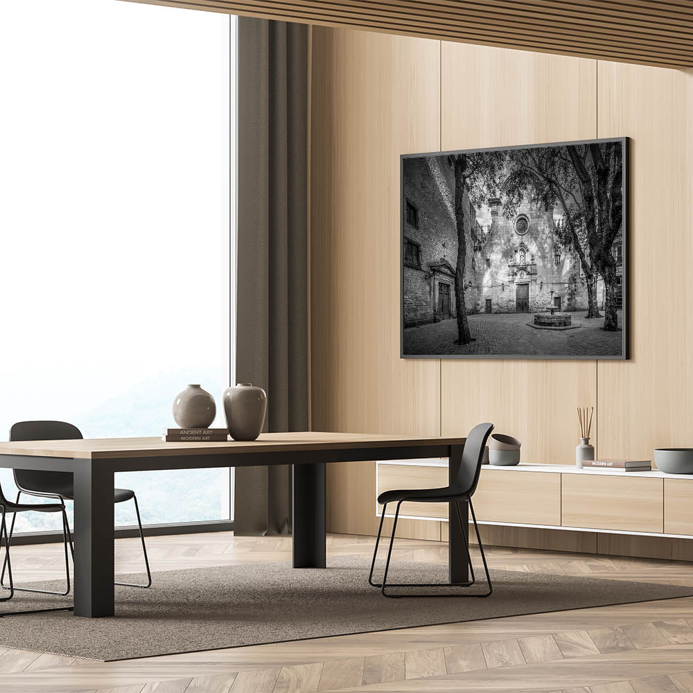 Embrace the serene beauty of Barcelona’s Gothic Quarter with this Barcelona framed art piece, featuring a tranquil courtyard in black and white. The play of light and shadows across the ancient stone facade and the quiet atmosphere make this beautiful Barcelona wall decor a captivating addition to any space. This piece offers a sense of history and solitude, perfect for those who appreciate the elegance of classical architecture.