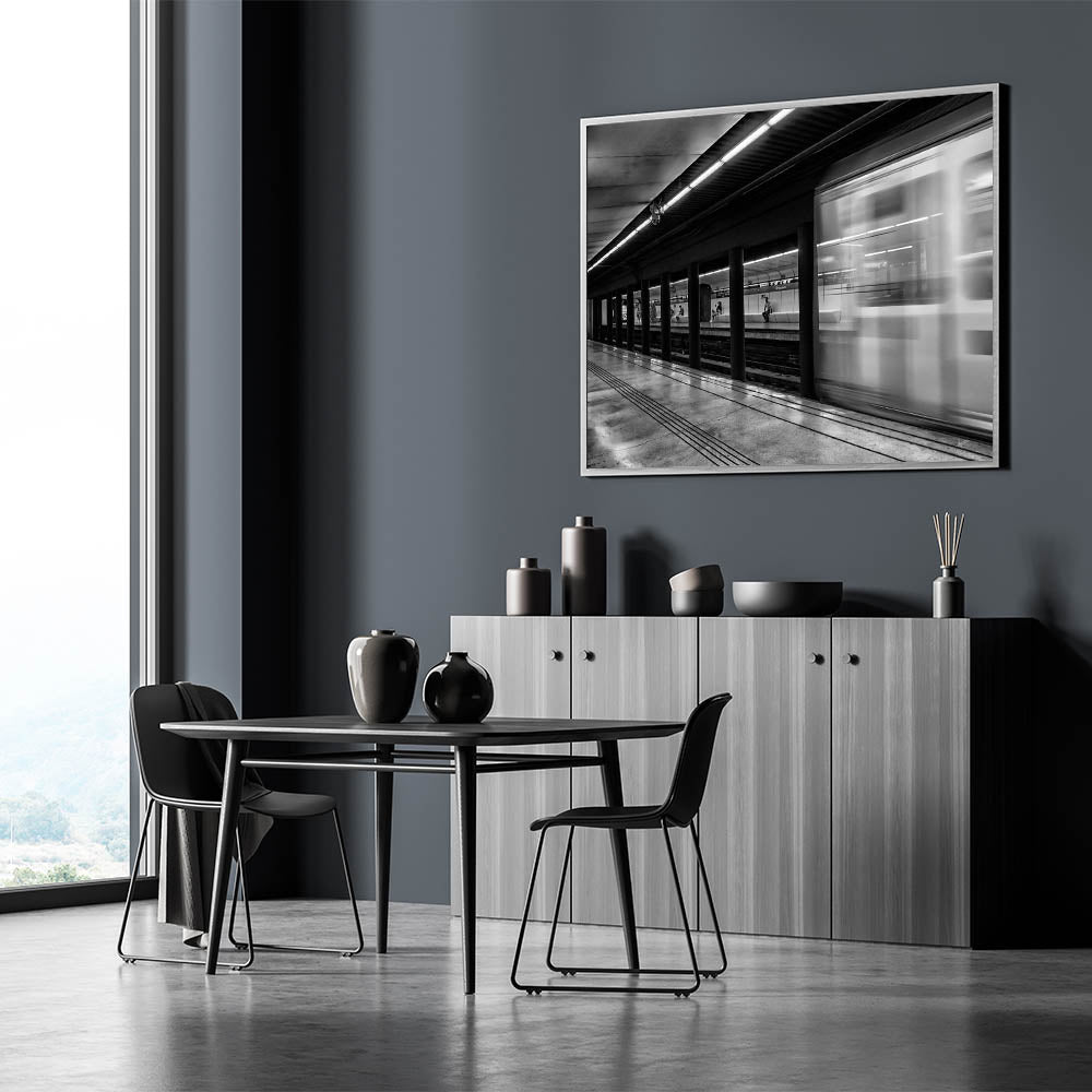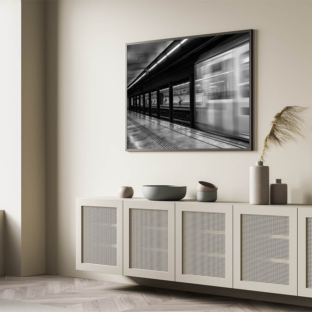 Barcelona Framed Art - Urban Metro Station in Motion Black & White Print