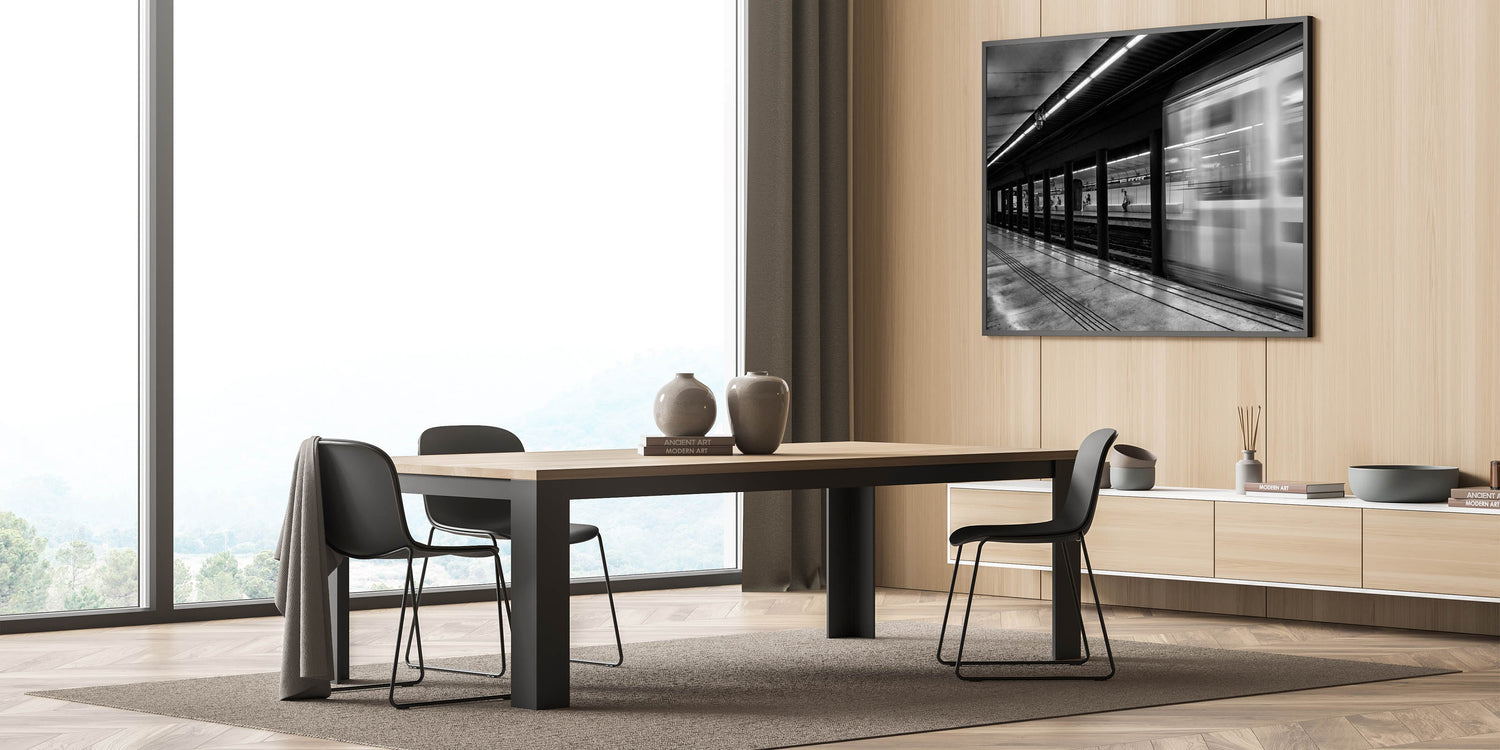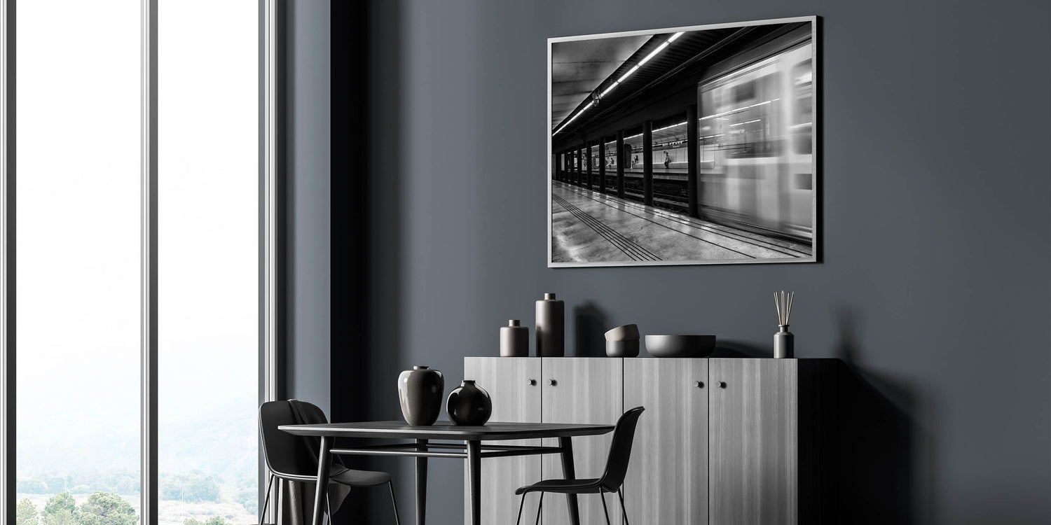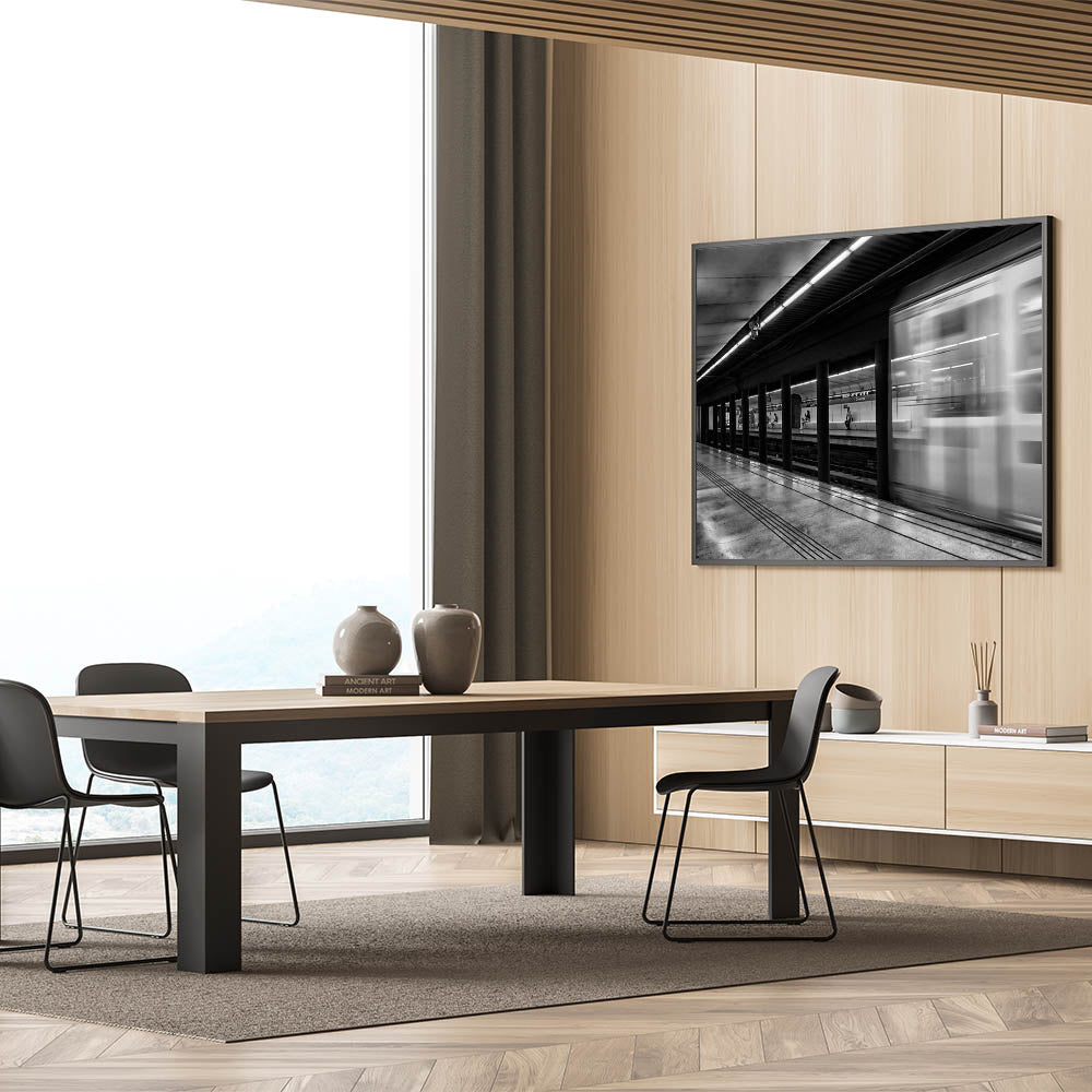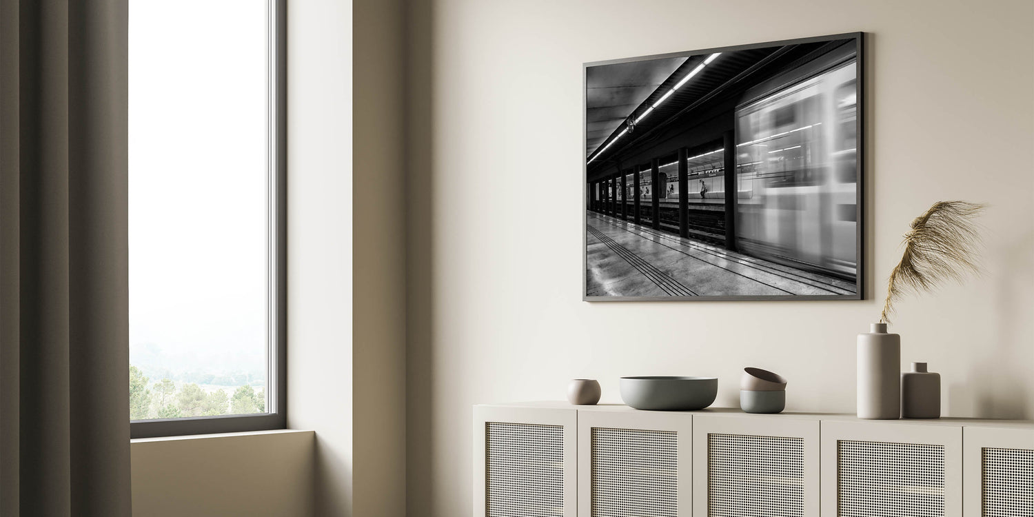 Experience the energy of Barcelona’s urban life with this striking Barcelona framed art, featuring a sleek black-and-white image of a metro station in motion. The blurred movement of the train against the sharp architectural lines of the platform creates a modern and dynamic piece, perfect for contemporary spaces. This beautiful Barcelona wall decor adds a touch of the city’s vibrant pulse to any room.