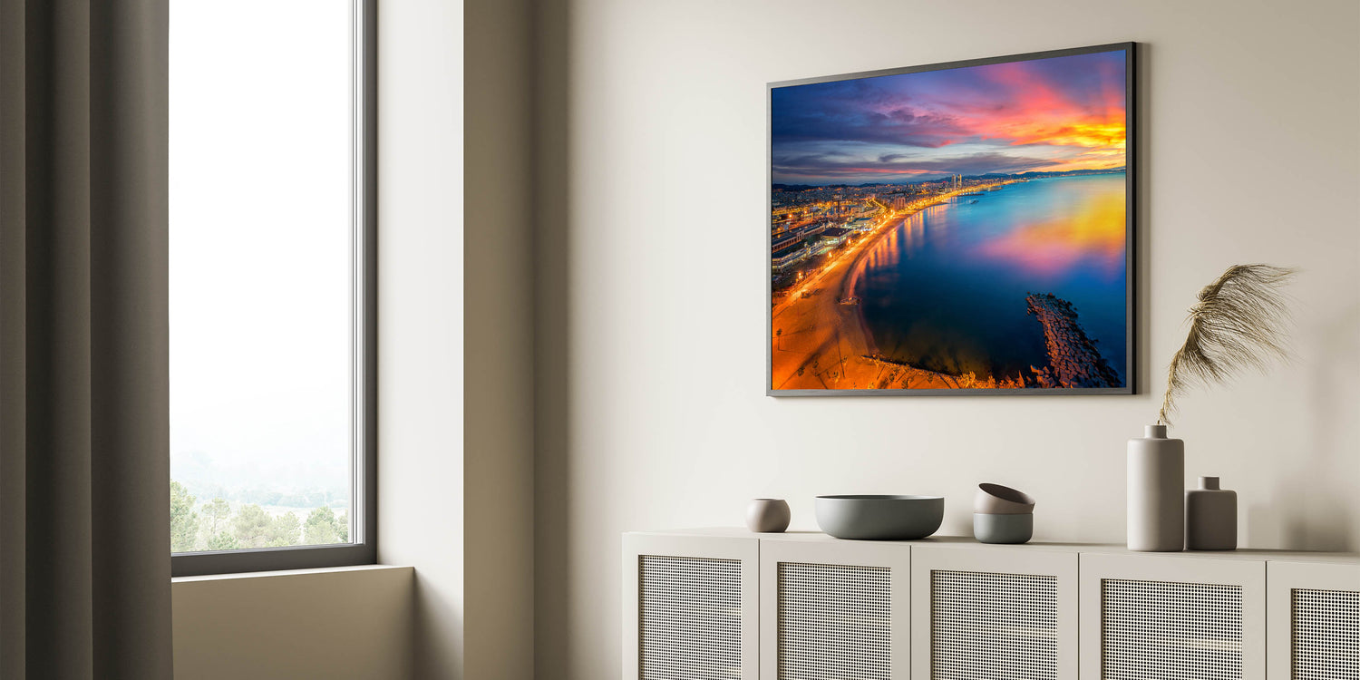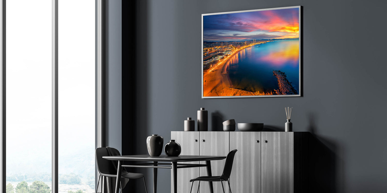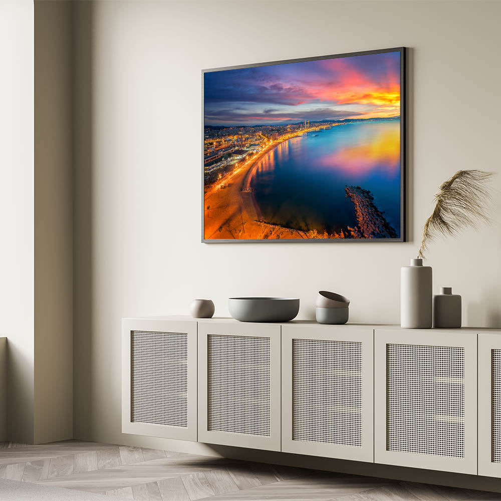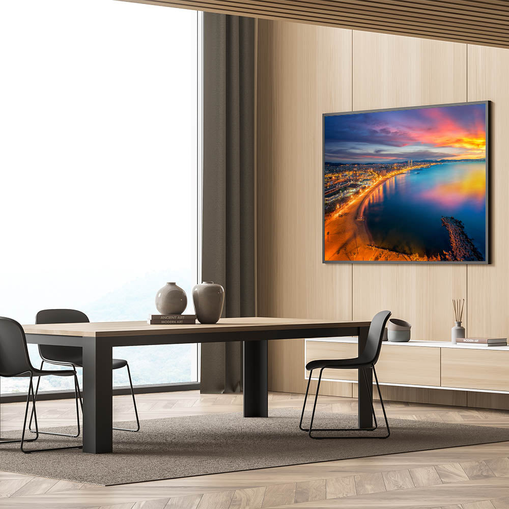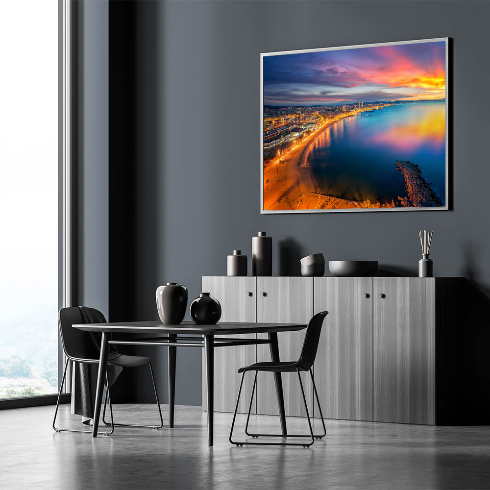This stunning Barcelona photography print captures the vibrancy and beauty of the city’s coastline, illuminated by the warm glow of sunset and city lights. The dramatic blend of colors in the sky and the shimmering reflection of lights on the water make this beautiful Barcelona wall decor a striking addition to any room. The image perfectly showcases scenic views of Barcelona in all its coastal glory, creating a piece that stands out in any space.