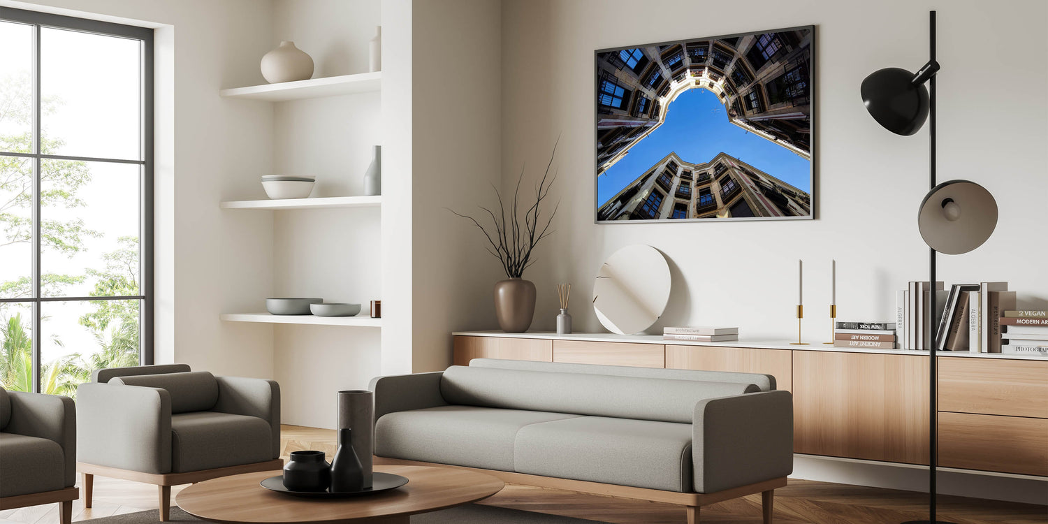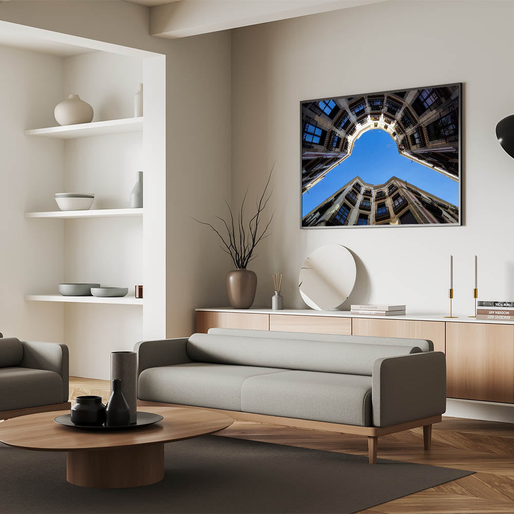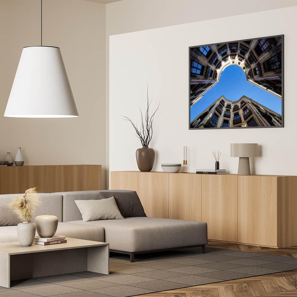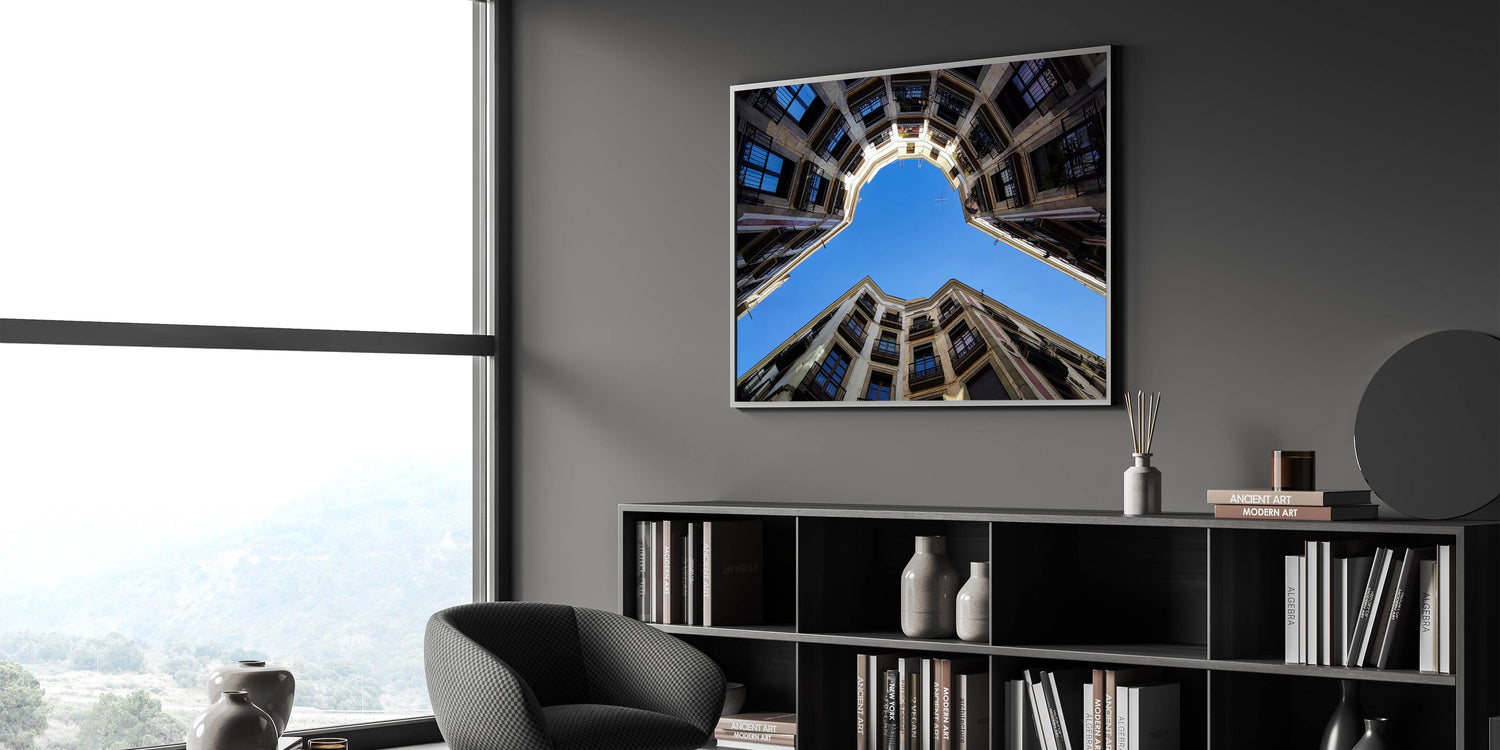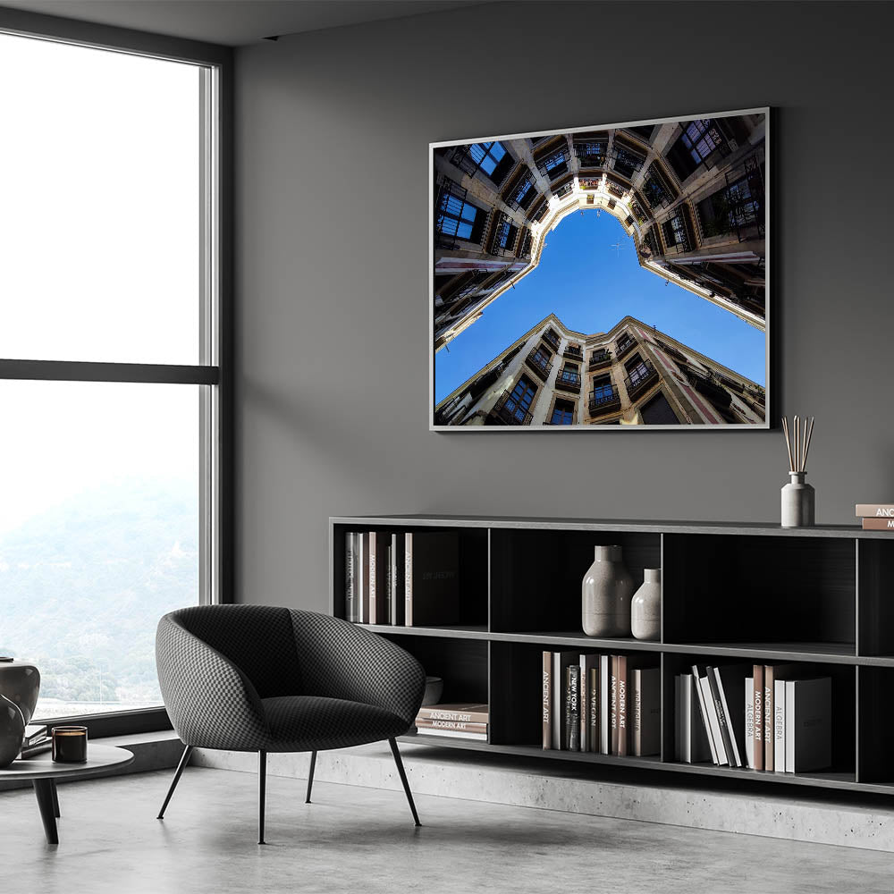 Transform your space with this striking Barcelona wall art, capturing a breathtaking upward view from the heart of a classic Barcelona courtyard. The image’s unique perspective, framed by the symmetrical architecture of the buildings, leads your gaze towards the clear blue sky. This beautiful Barcelona wall decor offers a fresh, modern take on the city’s renowned architecture, making it a standout piece for any space.