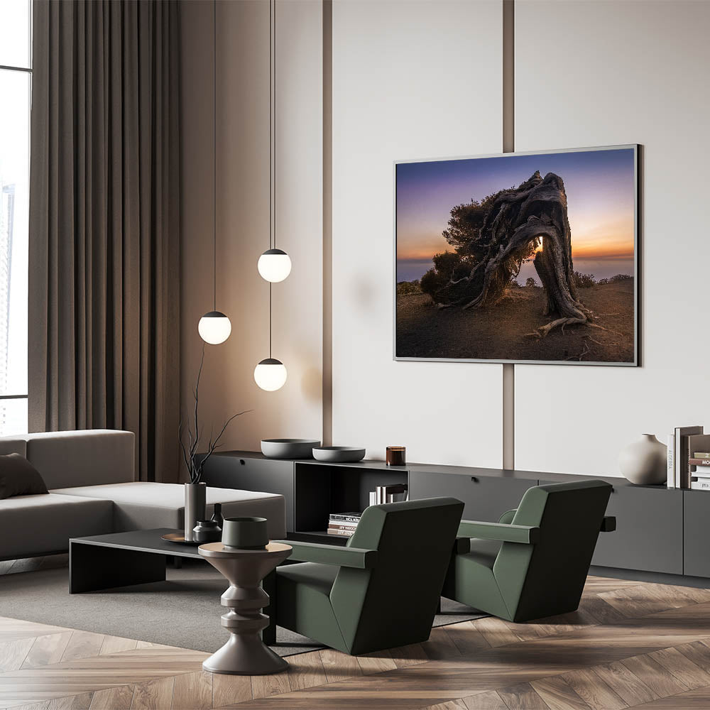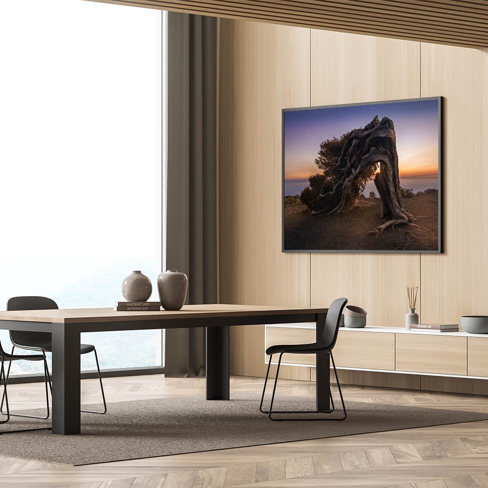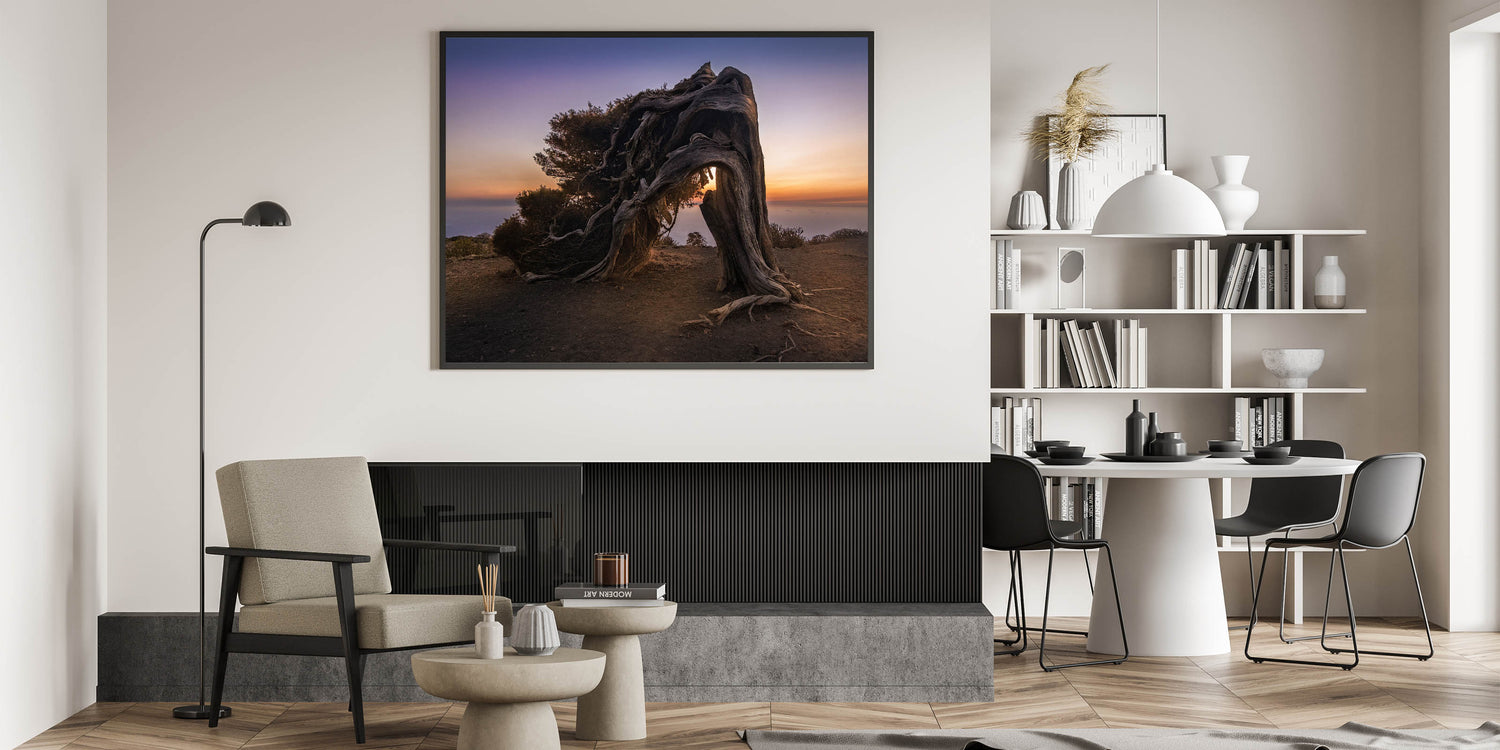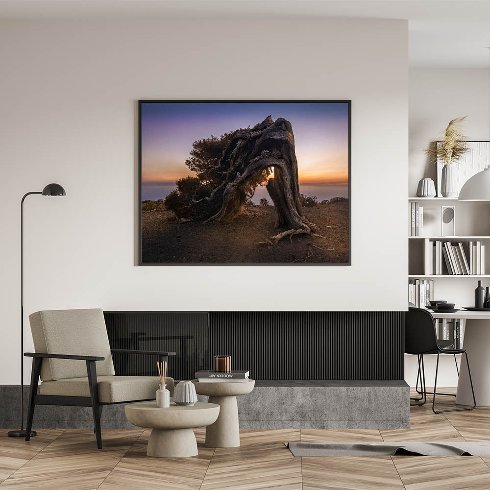 Capture the untamed beauty of the Canary Islands with this dramatic wall art featuring a twisted tree silhouetted against the vibrant hues of a setting sun. The ancient, weathered tree creates a mesmerizing focal point, while the sunset adds warmth and depth to the scene. This piece is perfect for nature lovers and those who appreciate unique landscapes with character and history. The art captures a moment of serenity and wonder, bringing the rugged beauty of the Canary Islands into your home.