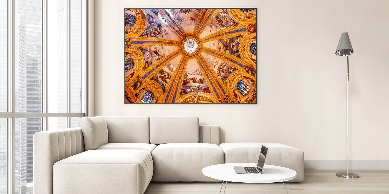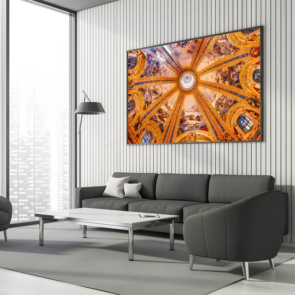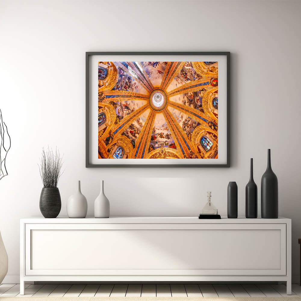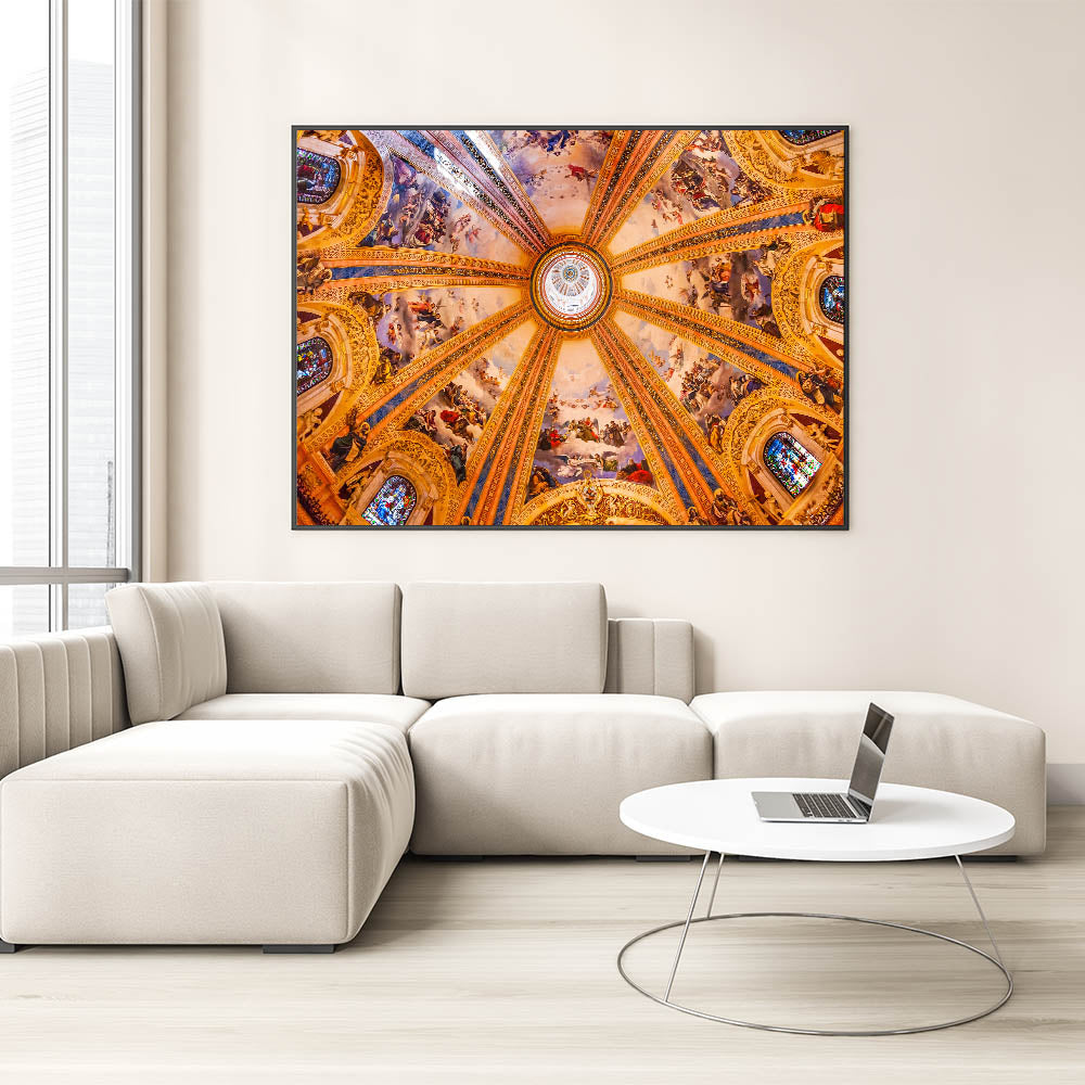 Elevate your space with this breathtaking view of an intricately detailed ceiling fresco from one of Madrid’s historic landmarks. The vivid colors, masterful artwork, and incredible attention to detail make this piece of Madrid wall decor a truly stunning focal point for any room. Whether you are looking to add an artistic flair to your living space or showcase a piece of Spain's rich artistic heritage, this wall art is sure to inspire.