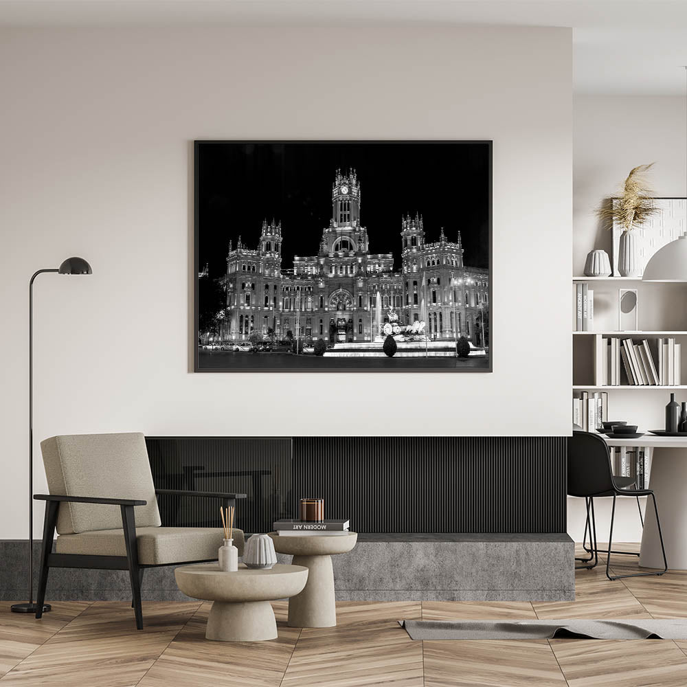 This breathtaking black-and-white wall art captures the majestic beauty of Madrid's Palacio de Cibeles at night. The intricate details of the architecture are highlighted under dramatic lighting, while the famous Cibeles Fountain adds a touch of elegance to the scene. This Madrid cityscape is perfect for adding a sophisticated, urban touch to your space.