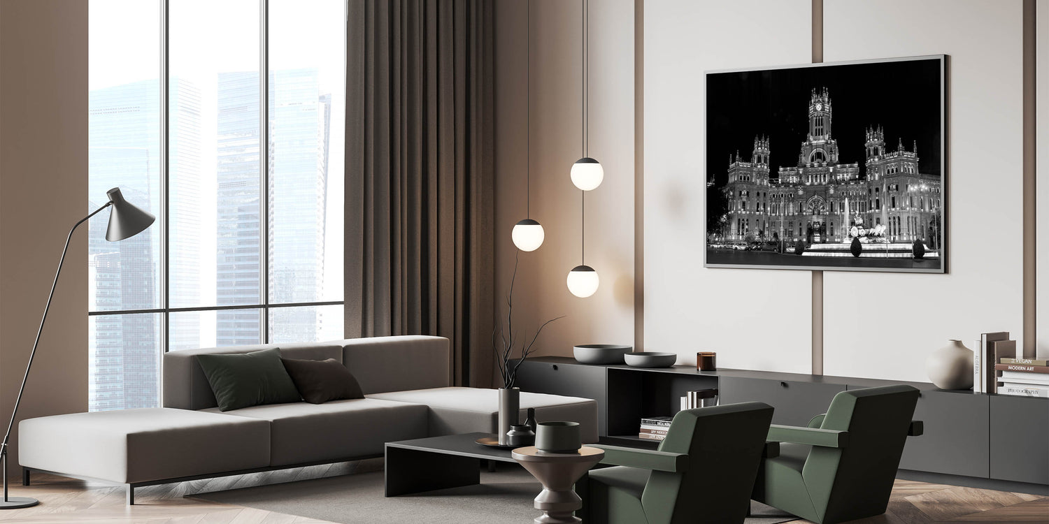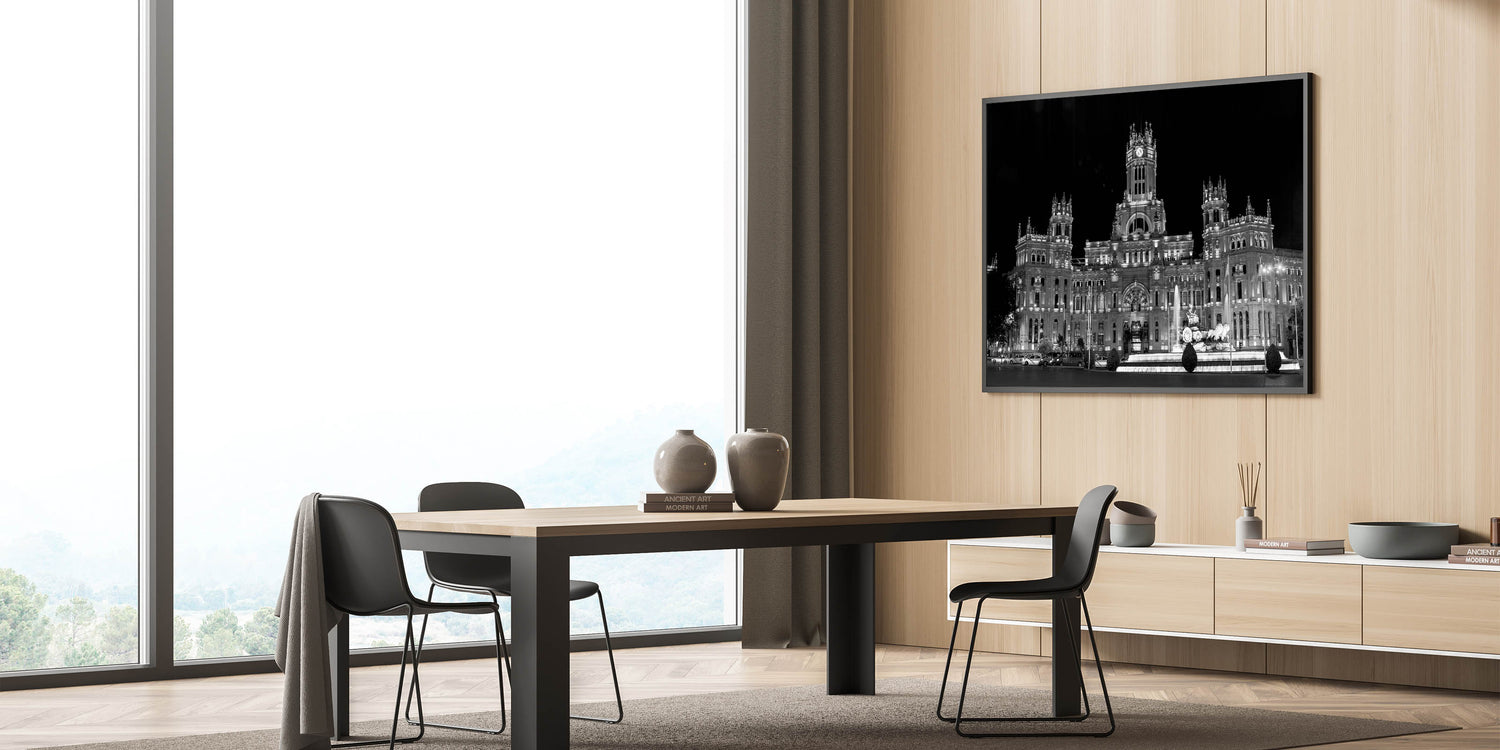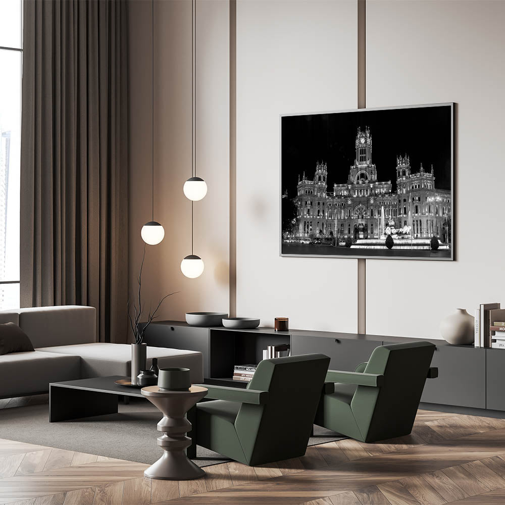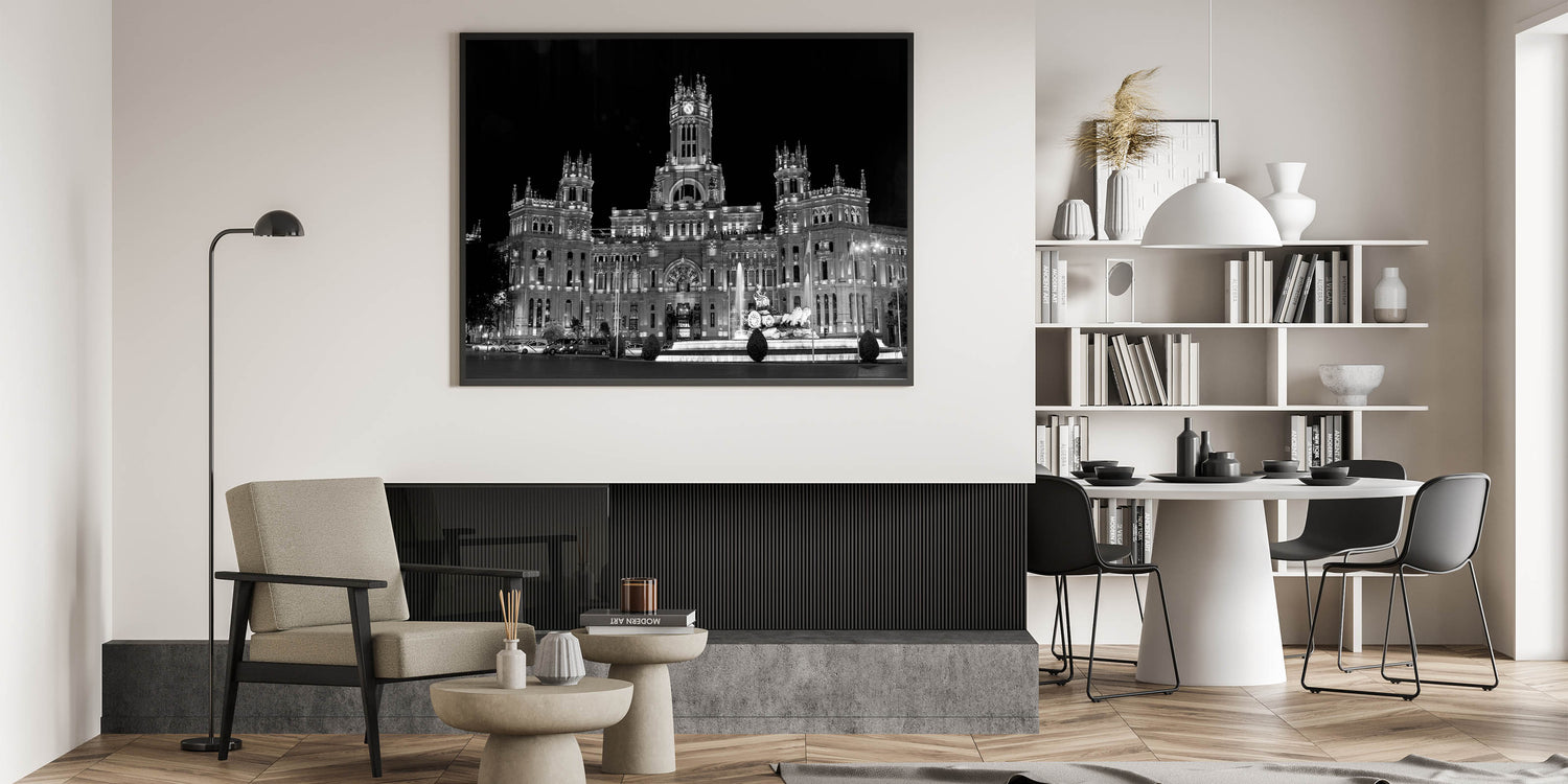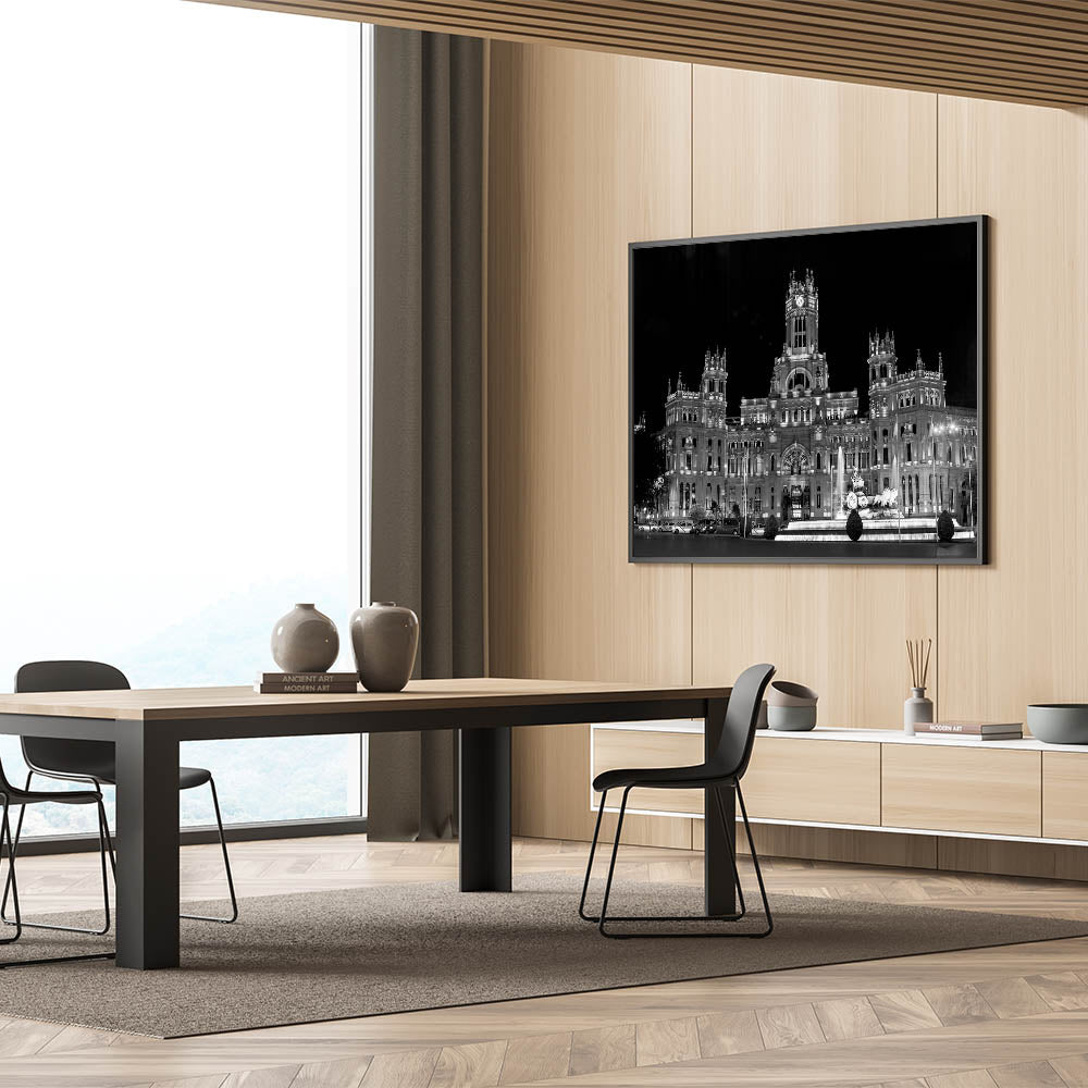 Bring the grandeur of Madrid’s architectural heritage into your living space with this striking piece of art. Its bold contrast and sharp details make it an unforgettable addition to any room. Choose from a range of formats to best suit your space, from sleek acrylic glass to classic framed prints.