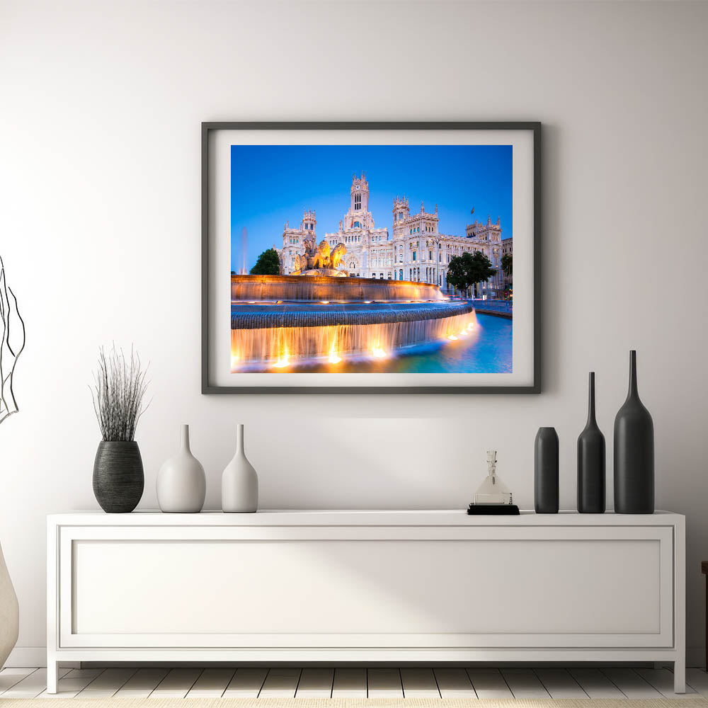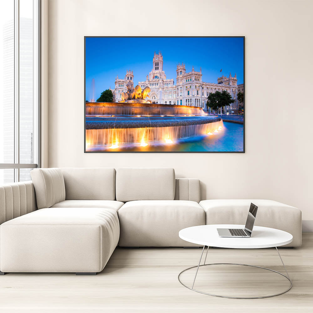 Bring the beauty of Madrid into your home with this stunning depiction of Plaza de Cibeles, featuring the iconic Cibeles Fountain and striking Spanish architecture. This Madrid wall art captures the vibrant glow of the fountain's lights against the deep blue evening sky, making it a breathtaking addition to any room.