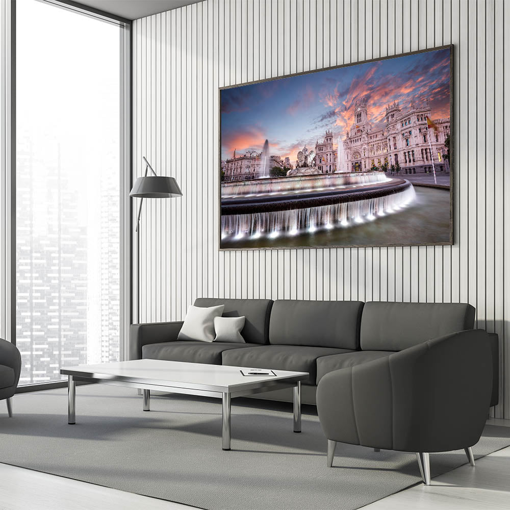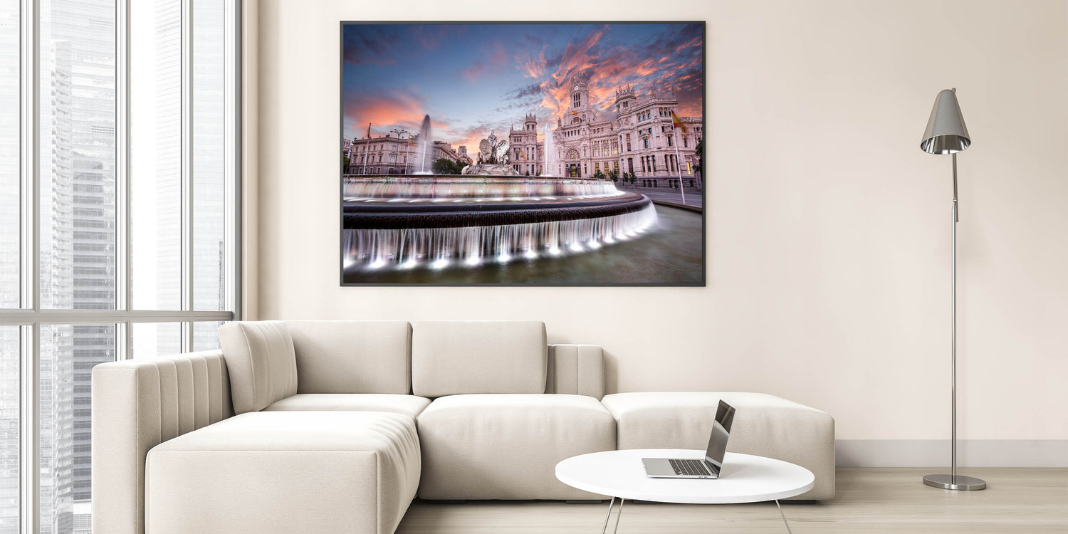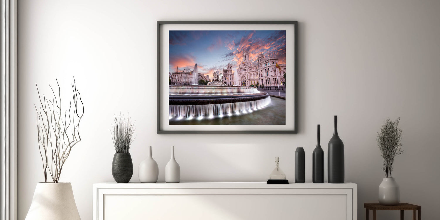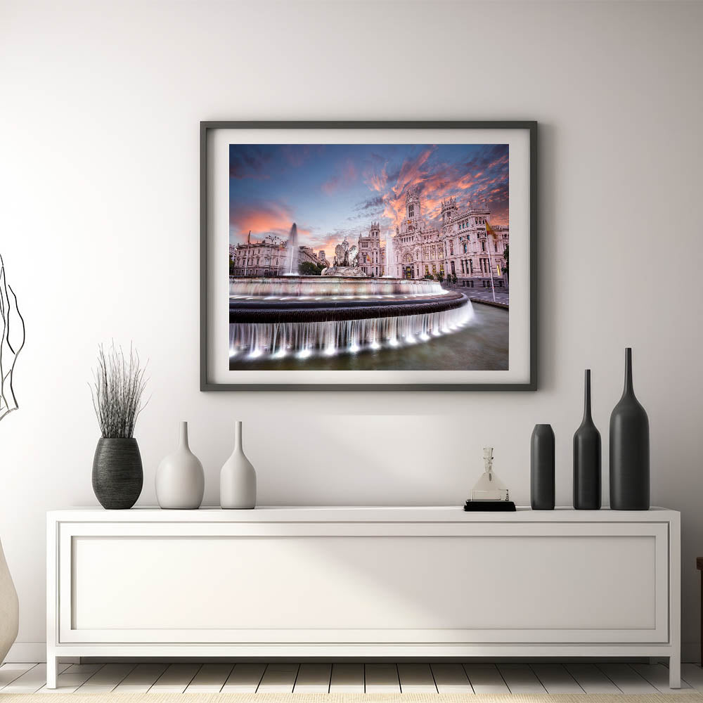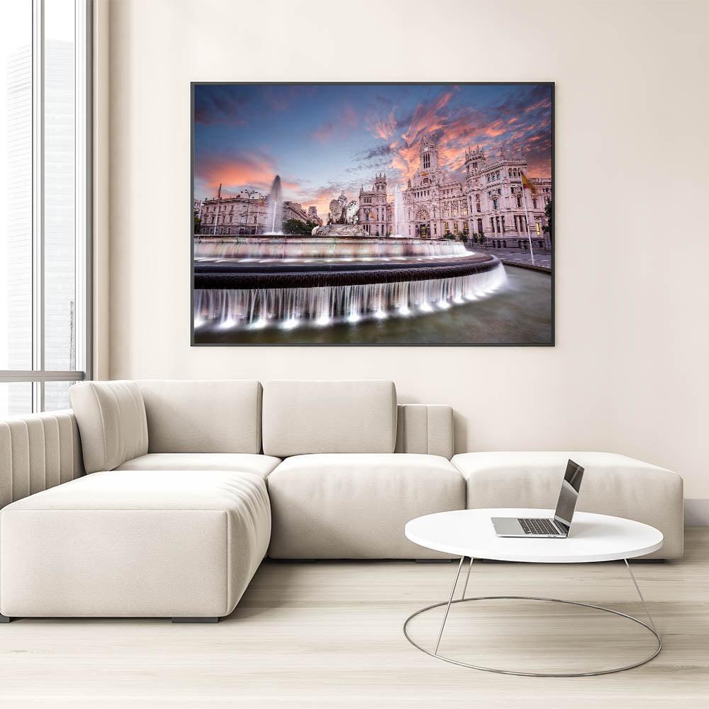 This stunning wall art captures the beauty of the famous Fuente de Cibeles and Palacio de Cibeles, set against a dramatic sunset sky. The rich colors and flowing water make this Madrid cityscape art a timeless addition to your home or office decor. Whether you're looking to add elegance to your living space or bring a touch of Madrid’s charm into your interior, this wall art is a perfect choice.