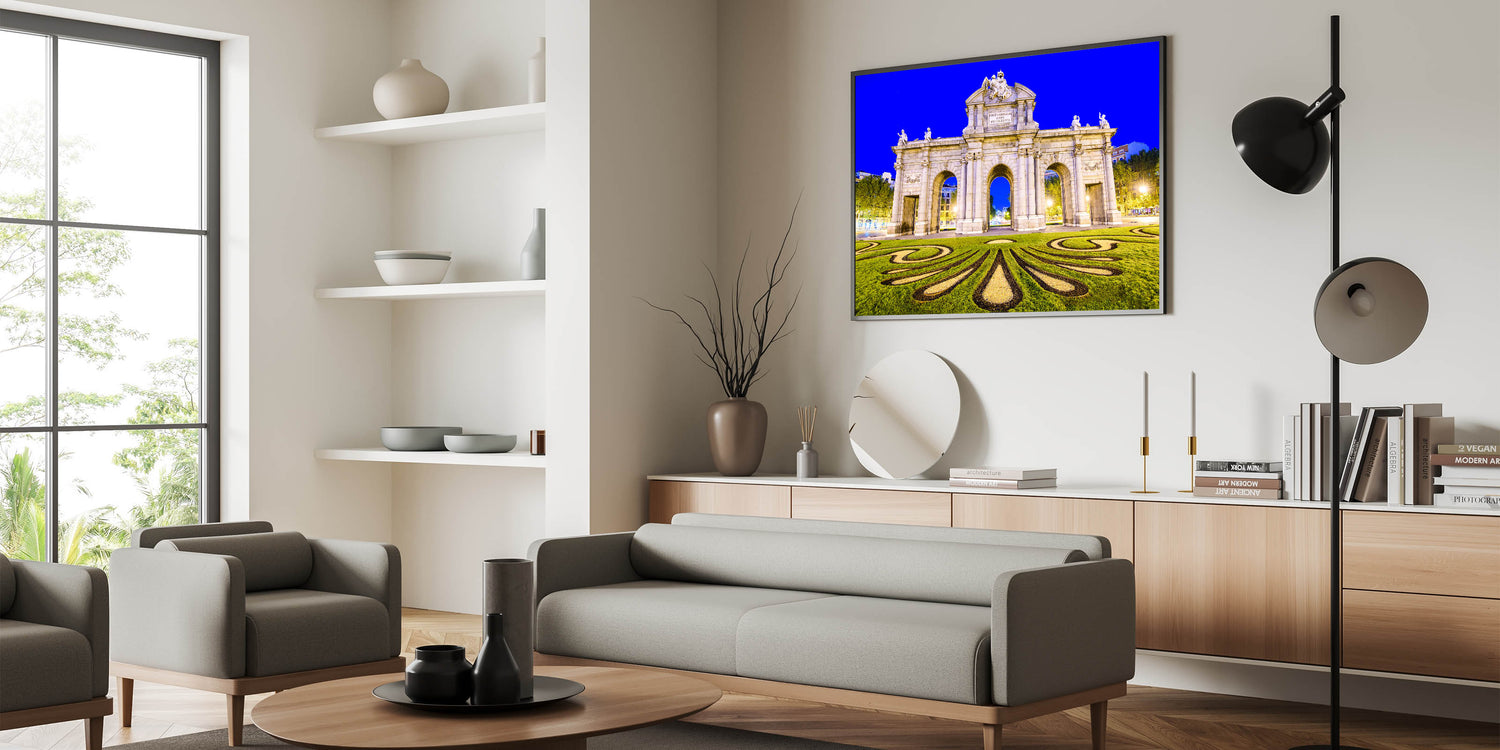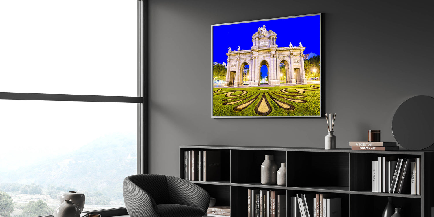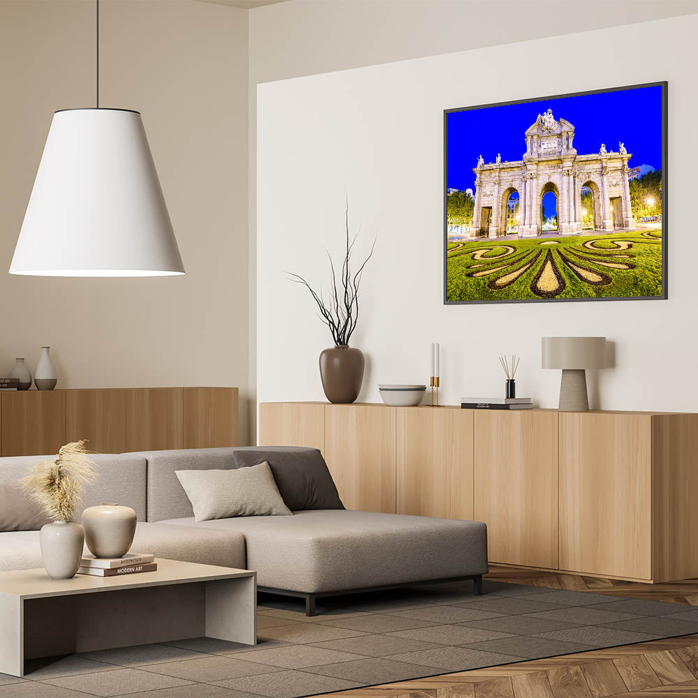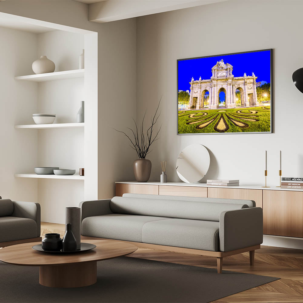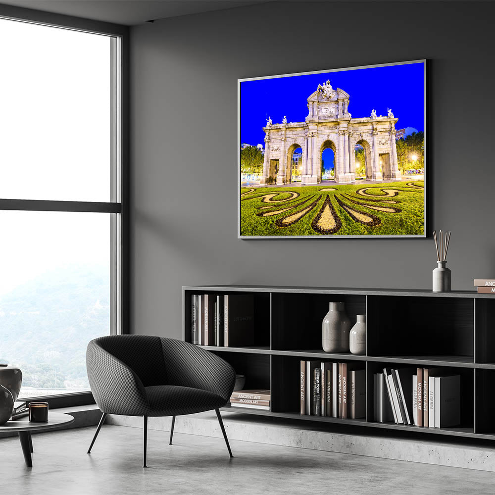 Celebrate the grandeur of Madrid with this stunning wall art featuring the famous Puerta de Alcalá at night. Illuminated against the deep blue sky, this iconic monument showcases its architectural beauty and rich history. This piece of Madrid wall decor captures the intricate details of the arch, along with the beautifully designed landscape in the foreground, making it an eye-catching addition to any room.