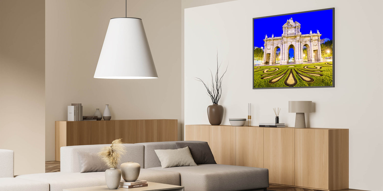This elegant Madrid skyline art is ideal for anyone looking to bring a piece of Spain’s architectural beauty into their home or office. The dramatic lighting and majestic arches of Puerta de Alcalá make this artwork a perfect choice to elevate any space. Add a touch of Madrid’s history and charm to your decor today.