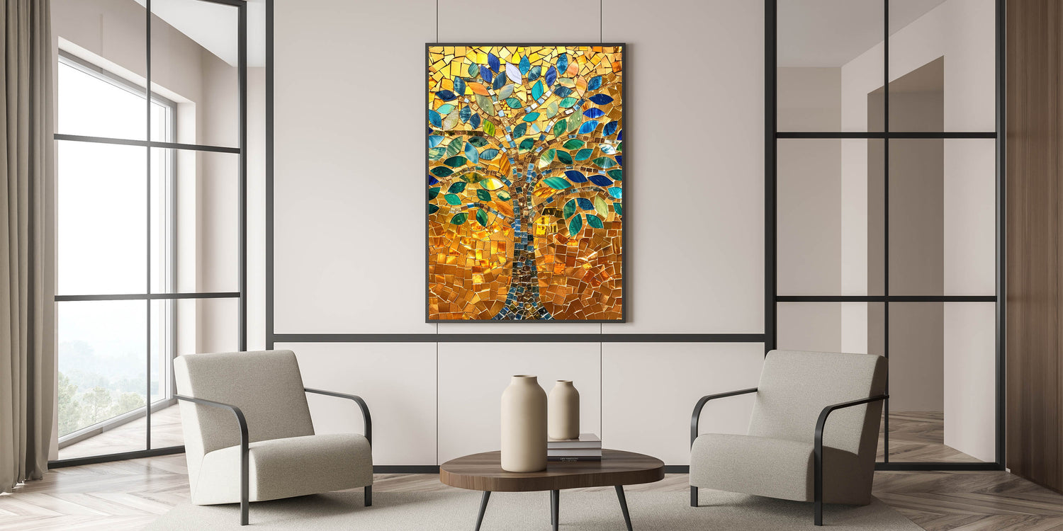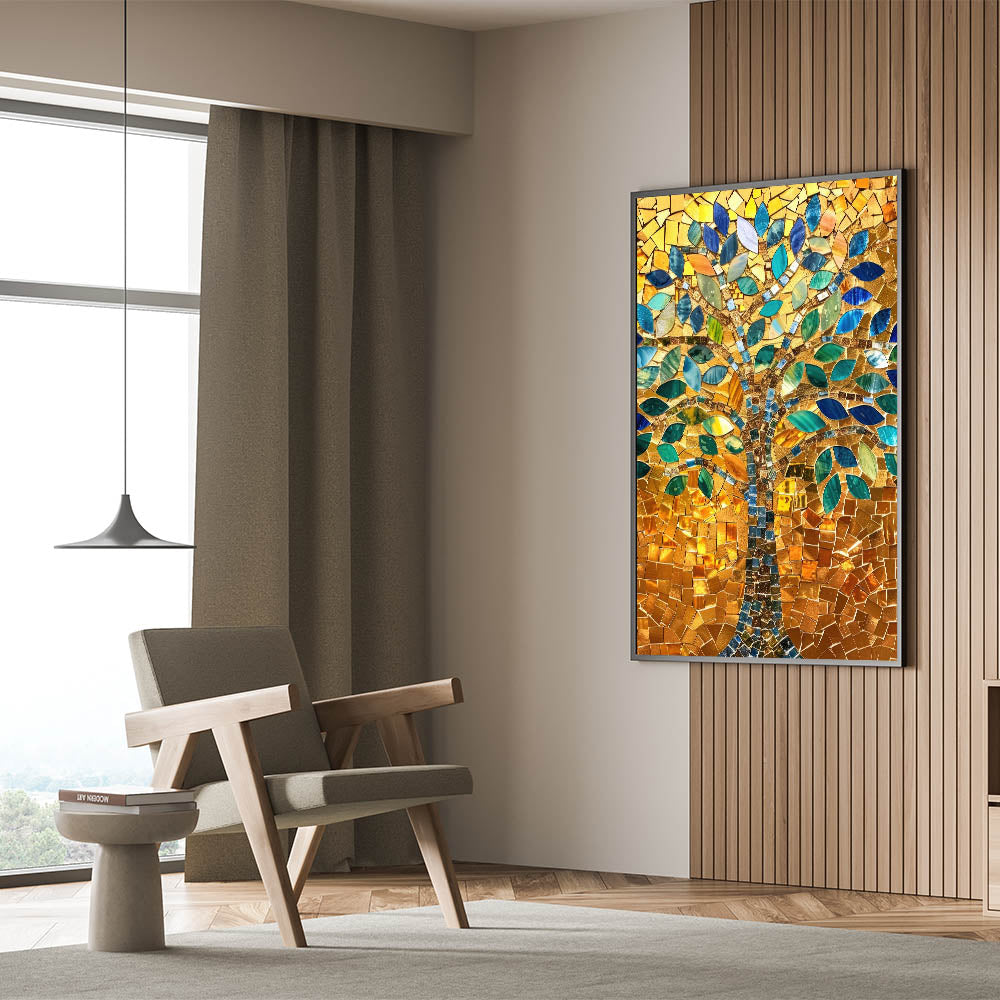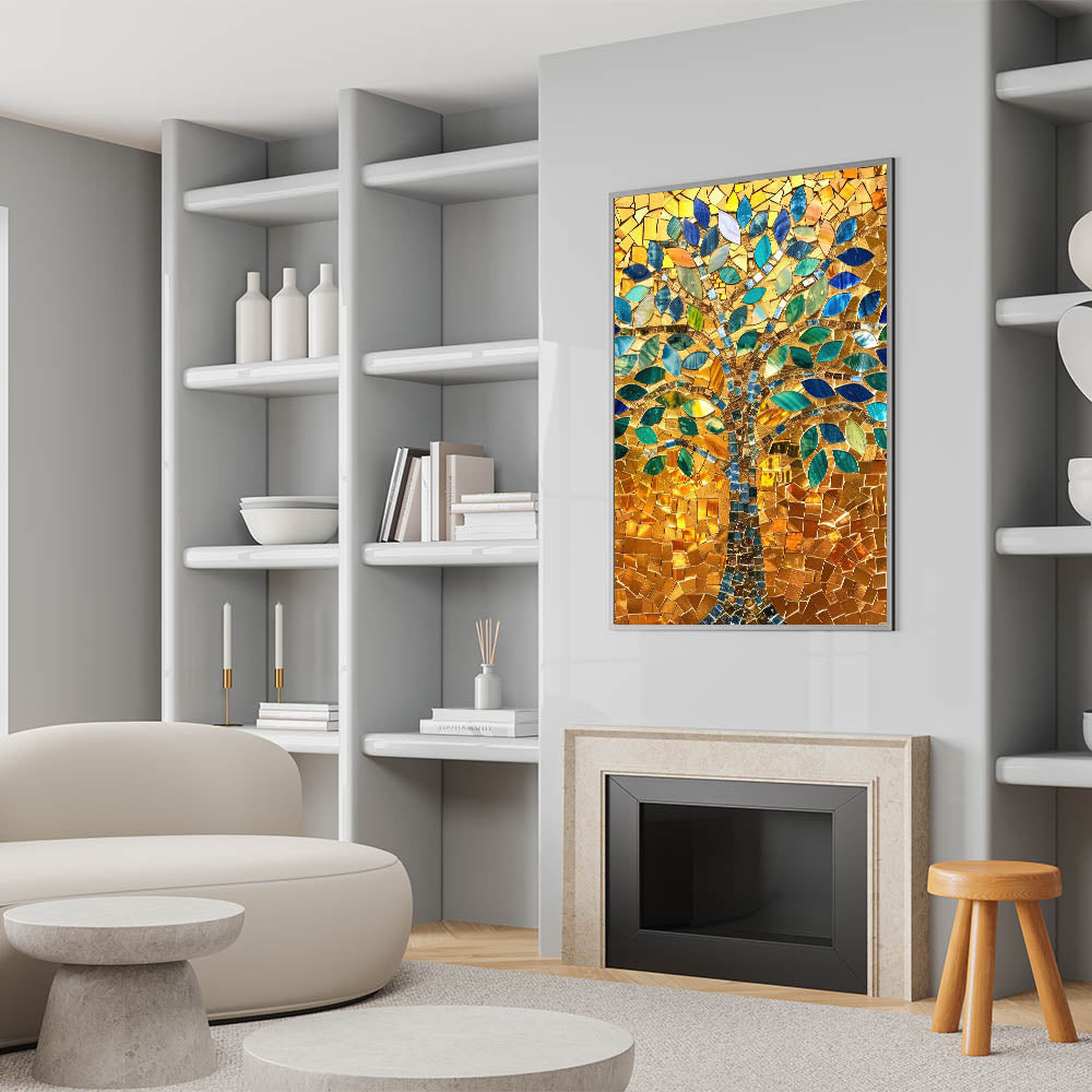 Add a burst of color to your decor with this Scenic Barcelona artwork, featuring a vibrant mosaic tree set against a golden background. The intricate mosaic design, with its bright leaves in shades of blue and green, contrasts beautifully with the shimmering gold tones, making this piece a stunning focal point for any room. This beautiful Barcelona wall decor is perfect for those who appreciate artistic craftsmanship and the city’s rich artistic heritage.